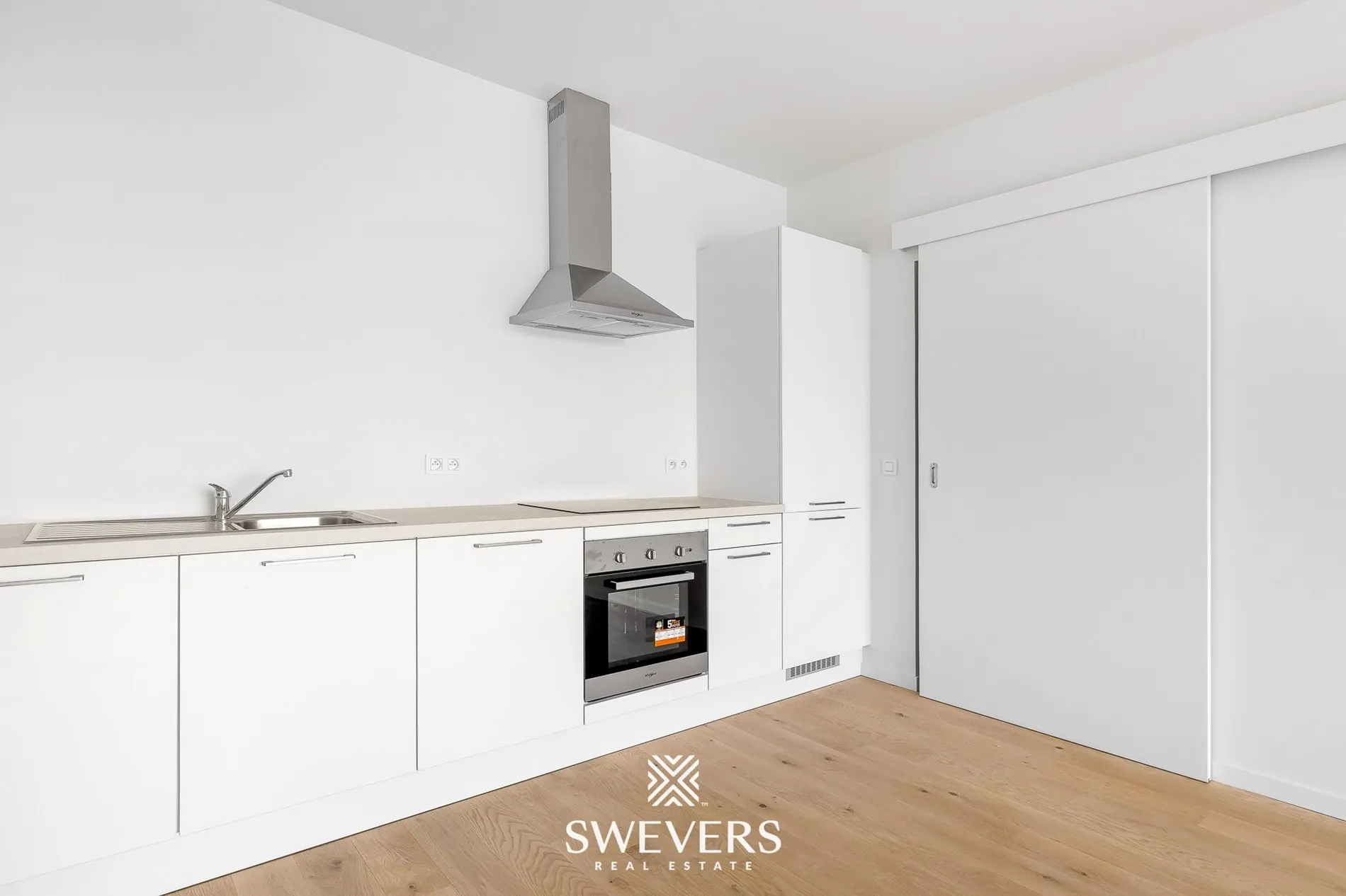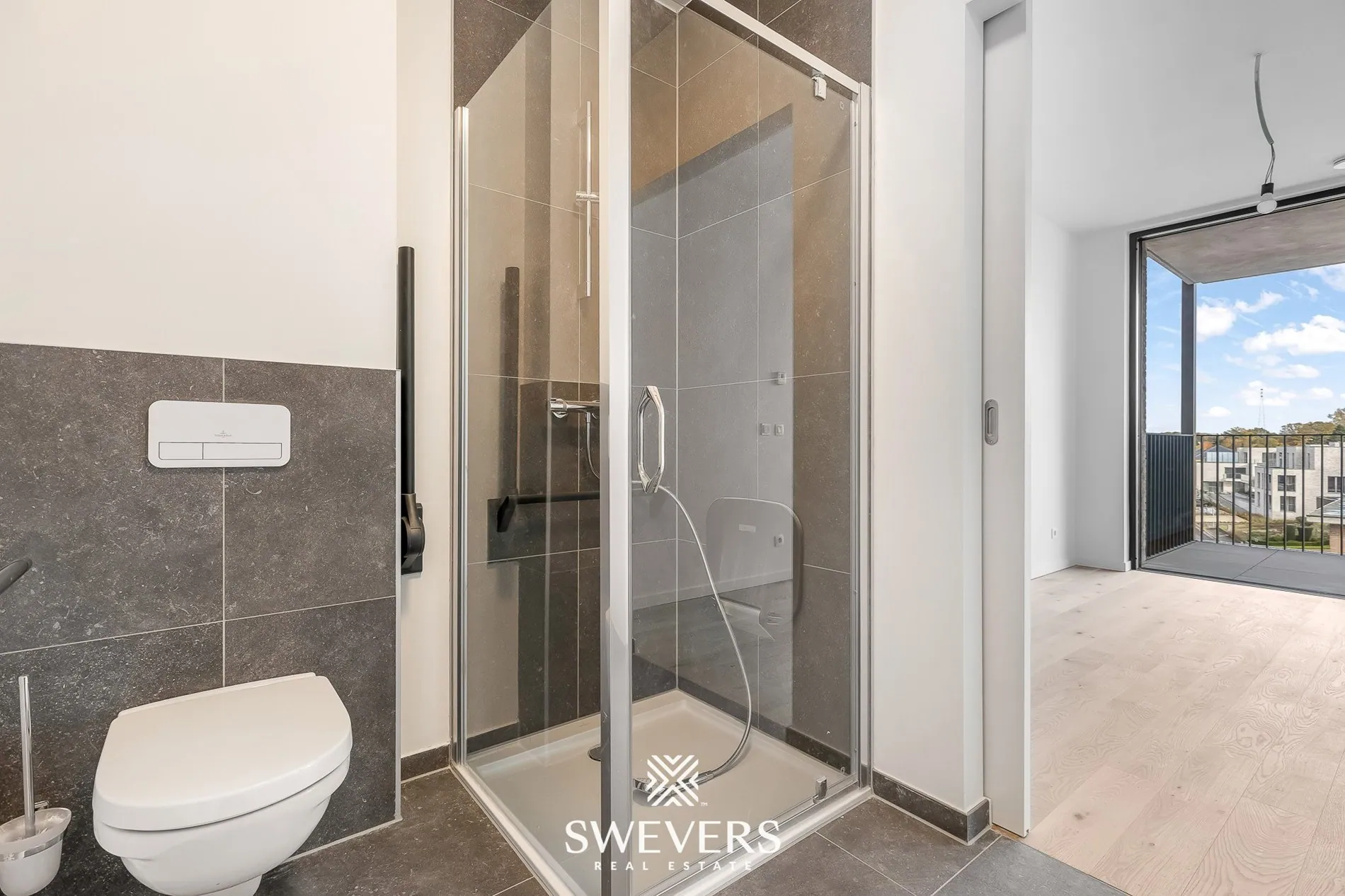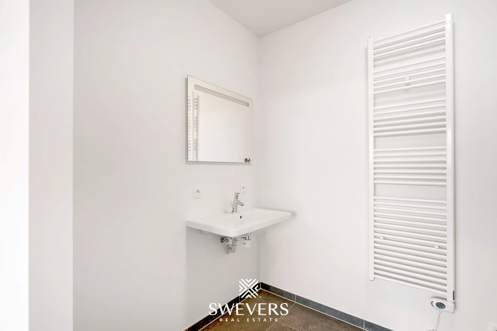 De lichtrijke leefruimte vormt samen met de volledig uitgeruste keuken een lichtrijk, open geheel van 29,5m² groot. Met een zalig terras van meer dan 11m² doe je daar ’s zomers nog eens een flink stuk bovenop. Handig om te weten is dat je op dezelde verdieping nog een privé berging krijgt, hetgeen zeer handig is om grote voorraad of andere materialen te stockeren.