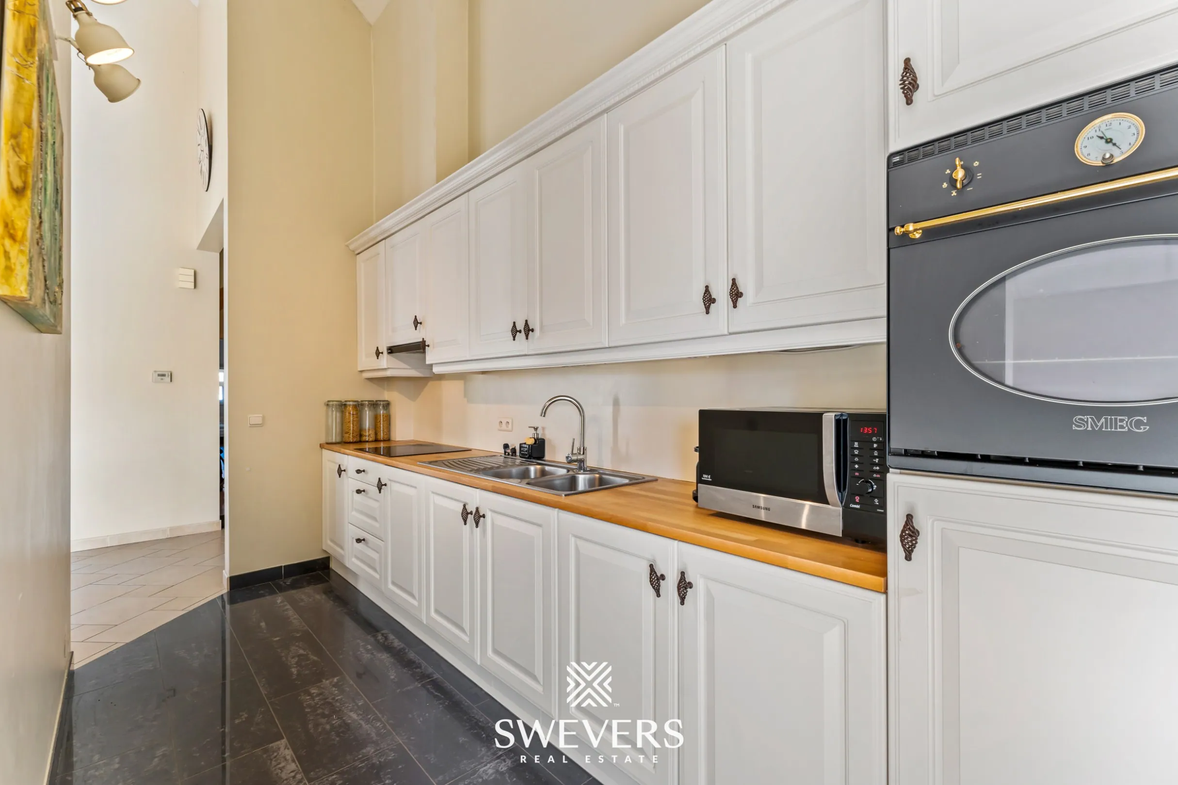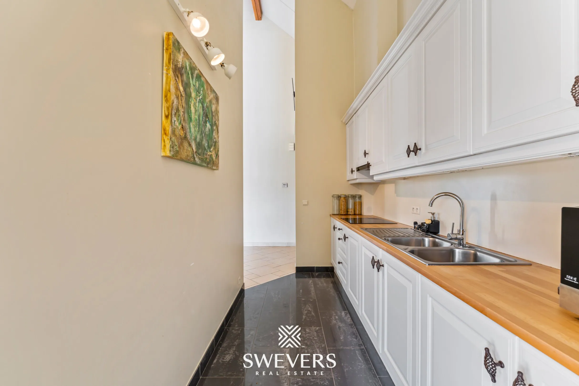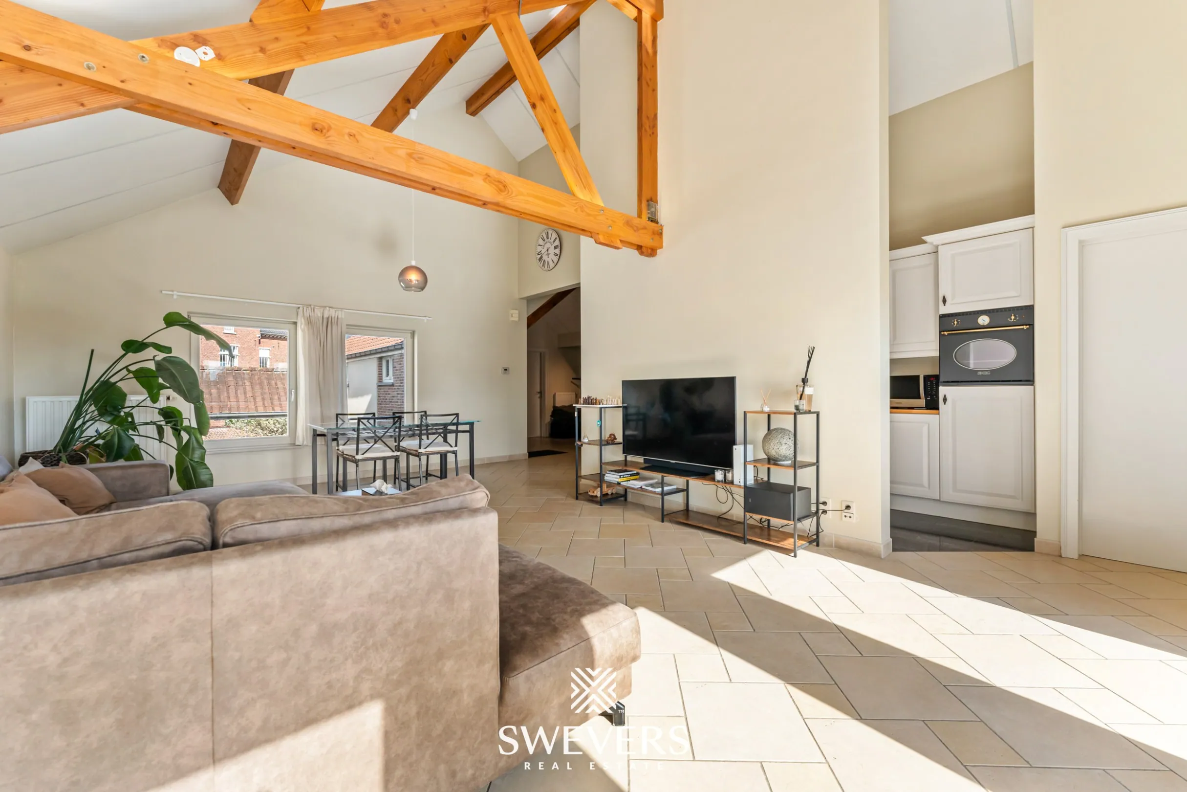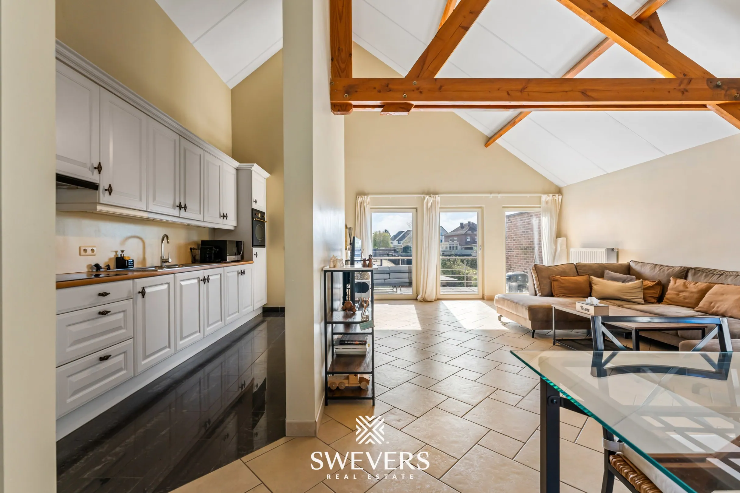 Aansluitend bevindt zich de keuken van 8 m². Deze is praktisch ingericht en biedt voldoende werk- en opbergruimte. De keuken staat in directe verbinding met de leefruimte, wat zorgt voor een vlotte circulatie en een aangename interactie tijdens het koken.