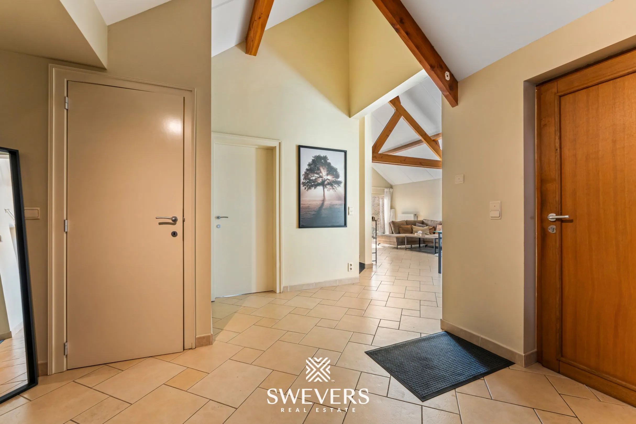 Bij het betreden van het appartement komt men in de inkomhal die toegang biedt tot de verschillende leefruimtes. De leefruimte van 32 m² vormt het centrale punt en biedt voldoende plaats voor een zit- en eethoek. Grote raampartijen zorgen voor een aangename lichtinval en creëren een open gevoel.