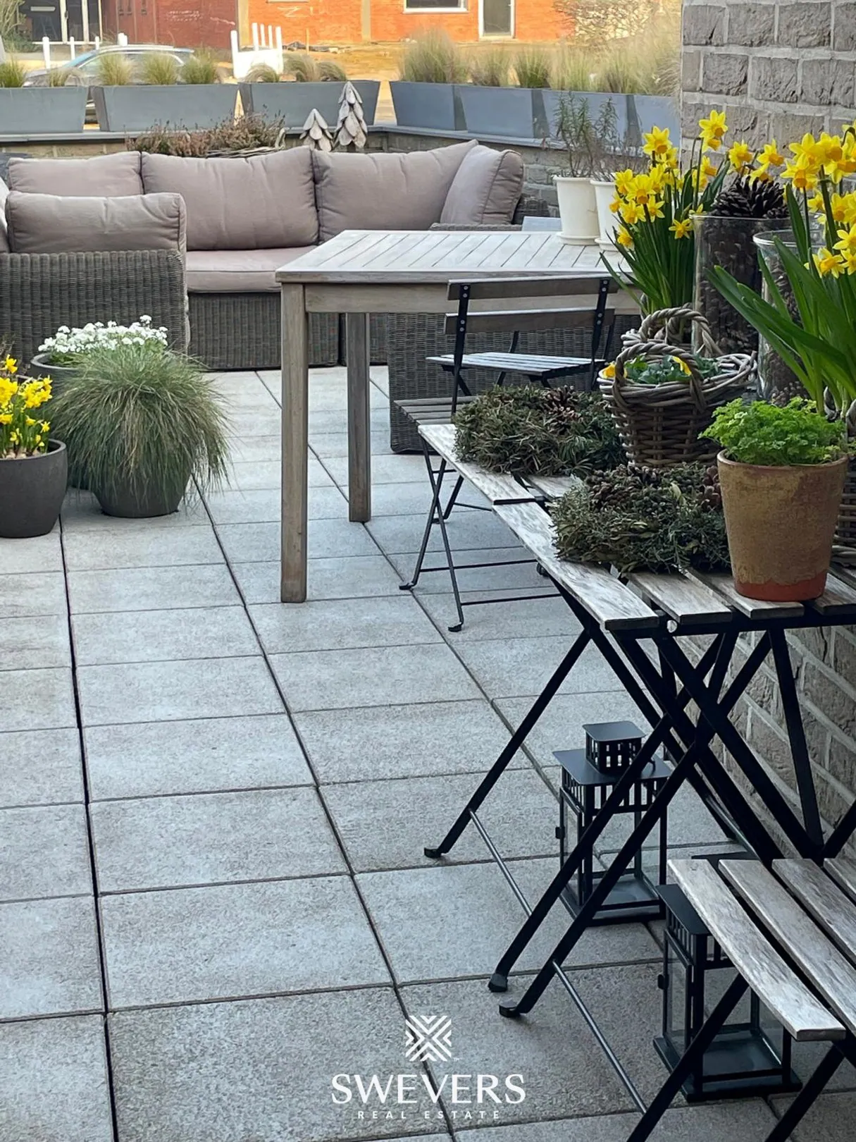 Grenzend aan de leefruimte ligt een westgericht terras van ruim 20m² dat veel privacy biedt. Hier is het heerlijk vertoeven in de avondzon, met een glas wijn of een goed boek. Het uitzicht is rustig en de inkijk beperkt, wat het terras een intiem verlengstuk maakt van het binnenleven. Op zomerse dagen wordt dit de plek waar het buitenleven vanzelfsprekend aanvoelt.