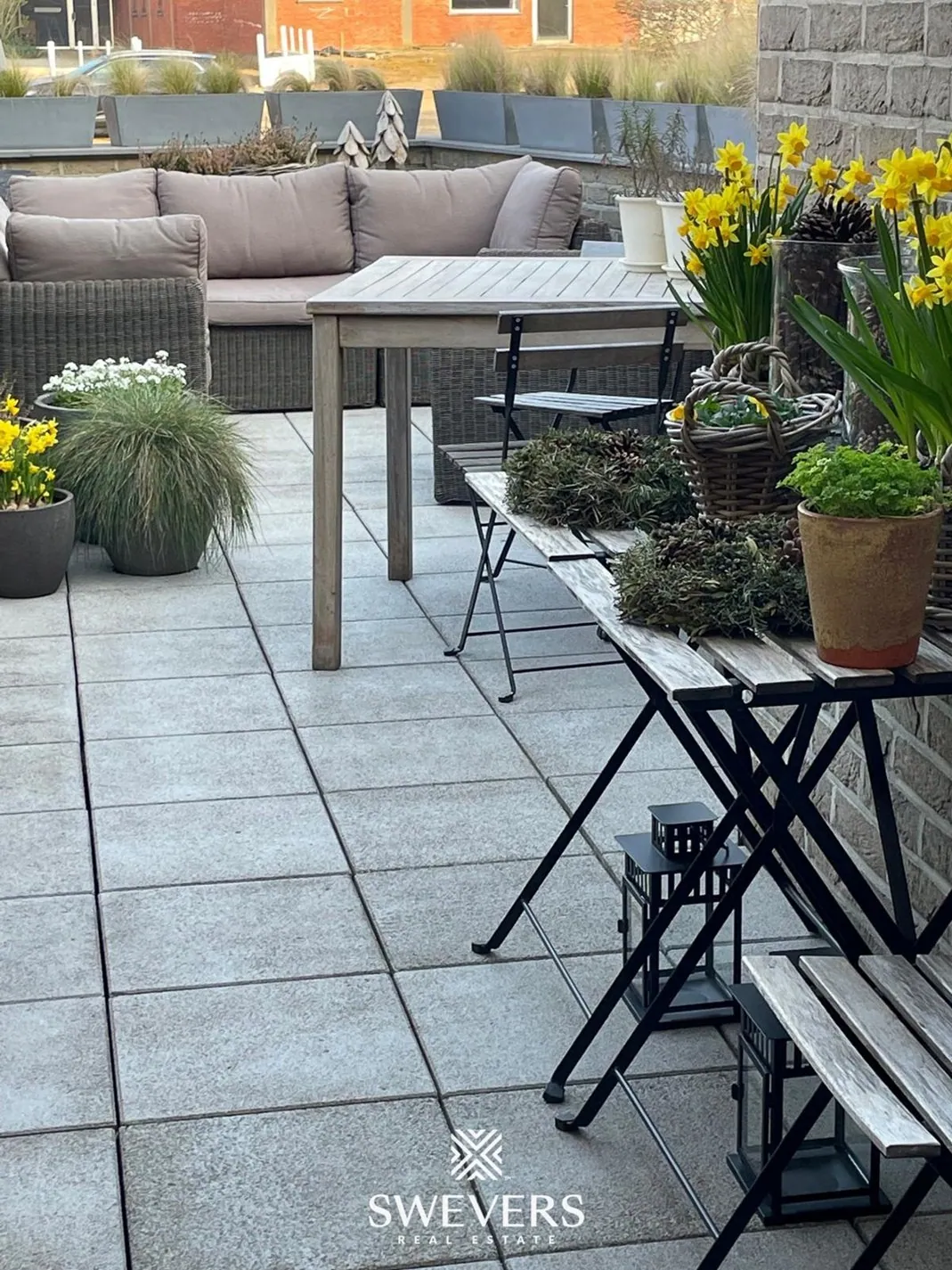 Grenzend aan de leefruimte ligt een westgericht terras van ruim 20m² dat veel privacy biedt. Hier is het heerlijk vertoeven in de avondzon, met een glas wijn of een goed boek. Het uitzicht is rustig en de inkijk beperkt, wat het terras een intiem verlengstuk maakt van het binnenleven. Op zomerse dagen wordt dit de plek waar het buitenleven vanzelfsprekend aanvoelt.