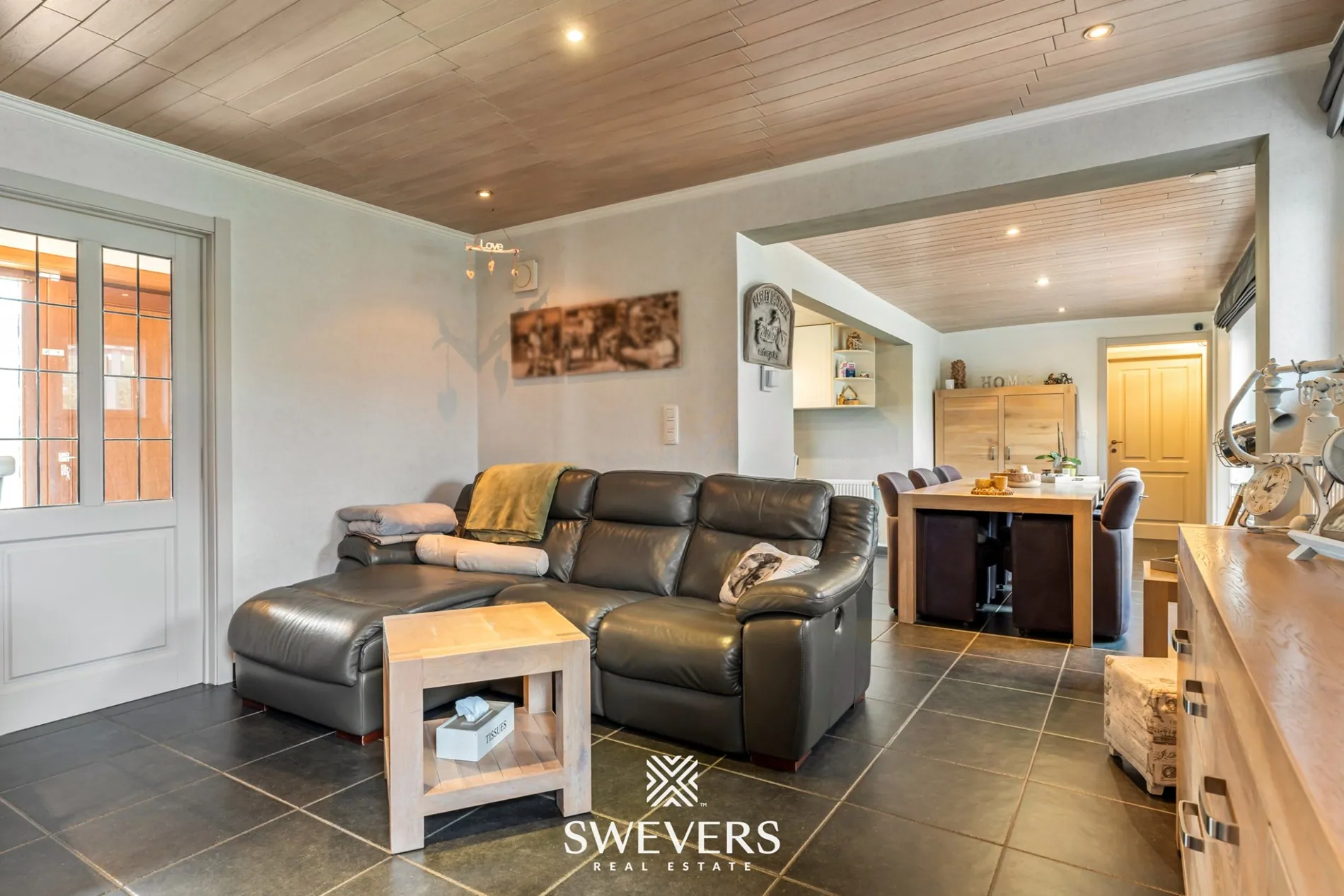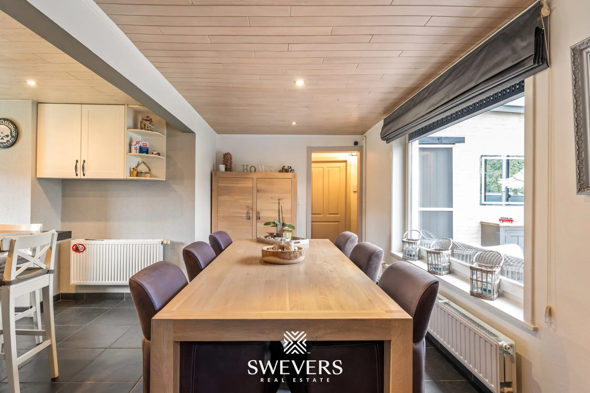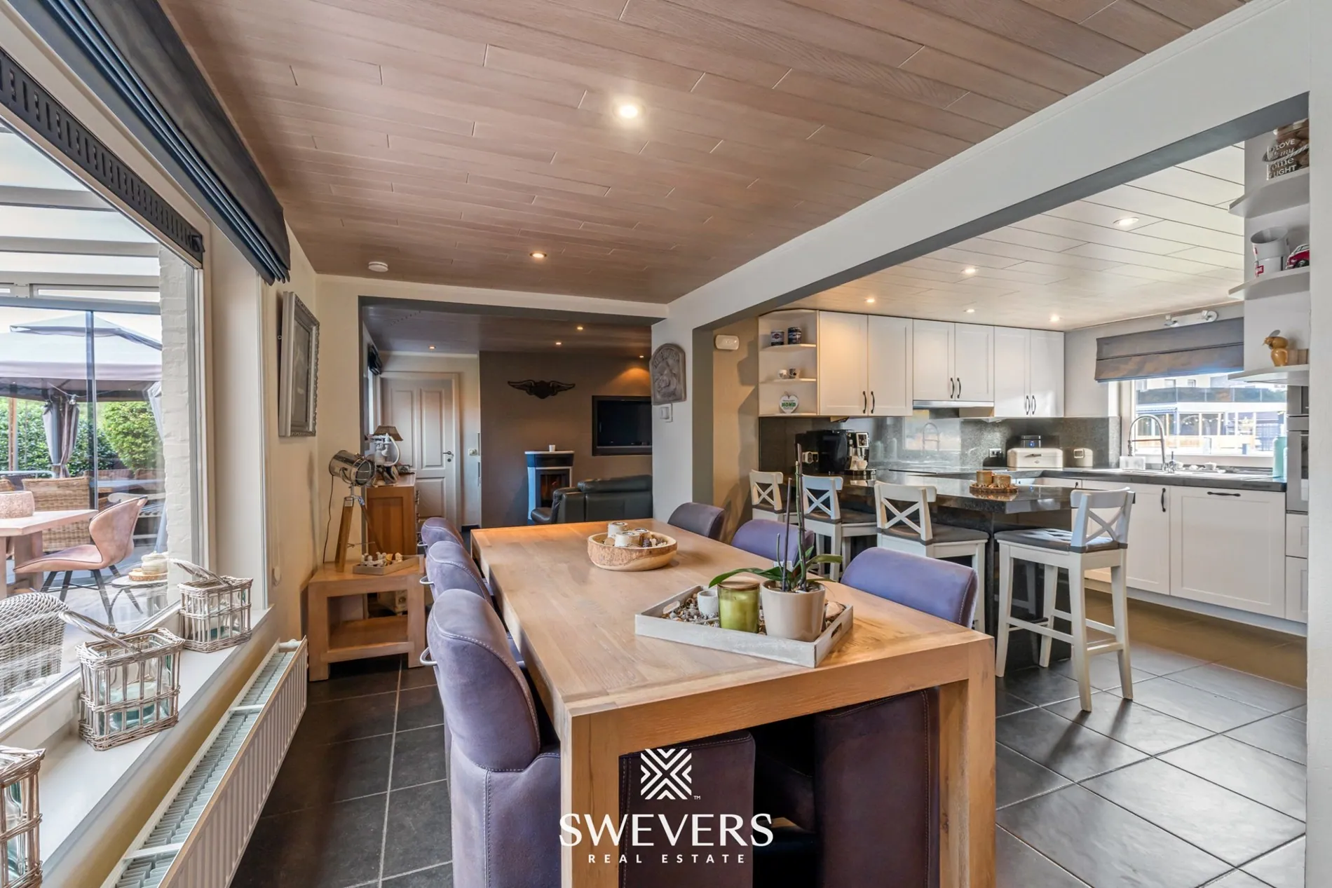 De leefruimte van 35,67 m² is centraal gelegen en vormt het hart van de woning. De open en rechthoekige indeling zorgt voor een vlotte inrichting met natuurlijke lichtinval via de grote ramen aan de verandazijde. Deze ruimte sluit naadloos aan op de keuken van 7,05 m², die compact maar efficiënt werd ingericht.