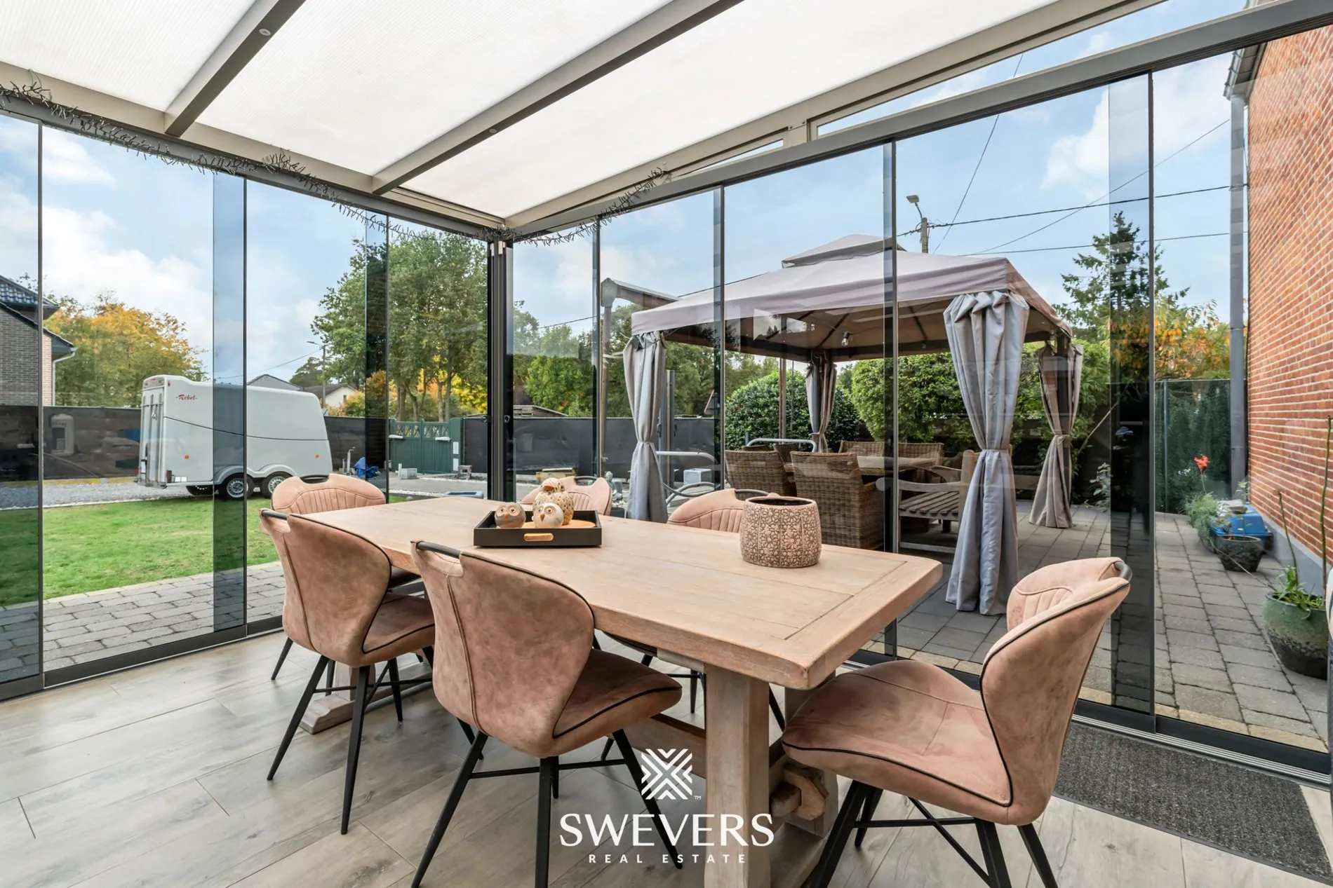 Achteraan is er een ruime veranda van 31,22 m² die fungeert als extra leefruimte. De grote glaspartijen brengen het buitengevoel naar binnen en geven rechtstreeks uit op de westelijk georiënteerde tuin van 383 m². Deze tuin biedt in de namiddag en avond volop zonlicht, wat ideaal is voor ontspanning of het organiseren van een barbecue in de zomermaanden.