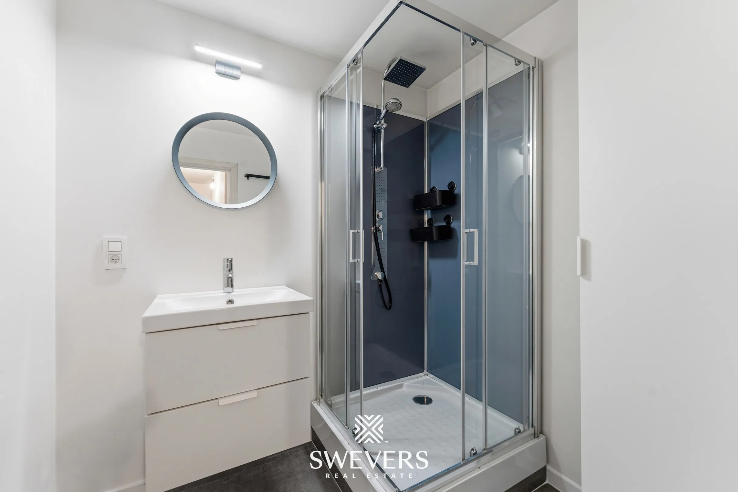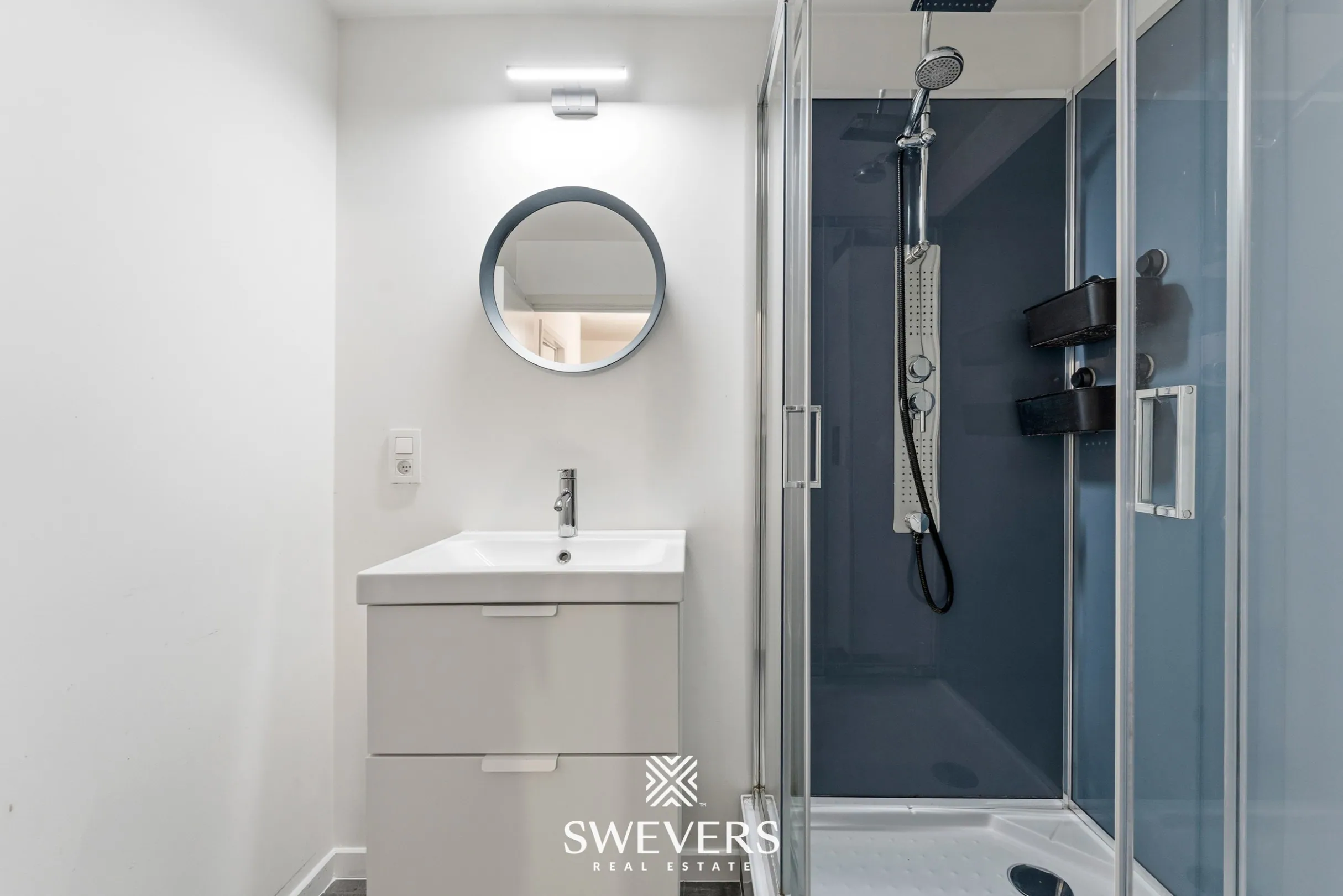 De ruime slaapkamer van 15,5 m² biedt plaats voor een comfortabel bed en voldoende kastruimte. Het is een rustige plek waar je elke avond tot rust komt. De badkamer, vernieuwd in 2020, is functioneel en stijlvol ingericht. Daarnaast is er een apart gastentoilet en bergruimte, een extra troef die het dagelijkse comfort verhoogt.