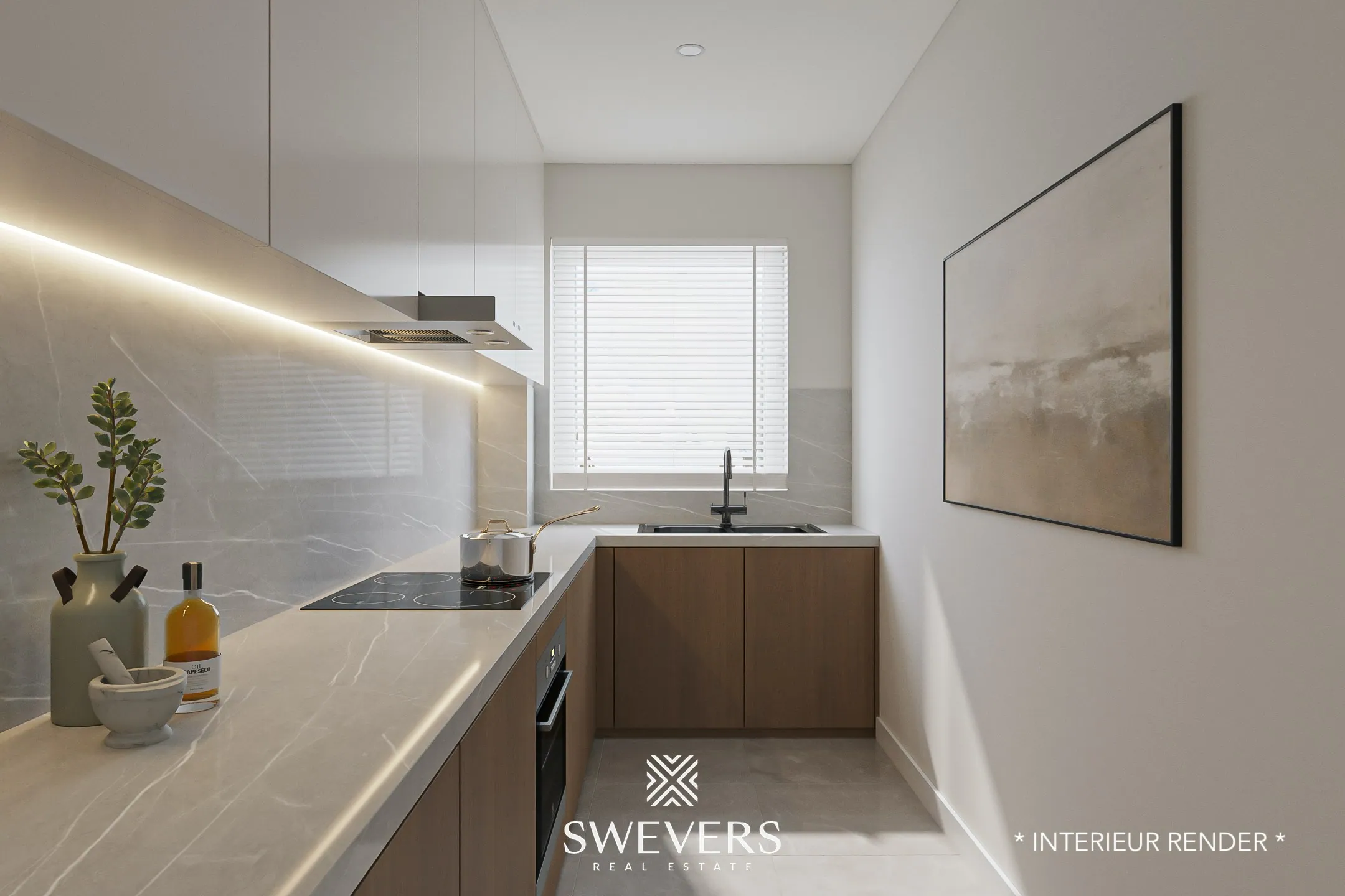 De woonkamer van 27 m² vormt het hart van het appartement. Grote ramen laten overvloedig daglicht binnen en creëren een open, uitnodigende sfeer. Aansluitend bevindt zich de keuken van 6,3 m² – praktisch ingericht en perfect voor wie houdt van efficiënt koken.