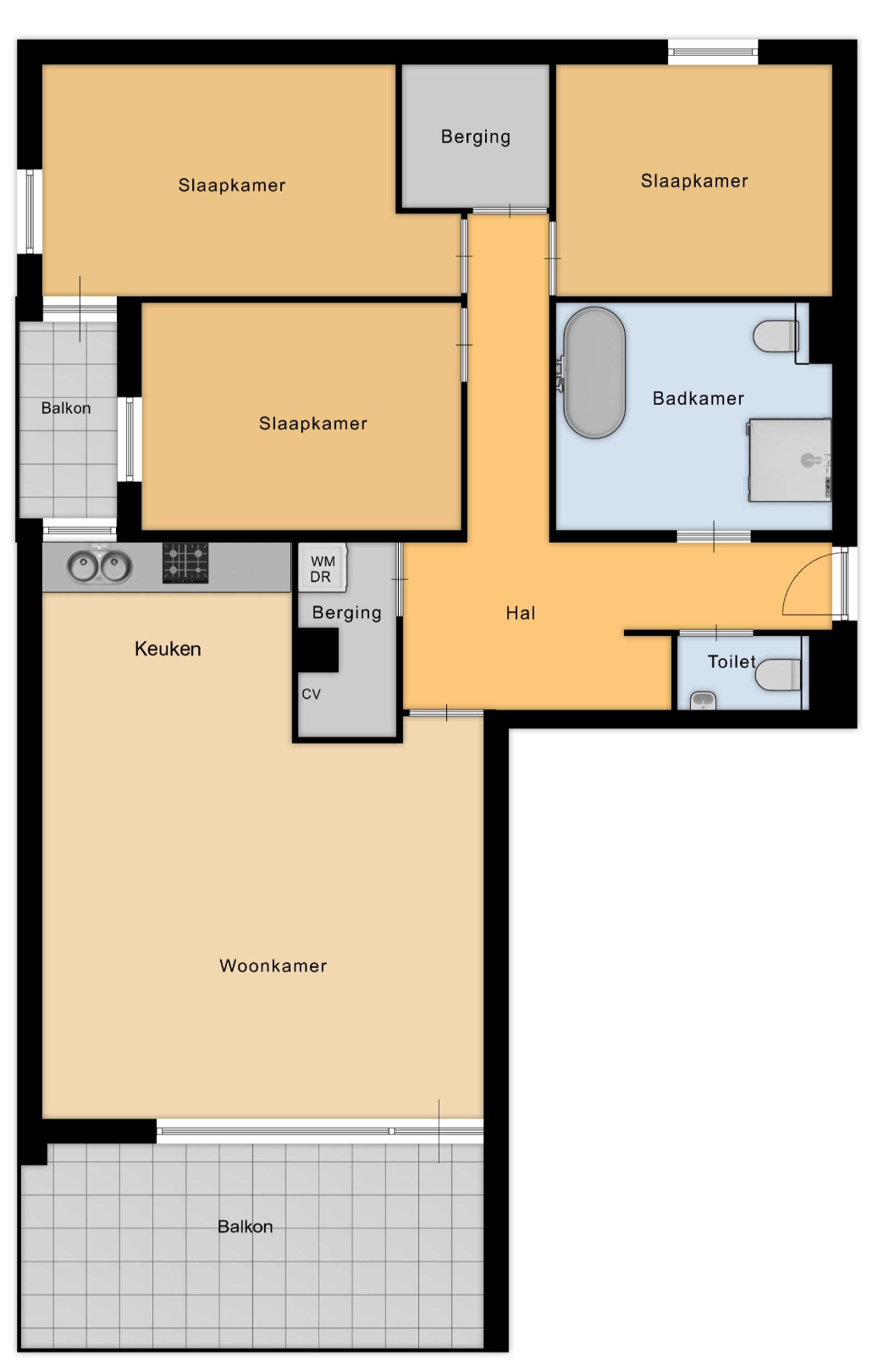 Het appartement beschikt over drie volwaardige slaapkamers van respectievelijk 14,5 m², 9,5 m² en 8,5 m². Elke kamer kan flexibel worden ingericht als slaapkamer, bureau of hobbyruimte. De rolluiken in de slaapkamers zorgen voor extra privacy en comfort, en dragen bij aan een aangename nachtrust.