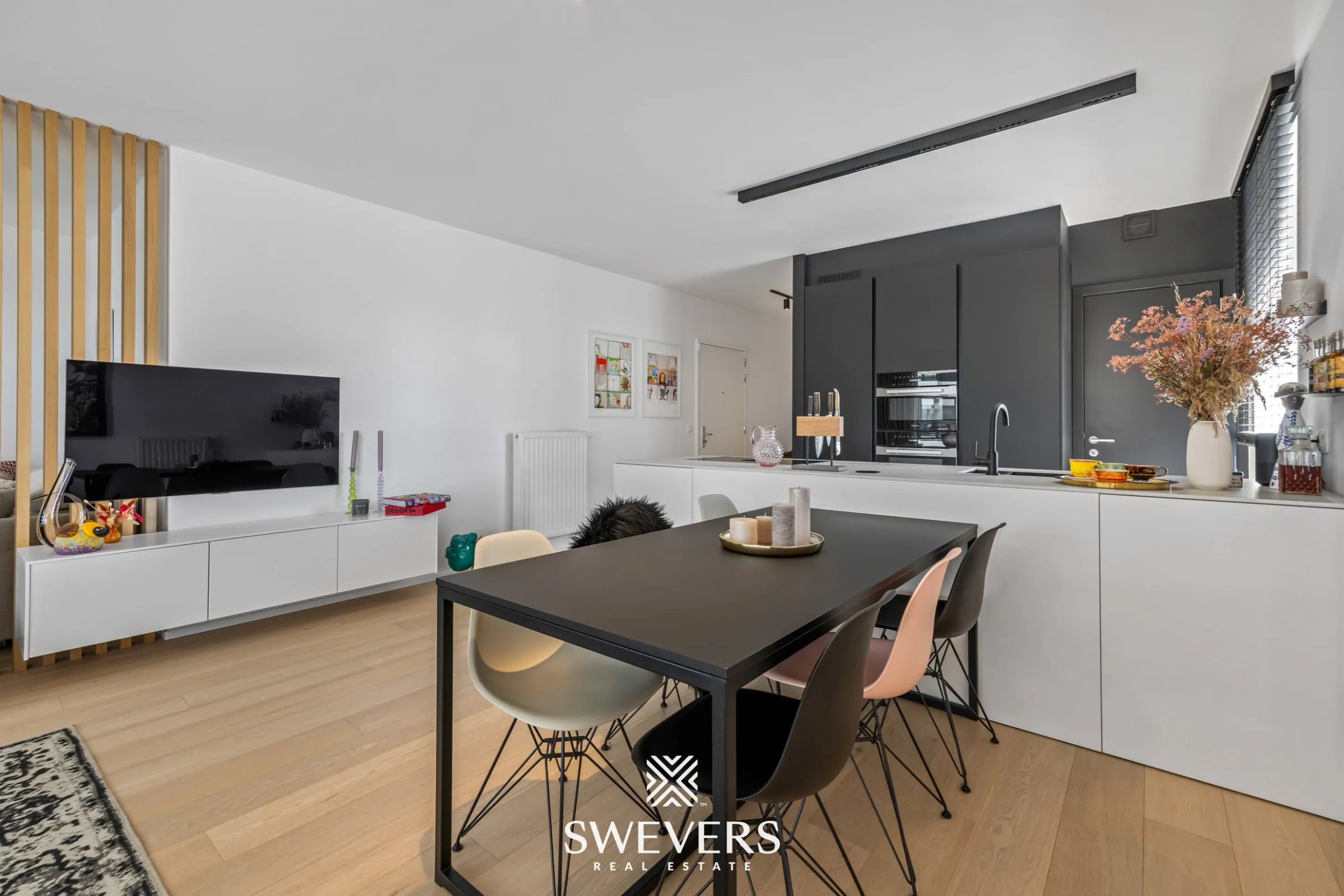centrale punt. Daarnaast is er een aparte hoek voorzien in de leefruimte, ideaal als bureauruimte of met de mogelijkheid om een tweede slaapkamer te creëren. Grote raampartijen zorgen voor een open gevoel en een directe connectie met het terras. Hier zal je dagelijks genieten van het zicht op het kanaal.