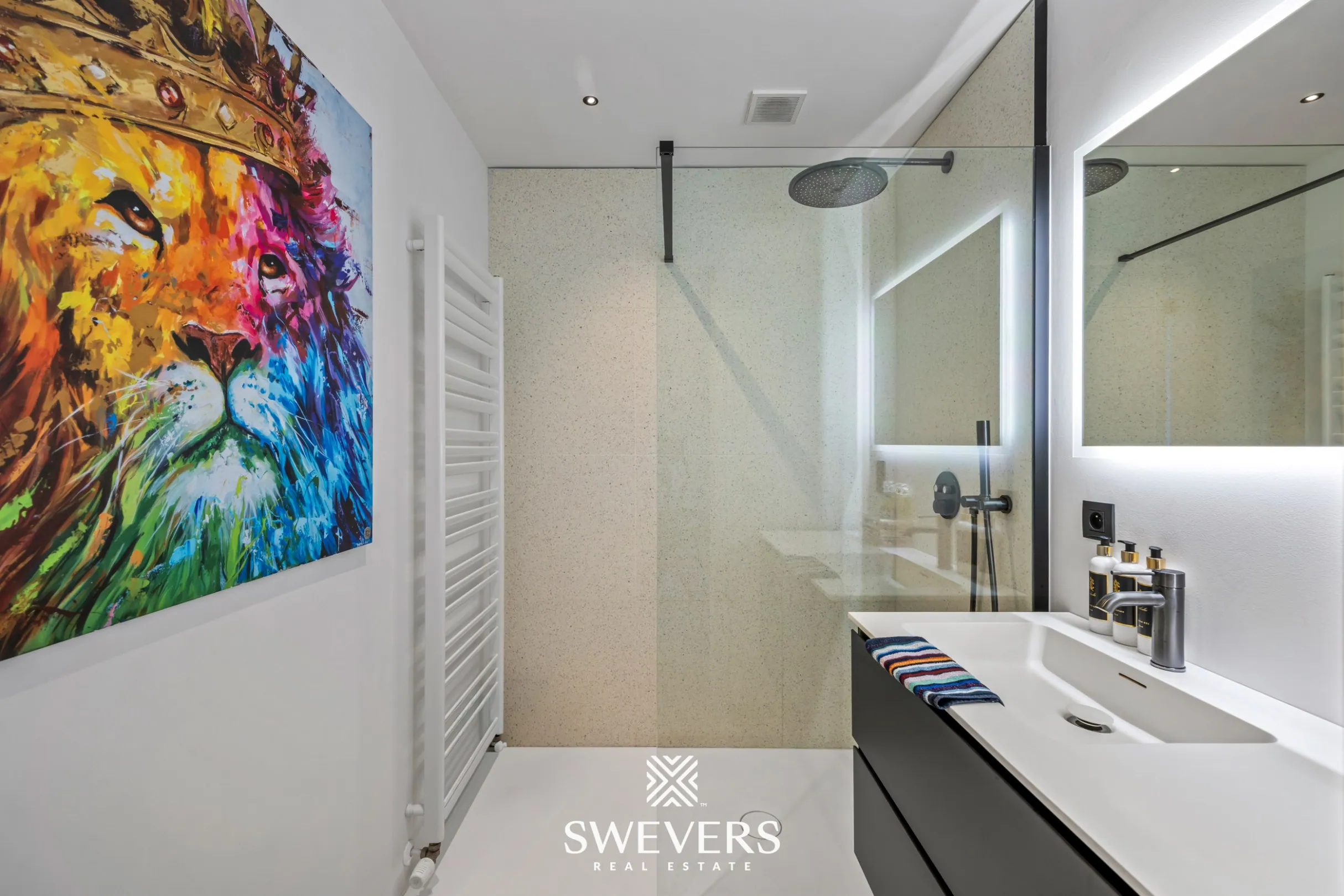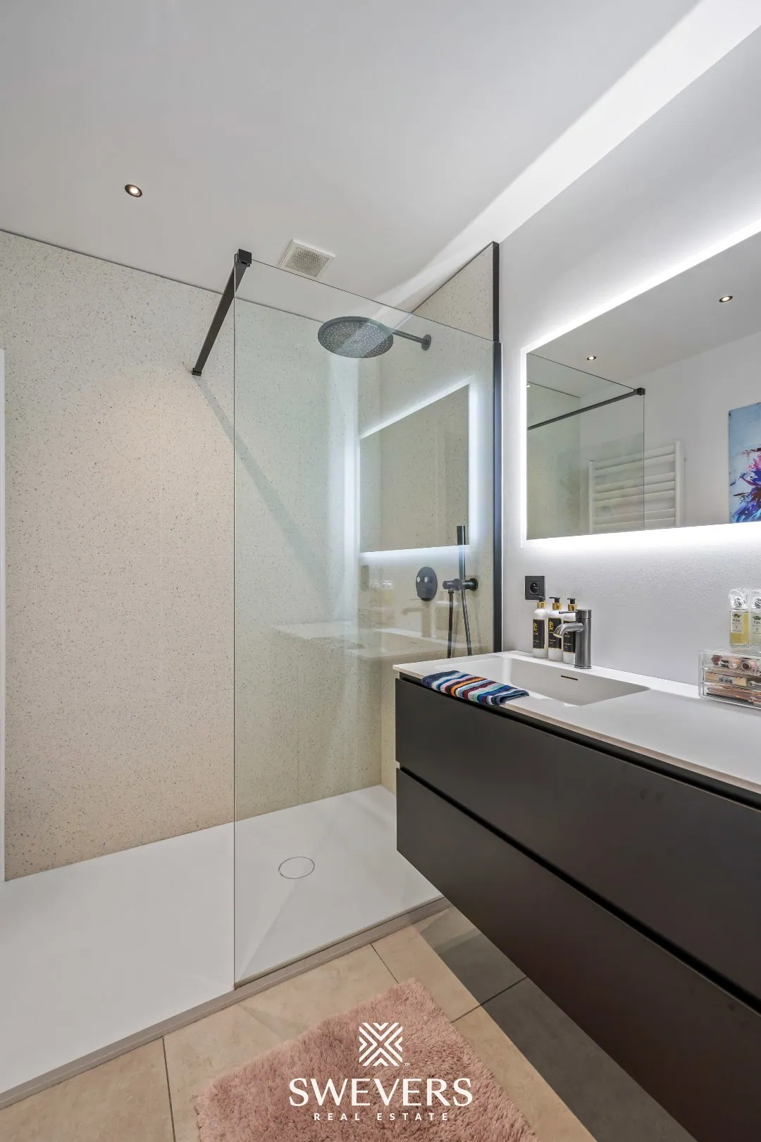 De badkamer is centraal gelegen en ingericht met een inloopdouche en lavabo. De afwerking is consistent met de rest van het appartement. Alles is voorzien om dagelijks comfort te garanderen. De ruimte is compact maar efficiënt benut.