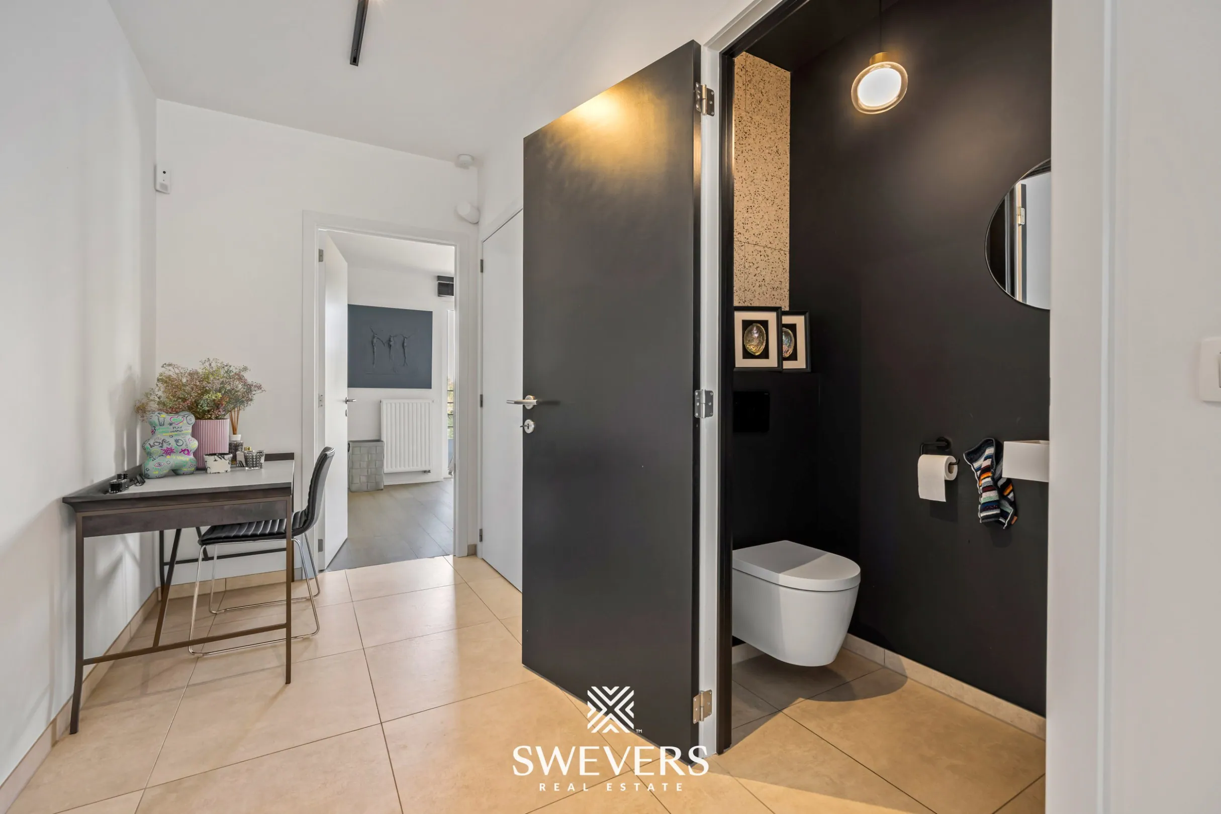 De indeling volgt een duidelijke structuur. Vanuit de inkomhal bereik je de verschillende ruimtes. De hal biedt plaats voor vestiaire en geeft toegang tot het aparte toilet.