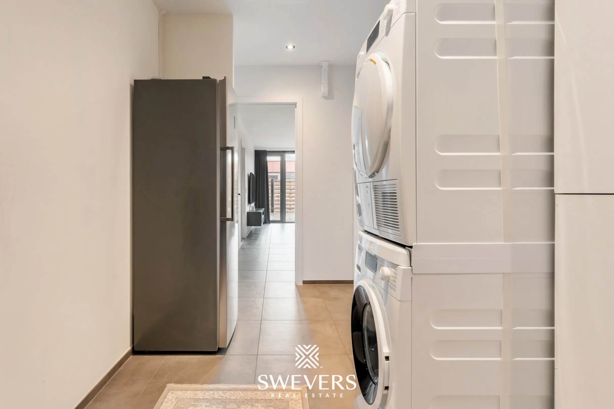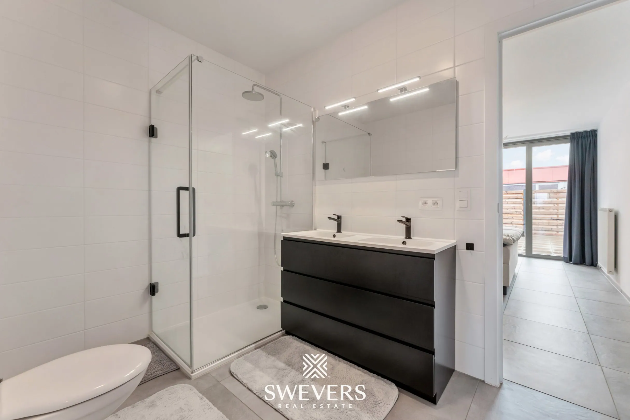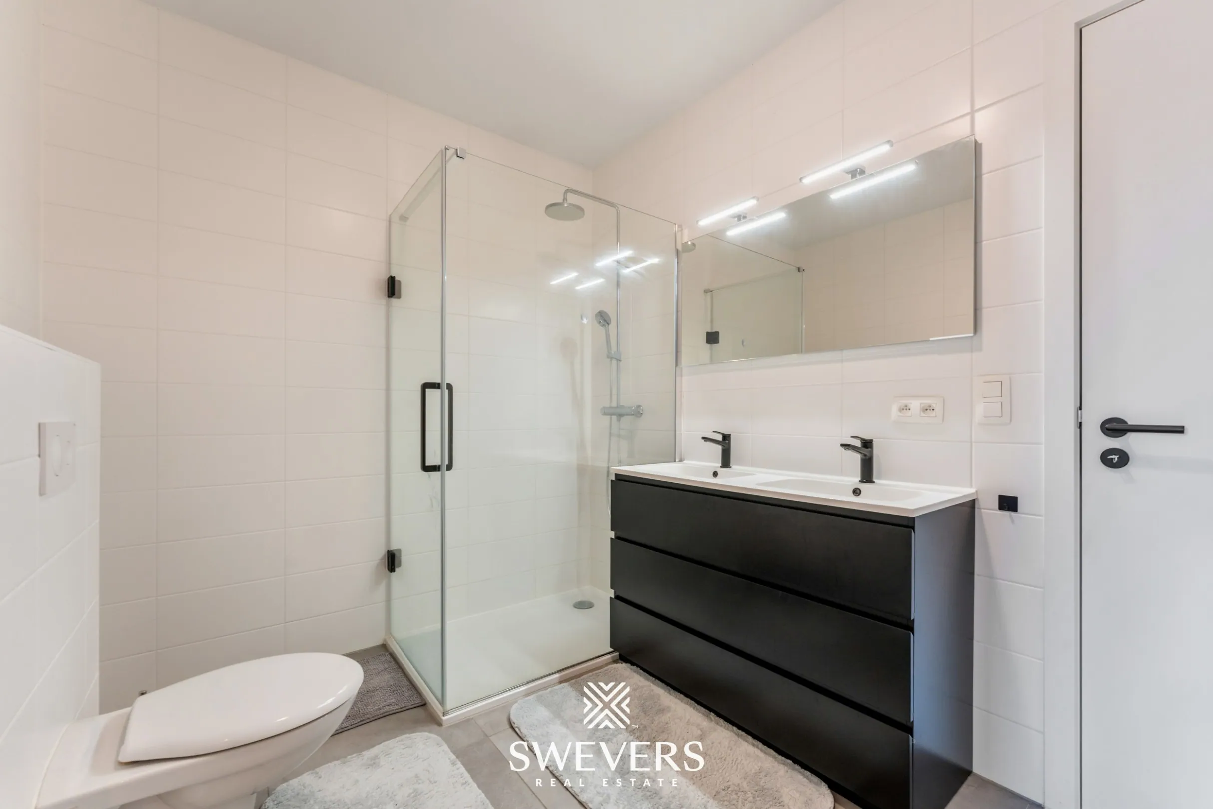 De badkamer is functioneel ingericht en sluit aan bij de hedendaagse stijl van het gebouw. Dankzij de recente bouw geniet u van moderne technieken en een verzorgde afwerking. Bovendien zijn er rookdetectoren en een videofoon voorzien, wat bijdraagt aan uw comfort en veiligheid.