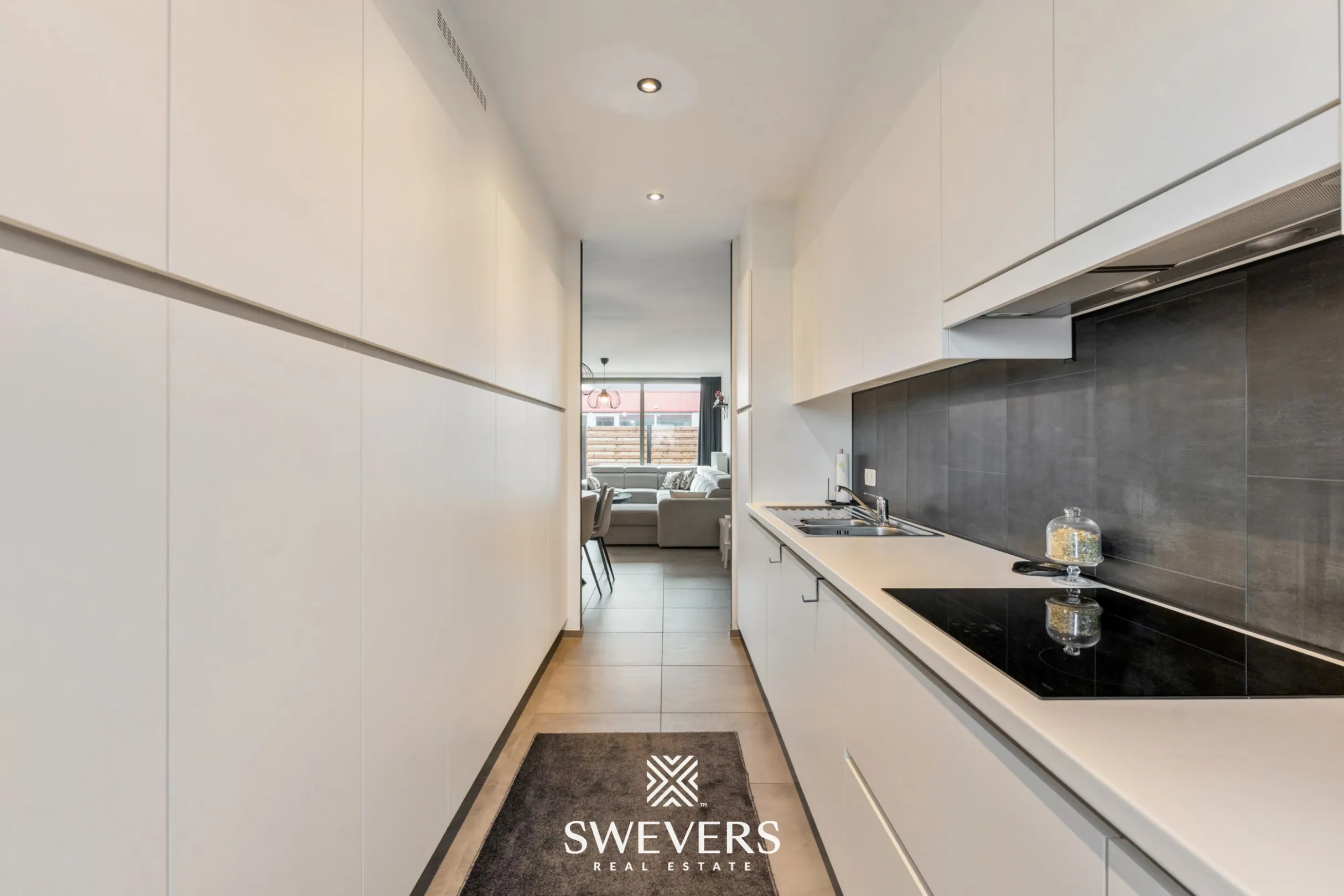 De aansluitende keuken van 6,5 m² is praktisch ingericht en staat in directe verbinding met de leefruimte. Alles is logisch gepositioneerd, zodat koken en samen zijn vlot samengaan. Terwijl u kookt, blijft u in contact met uw gasten of gezin. Dat maakt het dagelijks leven net dat tikkeltje aangenamer.