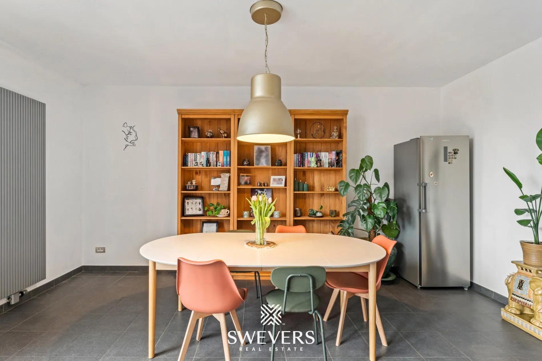 De woning is achteraan veel breder dan de voorgevel doet vermoeden, met een bewoonbare oppervlakte van maar liefst 217 m² schuilt er achter deze gevel een verrassend ruime woning. De lichtrijke leefruimte van 46,59 m² vormt het warme hart van het geheel. Grote raampartijen met aluminium schrijnwerk en HR-glas zorgen voor een aangename lichtinval. Stel u hier al even uw gezellige avonden voor, met vrienden rond de tafel of ontspannen in uw eigen comfortabele zithoek.