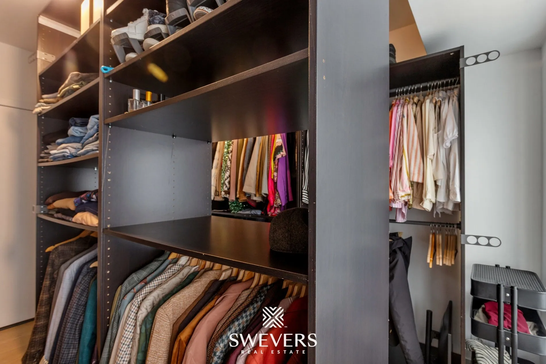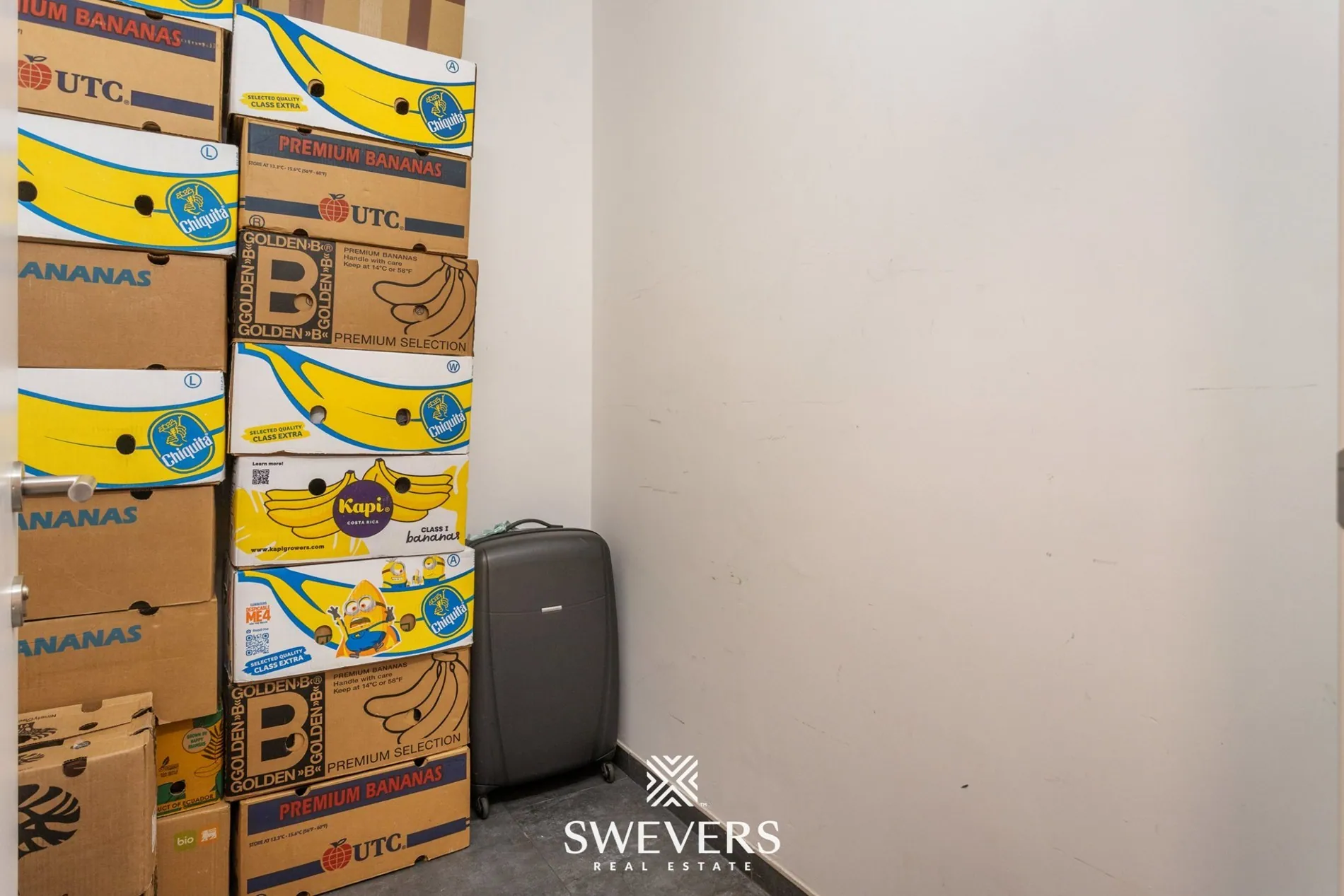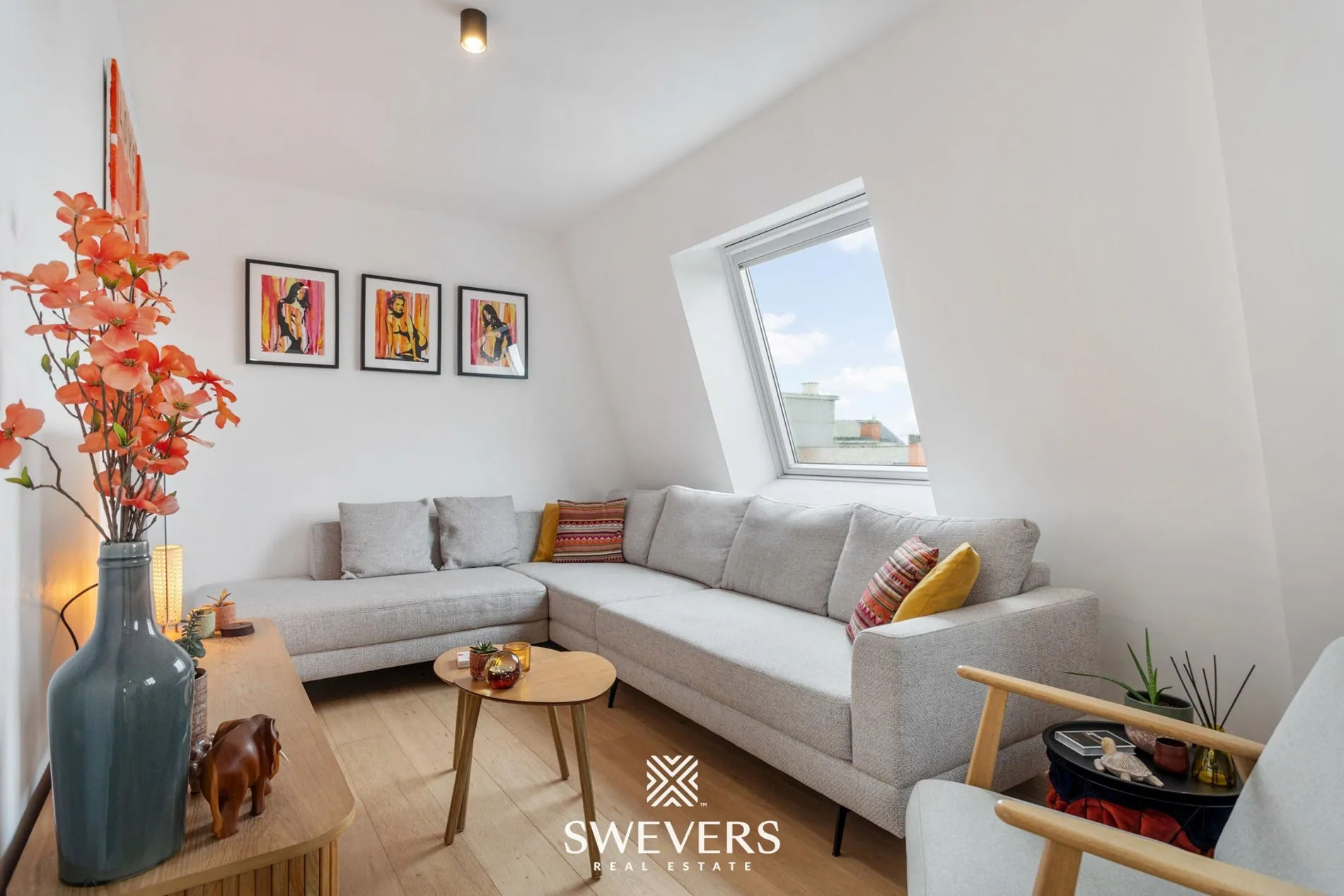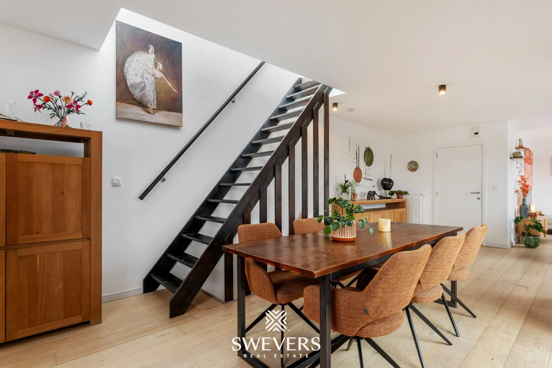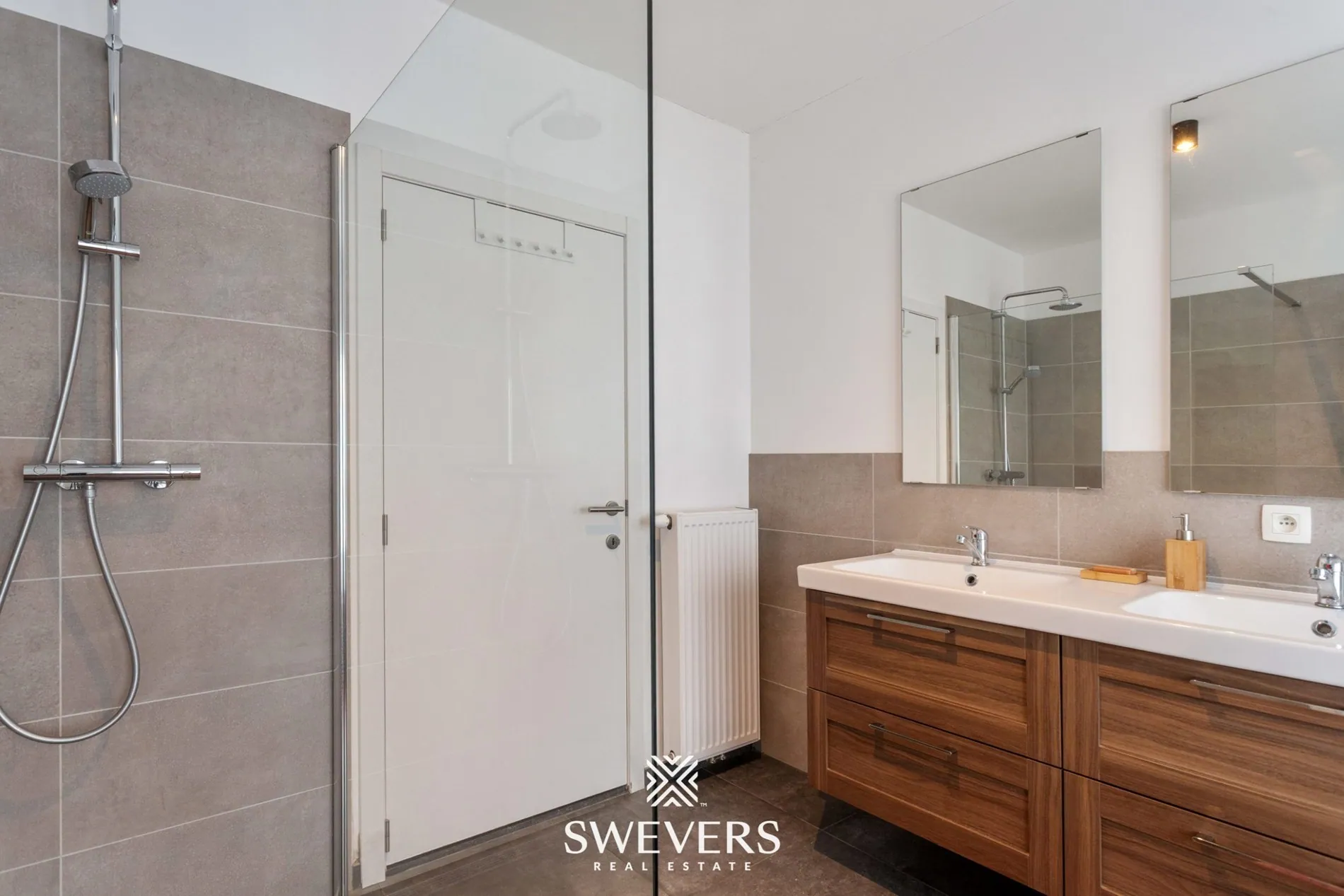 De badkamer is uitgerust met een ligbad, inloopdouche en een dubbele wastafel. Daarnaast is er een aparte berging binnen het appartement, geschikt voor wasmachine, droogkast en voorraad. Op de bovenste verdieping ligt het ruim, privatief dakterras, met prachtig uitzicht en een extra bergruimte. Een bijkomend voordeel is de privatieve berging in de gemeenschappelijke gang van het appartement. Dit maakt het eenvoudig om seizoensspullen of grotere items veilig op te bergen, zonder hiervoor naar de kelder te moeten gaan.