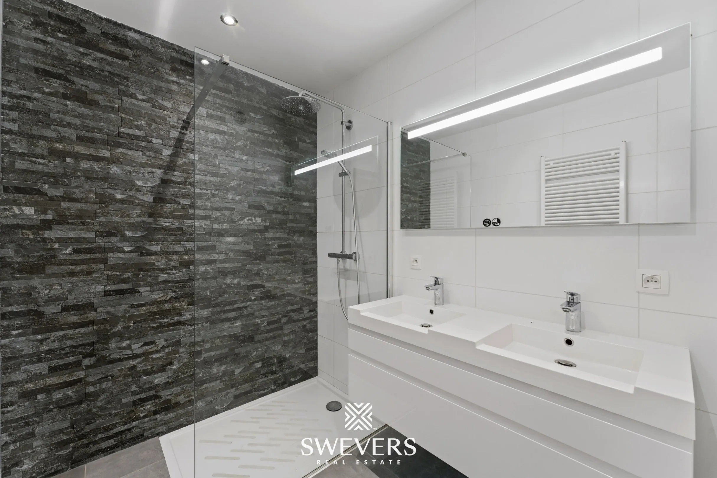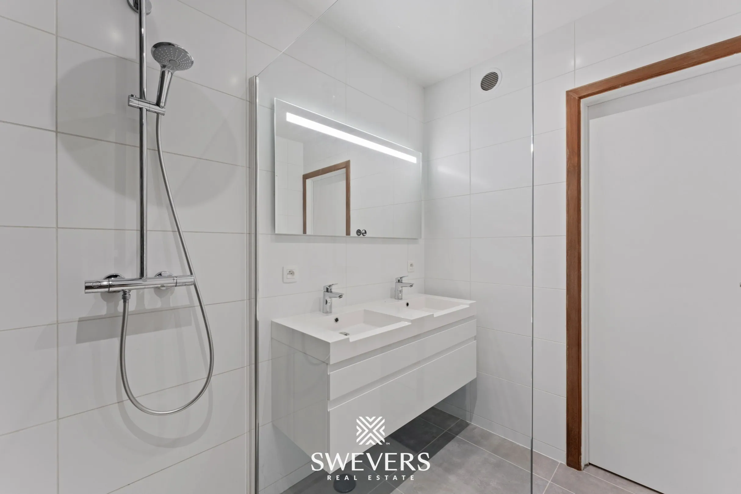 Dankzij de efficiënte indeling sluit deze perfect aan op het dagelijks gebruik. Zo beschikt de badkamer over een ruime inloopdouche en een dubbele lavabo. De douchebak is mooi ingewerkt in de vloer, wat niet alleen zorgt voor een strakke afwerking, maar ook voor extra gebruiksgemak zonder opstap.