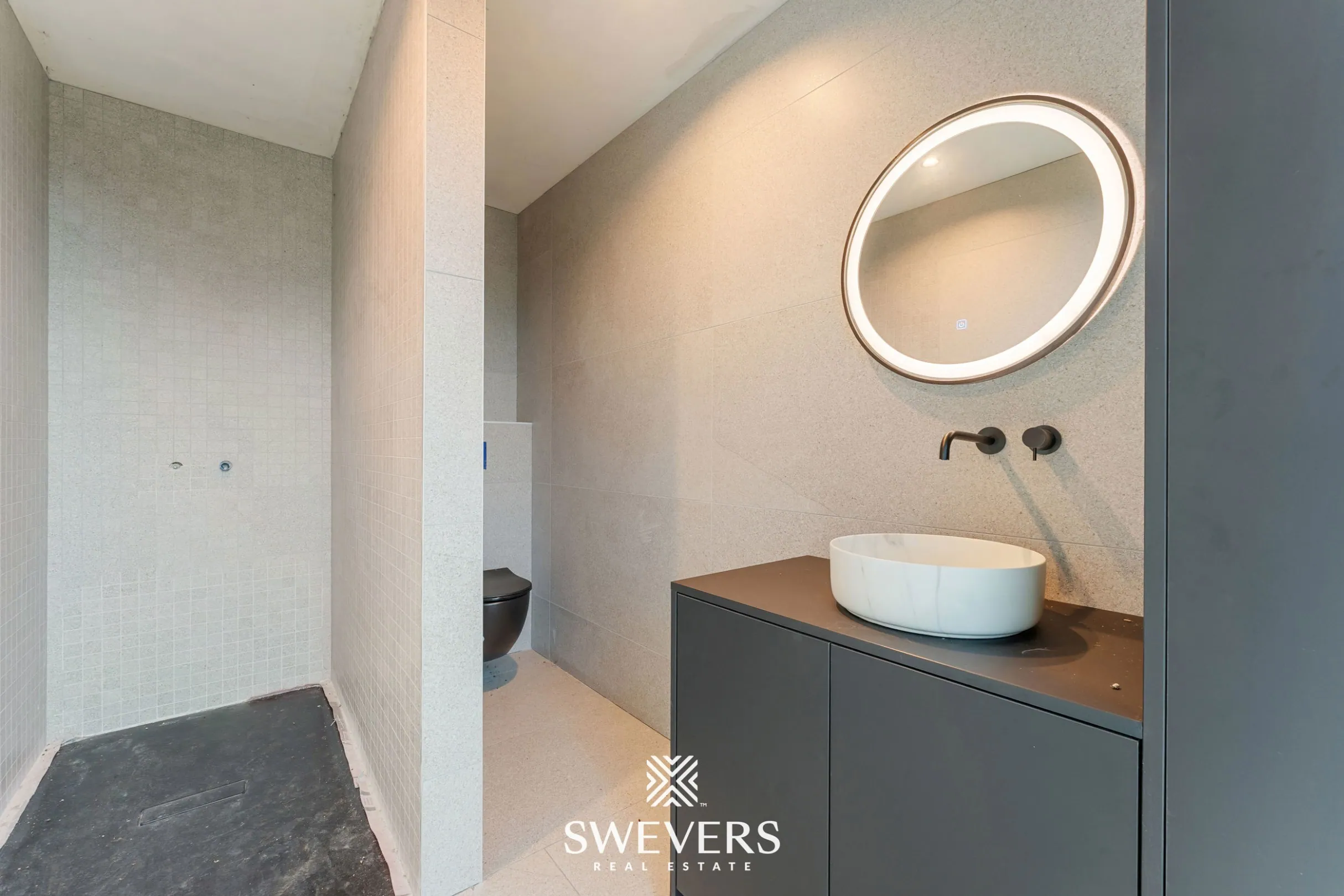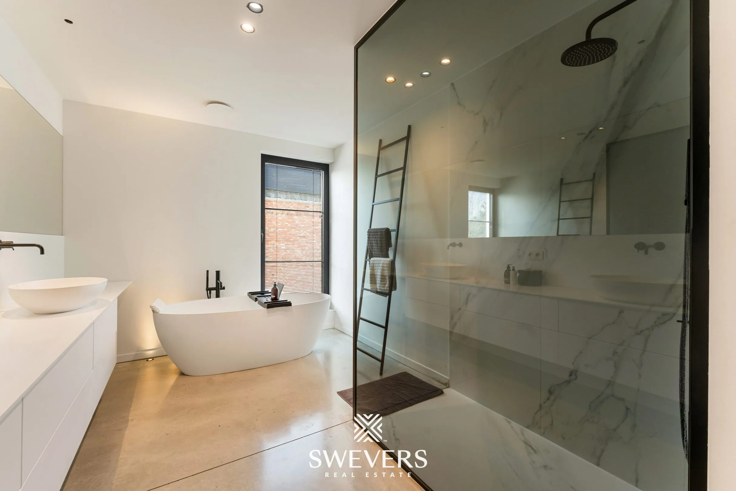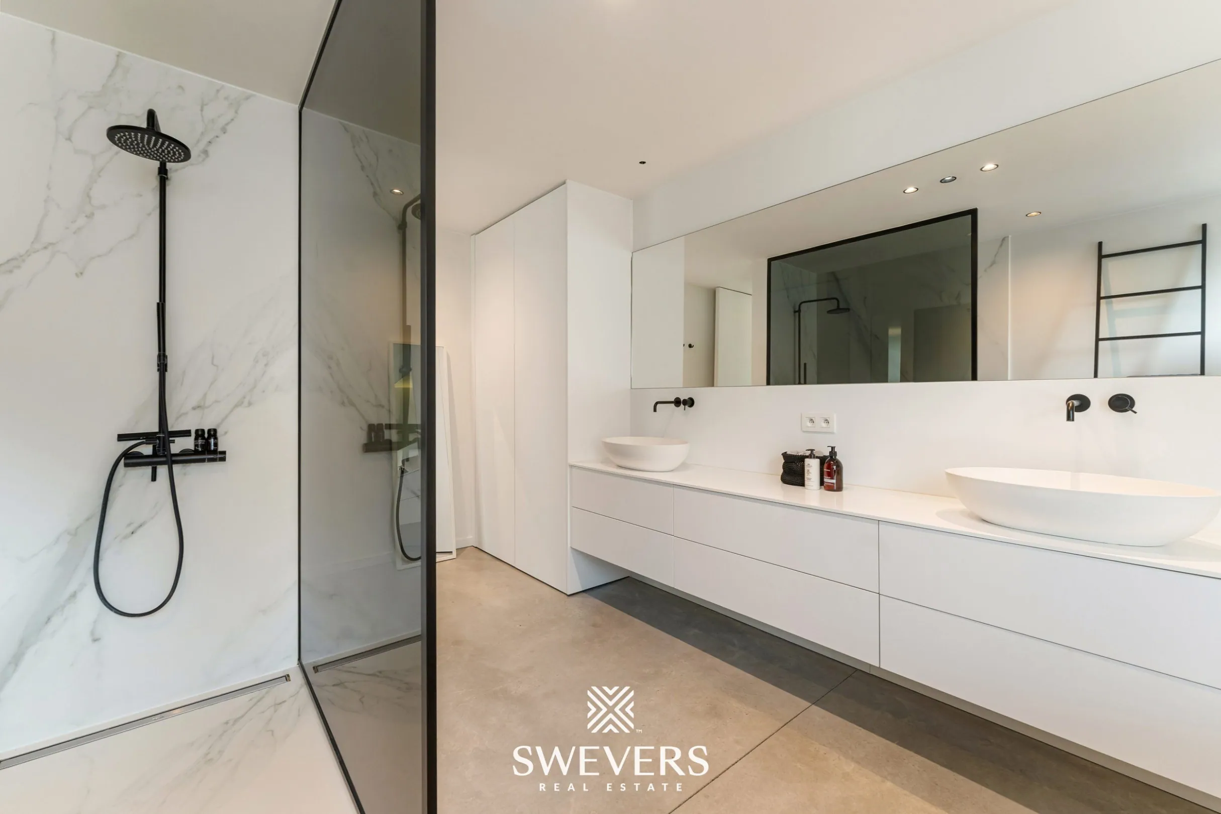 De luxueuze badkamer is centraal gelegen en uitgerust met een dubbele wastafel, inloopdouche en vrijstaand ligbad. Daarnaast is er een apart toilet op de nachthal voorzien. De indeling is logisch en afgestemd op comfortabel gezinsgebruik.