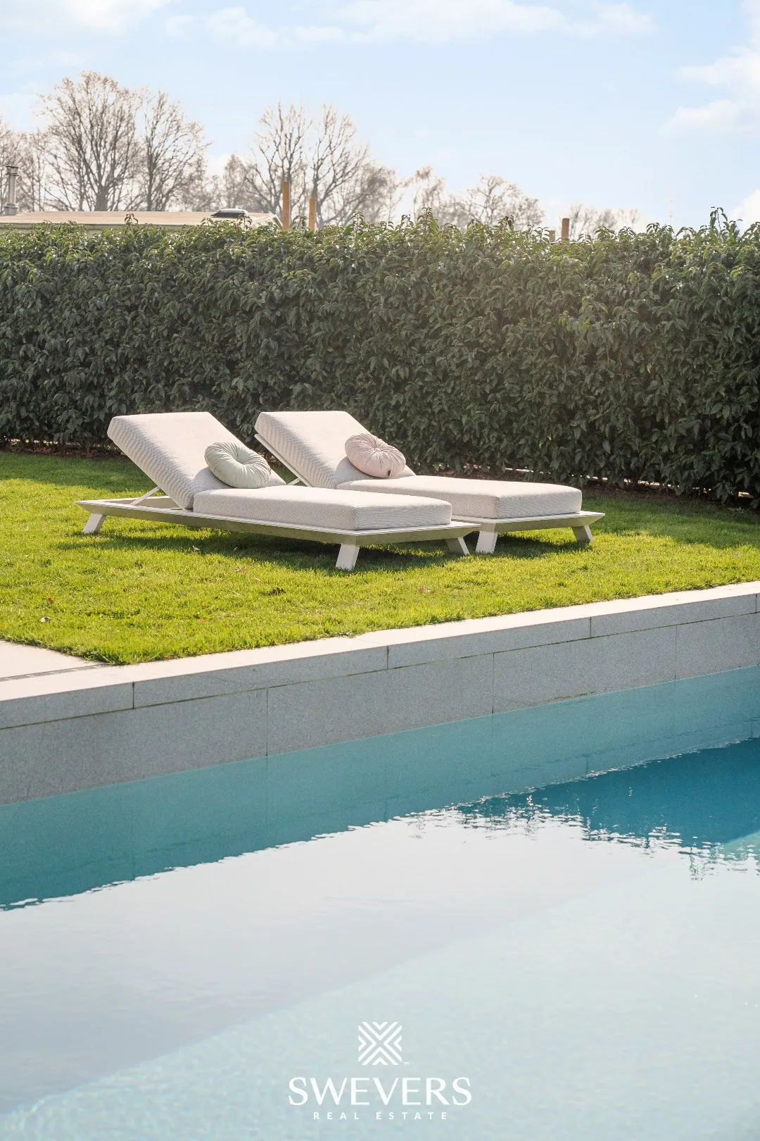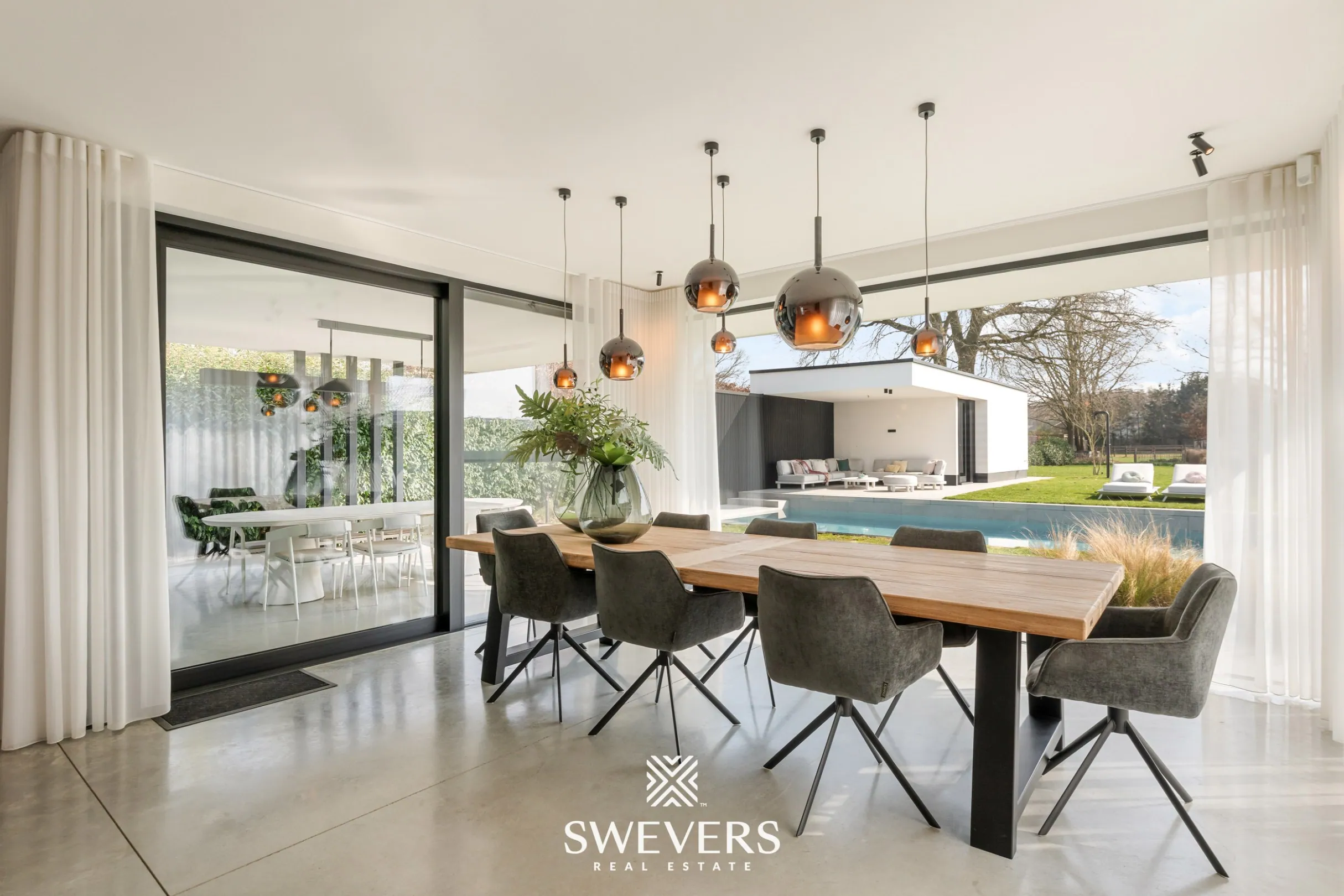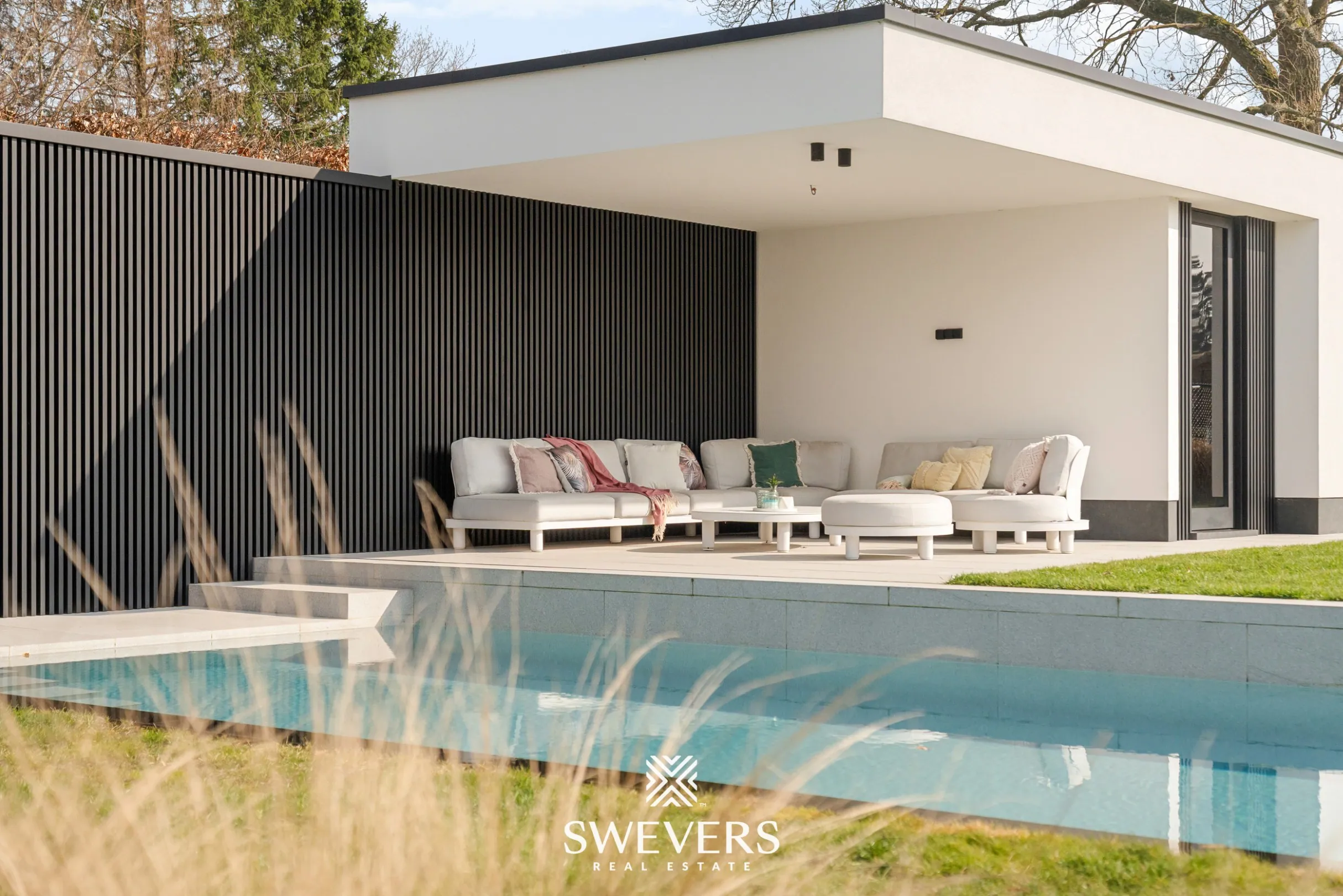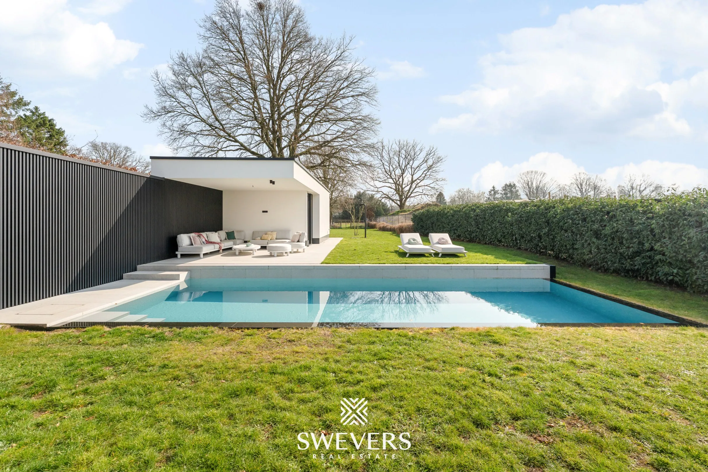 Het perceel van 1.162 m² is zuidelijk georiënteerd en biedt een zicht op achterliggende weilanden. Hier geniet men de hele dag van zon en rust. Het overloopzwembad met buitendouche (10m x3m) en het poolhouse met douche, toilet en overdekt terras maken het buitenleven compleet en tillen het wooncomfort naar een hoger niveau.