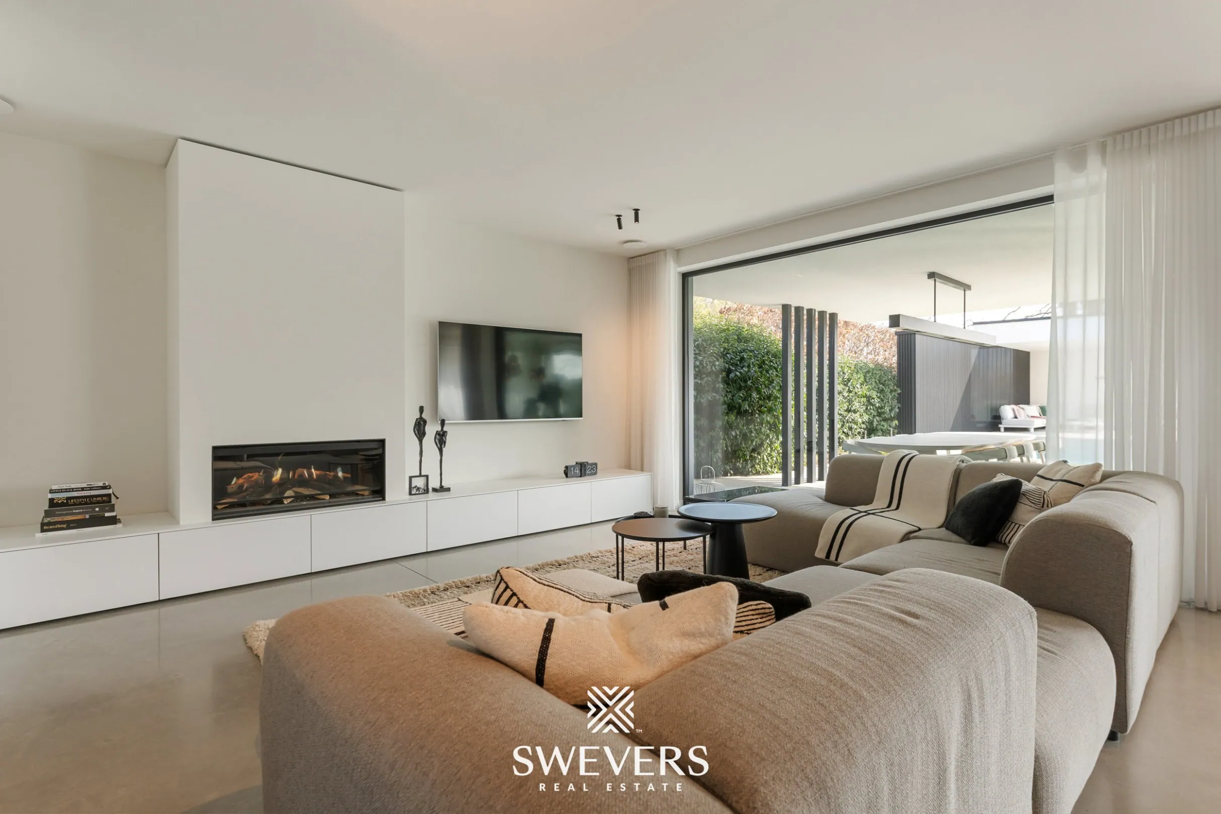 Bij het betreden van de woning komt men in de inkomhal met gastentoilet. Van hieruit opent de leefruimte zich op een natuurlijke manier. De zithoek met elektrische sfeerhaard sluit aan op de eetkamer en vormt samen een open en lichtrijk geheel. Het inpandige terras sluit mooi aan op de leefruimte en vormt een verlengde van het interieur. Grote raampartijen zorgen voor een aangenaam zicht op de tuin en het zwembad met poolhouse en brengen buiten naar binnen.