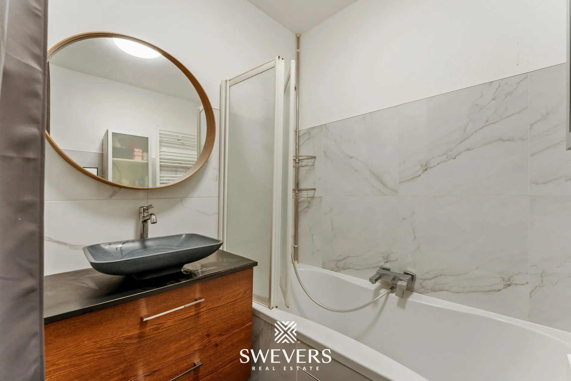 De badkamer werd eveneens vernieuwd in 2021. De inrichting is hedendaags en functioneel. Dankzij de recente renovatie is deze ruimte instapklaar. In combinatie met het aparte gastentoilet verhoogt dit het comfort voor bewoners en bezoekers.