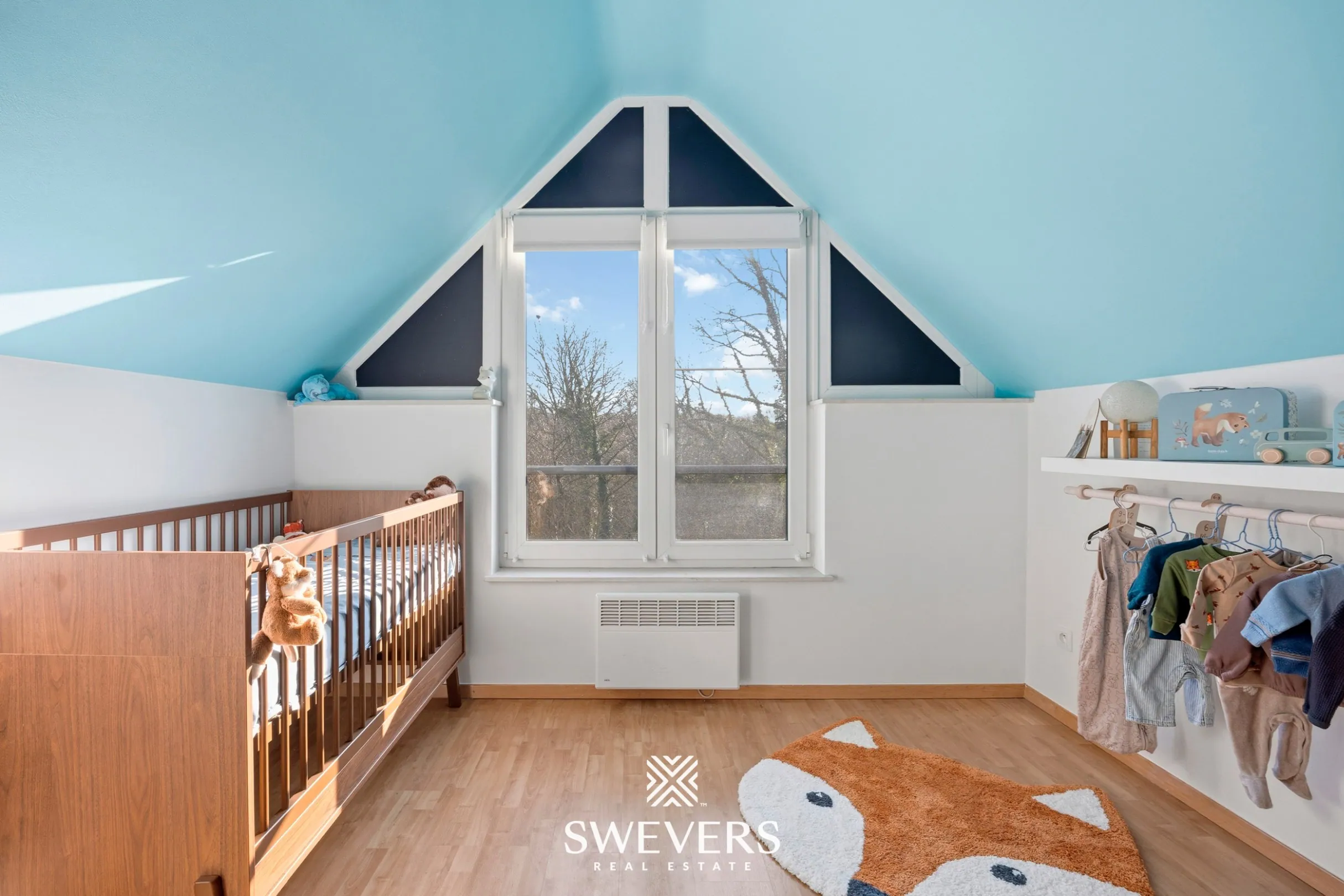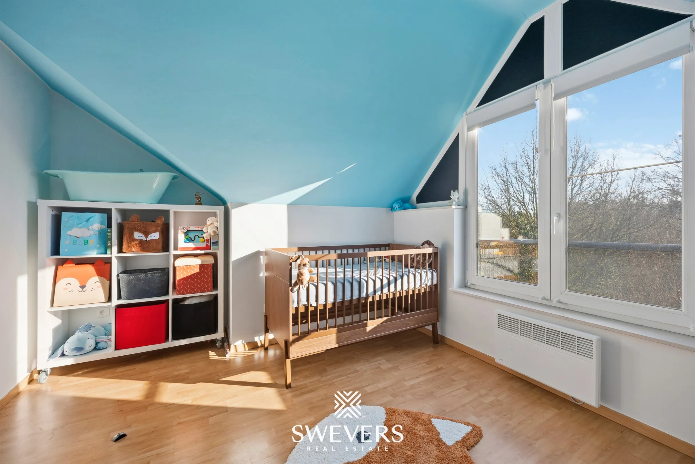 Op de bovenverdieping bevinden zich de slaapkamers. De master bedroom is bijzonder ruim en meet maar liefst 30 m². Een echte eyecatcher, met plaats voor een groot bed, kasten én een bureau. De tweede slaapkamer van 10,5 m² is ideaal als kinderkamer, logeerkamer of thuiskantoor. Flexibiliteit is hier vanzelfsprekend.