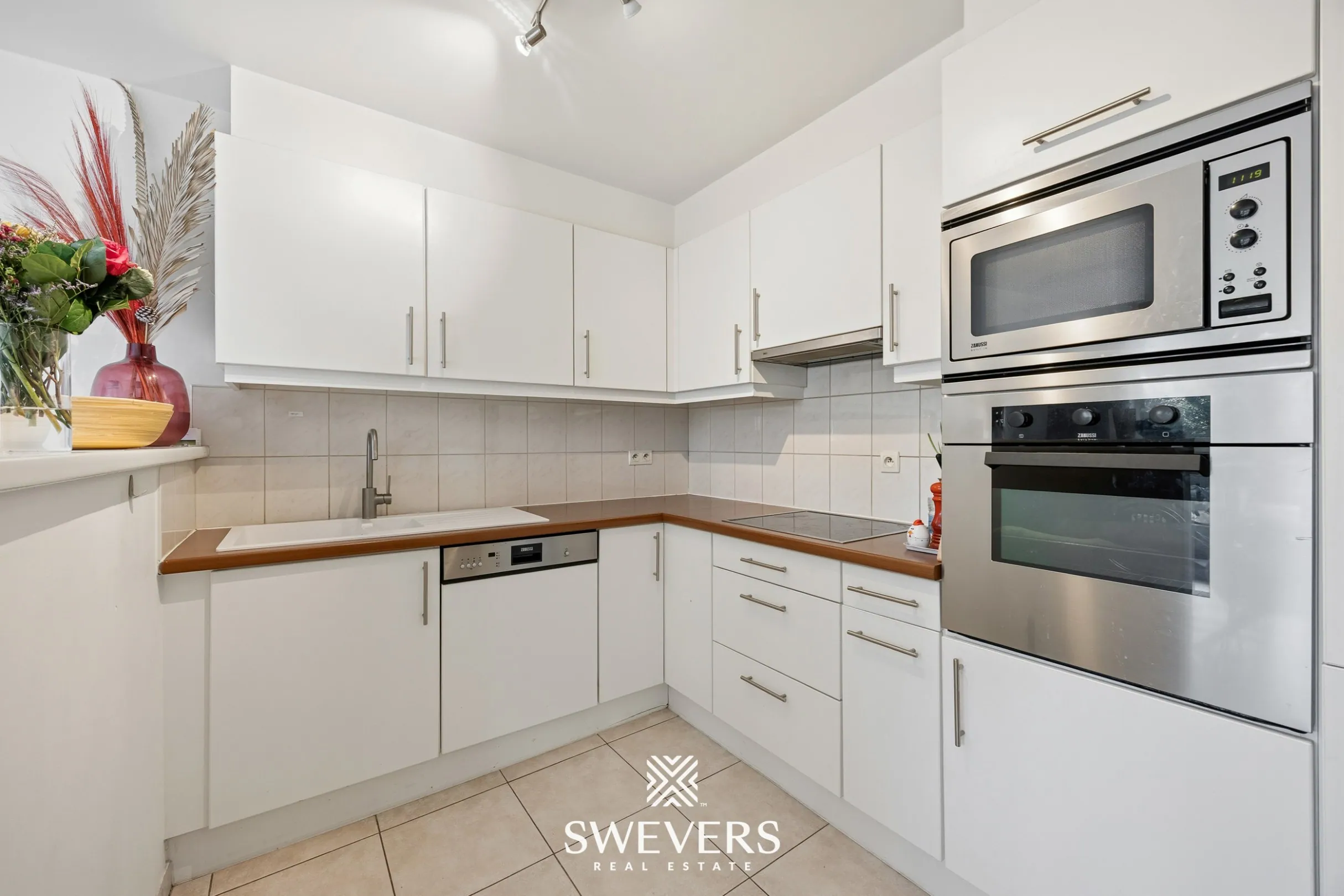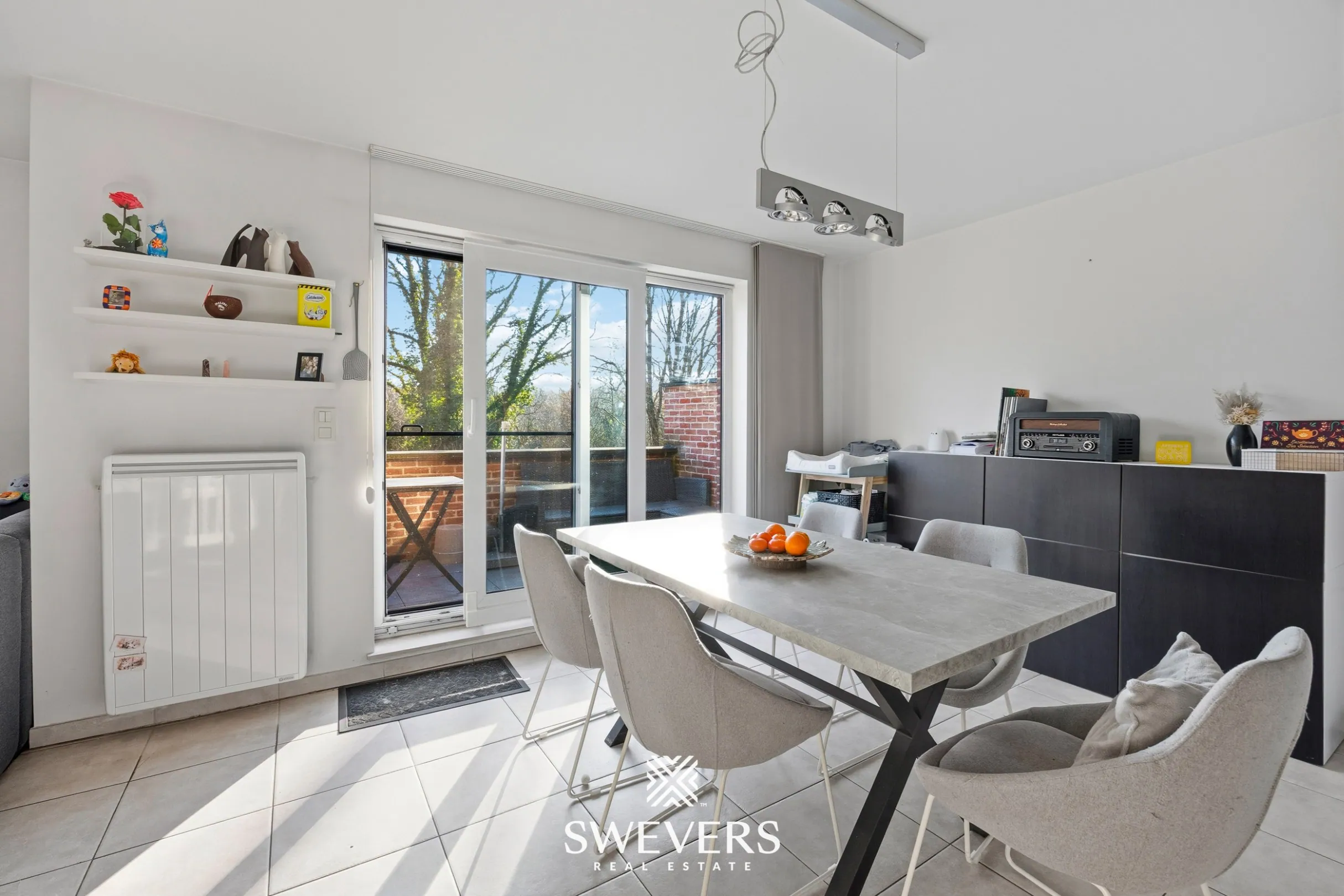 Aansluitend bevindt zich de open keuken van 9 m², praktisch ingericht en uitgerust met vernieuwde toestellen uit 2021. Koken wordt hier opnieuw een plezier. Of je nu snel iets klaarmaakt of uitgebreid kookt voor vrienden, alles ligt binnen handbereik. En terwijl de oven zijn werk doet, droom je misschien al even weg naar de avond die volgt.