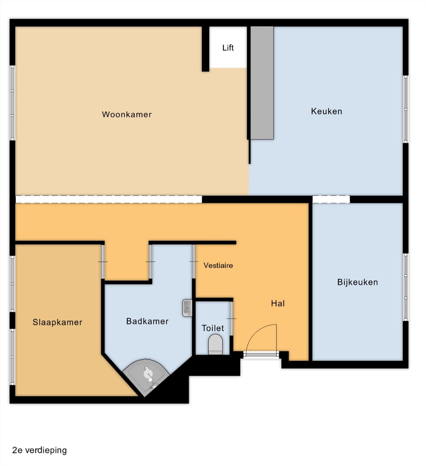 In het appartement is er een lift die leidt naar de bovenliggende verdieping waar zich de tweede slaapkamer bevindt. Deze ruimte meet 32,22 m² en strekt zich uit over de volledige diepte van het appartement. Door de grootte is hier plaats voor een slaapgedeelte, kastenwand en eventueel een werkhoek. Aansluitend is er toegang tot het terras.