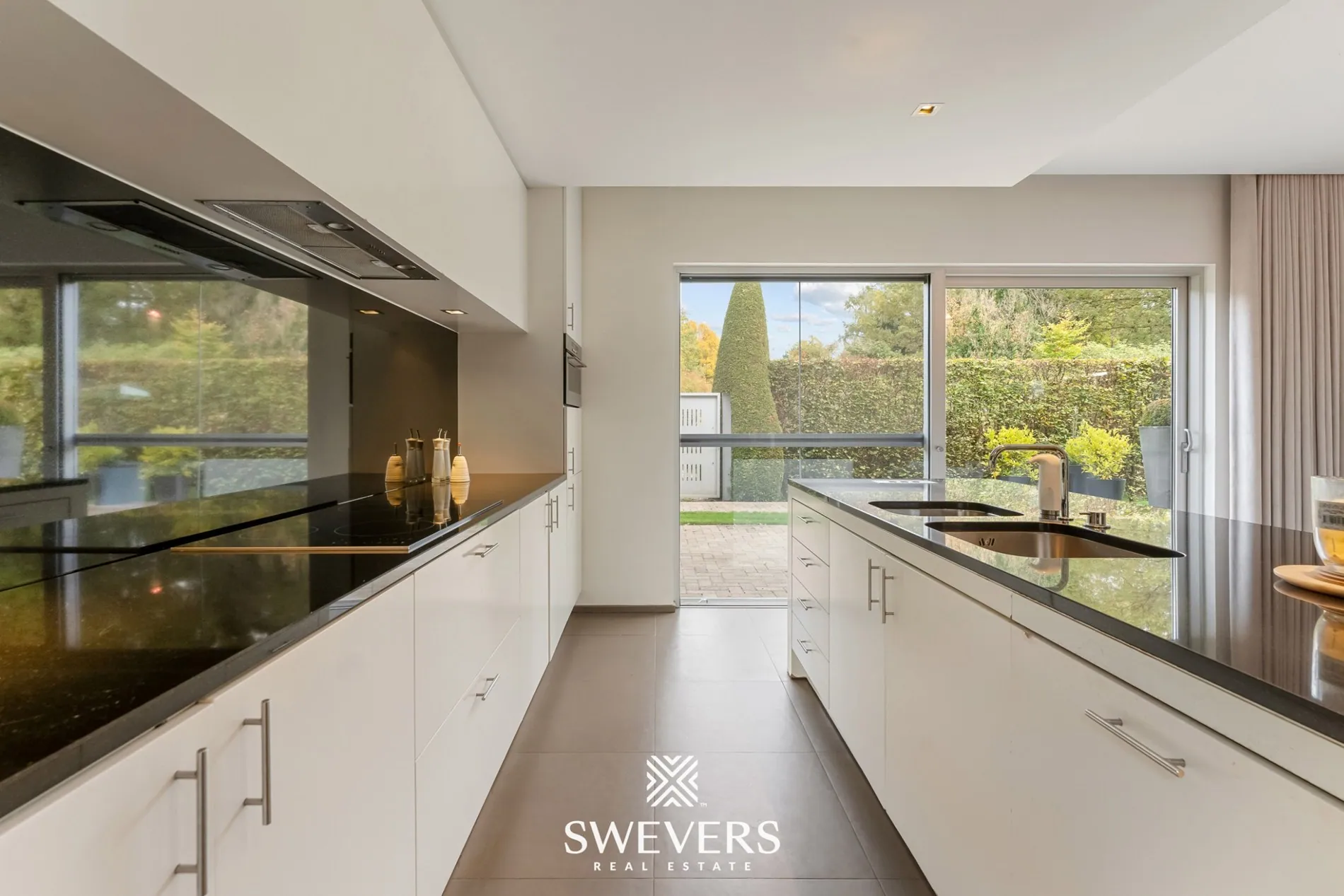 Aansluitend vind je de luxueuze keuken van 25 m² – een plek waar koken een waar genot wordt. Hoogwaardige materialen, moderne toestellen en maatkasten zorgen voor zowel comfort als design. Het zicht op de tuin en het terras nodigt uit om zomerse dagen te starten met een koffie in de ochtendzon.