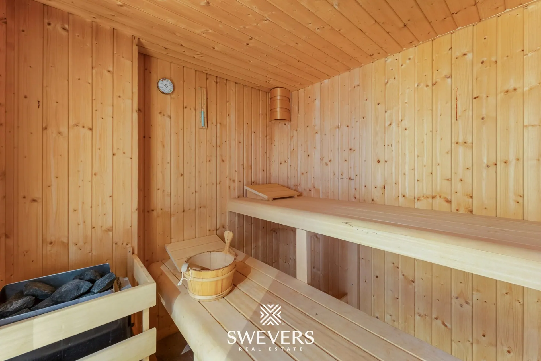 De villa beschikt bovendien over een enorme kelder van 206 m²: een volwaardige ruimte met daglicht via een groot schuifraam en directe toegang tot een verrassend terras op -1. Hier staat een mooie jacuzzi verscholen en leidt de buitentrap naar het gelijkvloerse terras en het zwembad. Deze kelderverdieping is perfect in te richten als wellnesszone, fitnessruimte, hobbyruimte of bureau. De ingebouwde Finse sauna maakt van dit niveau een luxueuze ontspanningsruimte waar elke dag aanvoelt als een dag in een spa.