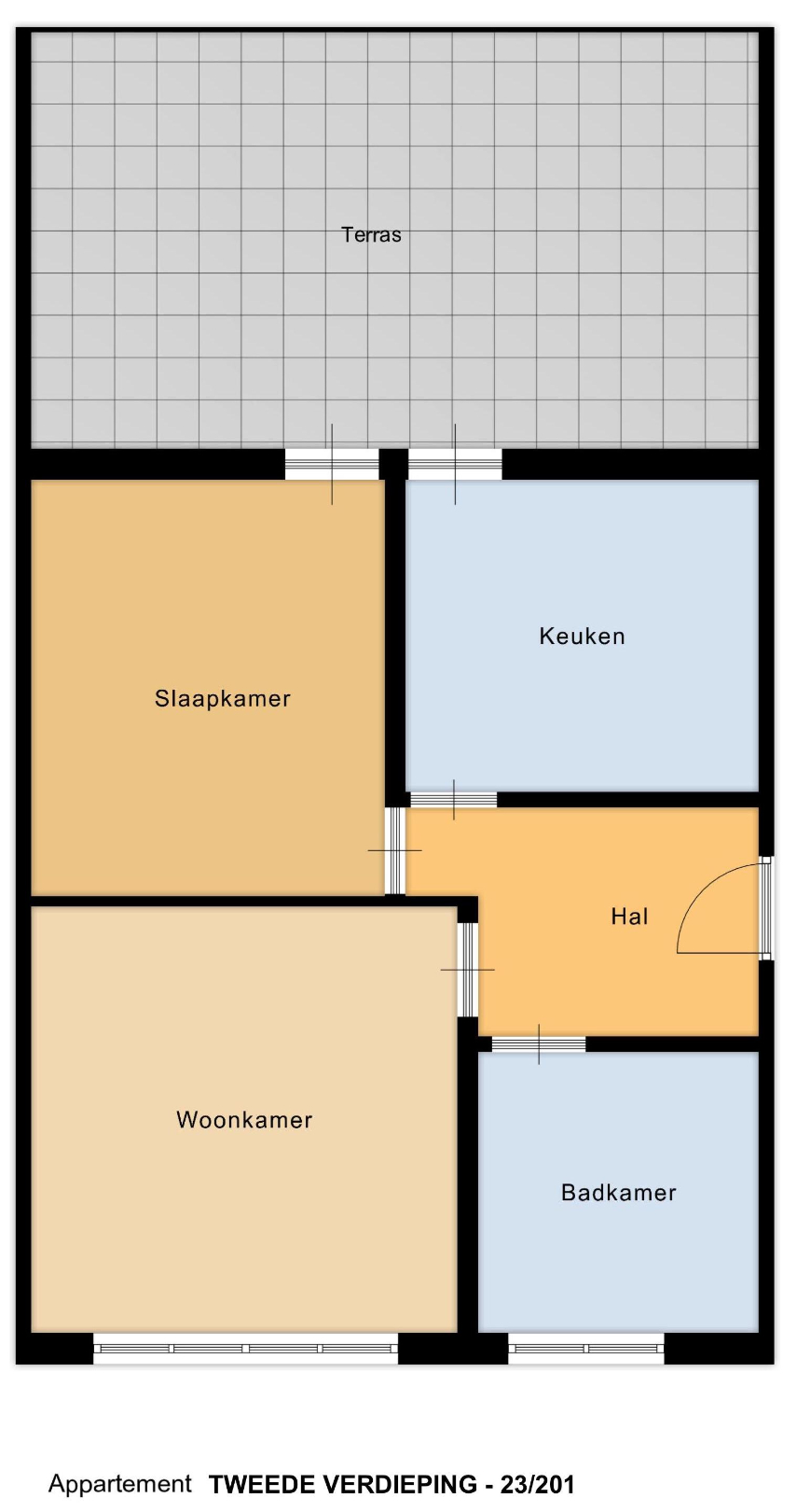 Appartement 201 bevindt zich op de bovenste verdieping en heeft een netto bewoonbare oppervlakte van 55 m². Dit appartement werd gerenoveerd in 2013, met een vernieuwde keuken, aangepaste leidingen in de badkamer en een nieuwe gasinstallatie. Het appartment beschikt over een slaapkamer van 17 m². De woonkamer is 17 m² groot en staat in verbinding met een keuken van 10 m² deze geeft toegang tot het opvallend ruime terras van 28 m².De noordgerichte buitenruimte is het grootste van het gebouw en biedt een aangename uitbreiding van het woongedeelte, met veel potentieel voor een buitenkeuken of loungehoek.