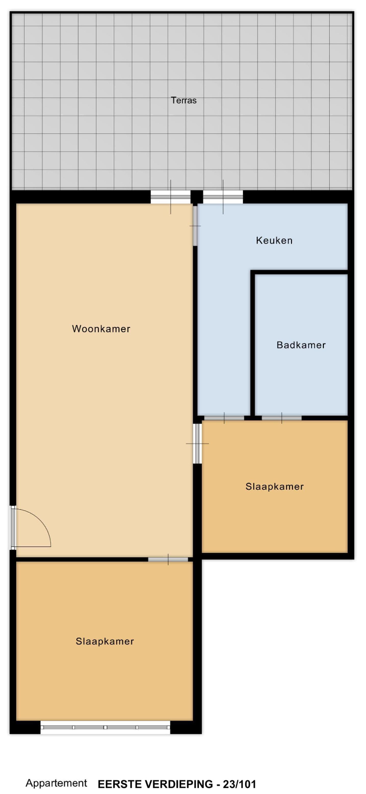Op de eerste verdieping bevindt zich appartement 101, met eveneens een bewoonbare oppervlakte van 87 m². Hier werd in 2010 grondig gerenoveerd: een nieuwe keuken, gaskachel, vernieuwde badkamer en gedeeltelijk aangepaste plafonds. De leefruimte van 32 m² biedt voldoende plaats voor een eet- en zithoek. De keuken is compact (6 m²) maar efficiënt ingericht. Twee slaapkamers van respectievelijk 14,5 m² en 10,5 m² bieden voldoende ruimte voor diverse invullingen. Het terras van 5 m², noordelijk georiënteerd, is breed genoeg voor een compacte zithoek en grenst aan de leefruimte.