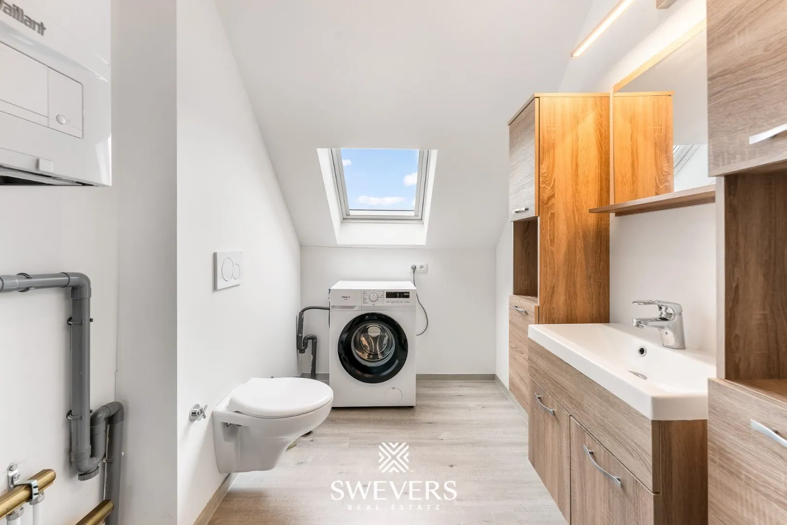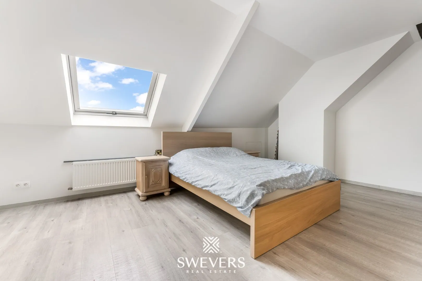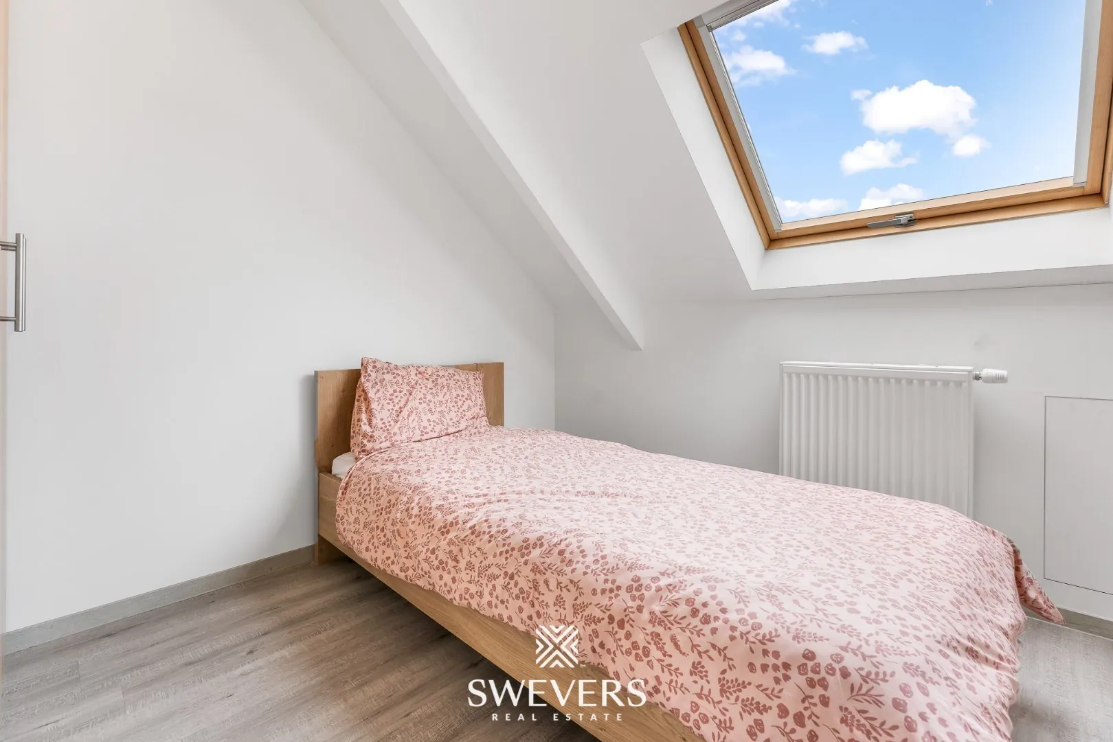 De tweede verdieping herbergt twee slaapkamers en de badkamer. De masterbedroom is ruim, met een oppervlakte van 20 m², en heeft voldoende ruimte voor een groot bed en een garderobe. De tweede slaapkamer is iets kleiner, maar met 10 m² nog steeds ruim genoeg voor een logeer- of kinderkamer. Beide kamers hebben een aangename lichtinval. De badkamer op deze verdieping is uitgerust met een douche, toilet en een moderne wastafel, waardoor ook deze ruimte volledig instapklaar is.