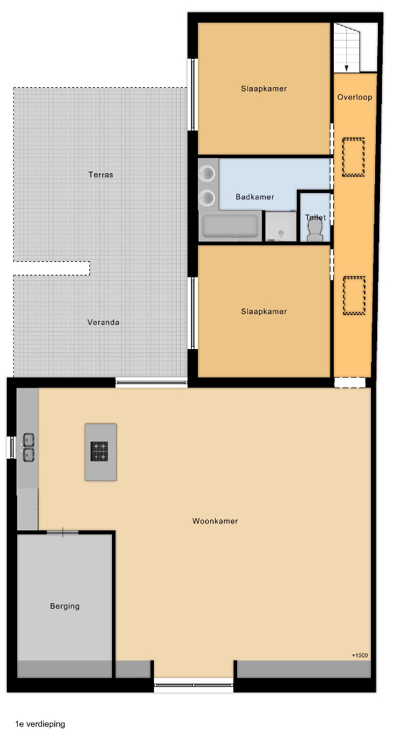 Gaan we naar de eerste verdieping dan vind je een mooi appartement dat piekfijn afgewerkt werd met een opvallend charmevolle en gezellige look. Zowel het grote open karakter als de aanzienlijke hoeveelheid natuurlijke lichtinval zorgen hier voor een zeer ruim gevoel. De woonkamer vormt samen met de magnifieke open keuken één buitengewoon groot geheel van maar liefst 71m² groot. Daarbovenop wordt het geheel nog eens verrijkt met een zalige veranda. En als zelfs dat nog niet ruim genoeg is, schuif je ‘s zomers dat grote raam maar volledig open. Zo krijg je er nog een zonovergoten terras van maar liefst 25m² bovenop. De ideale westelijke oriëntatie laat je hier na een drukke werkdag tot in de laatste uurtjes genieten van dat heerlijke avondzonnetje.