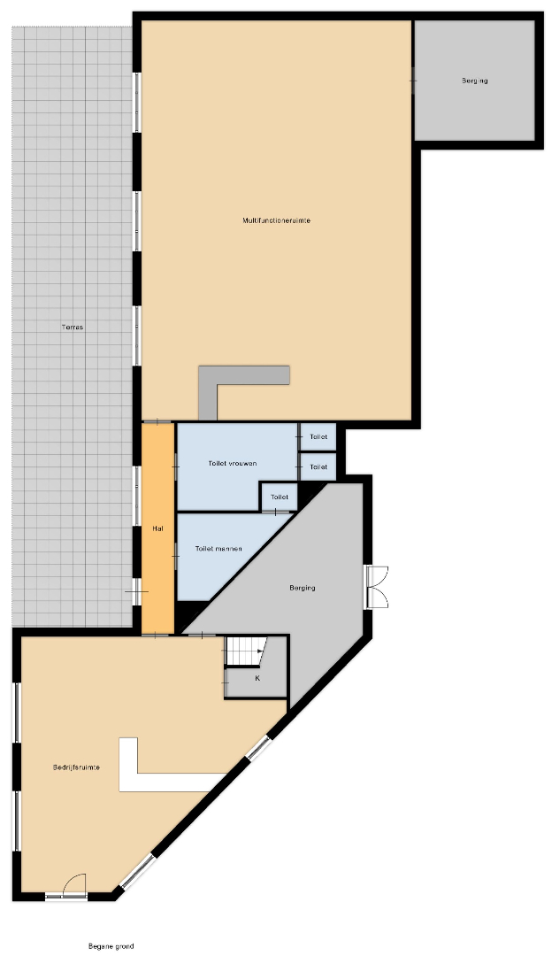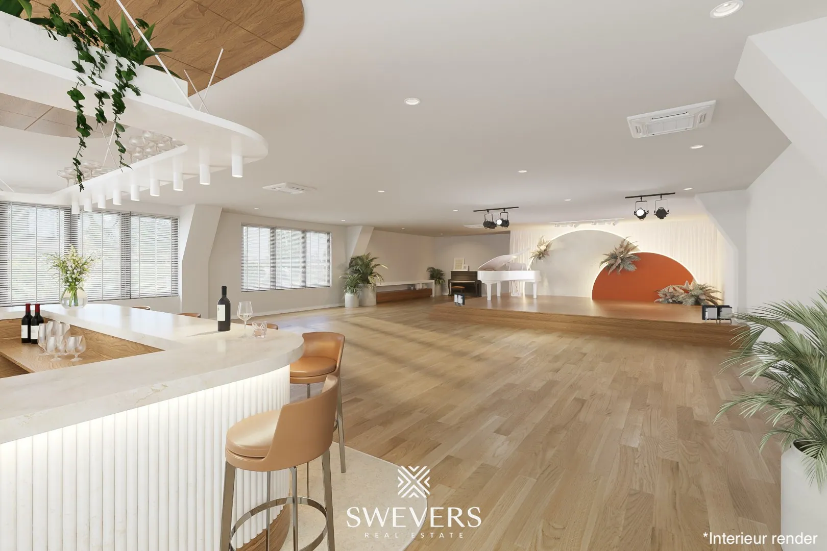 Aansluitend op de hal bevindt zich een zeer ruime multifunctionele zaal van maar liefst 120 m² die momenteel ingericht is als feestzaal. Ook deze zaal beschikt ook over een uitgeruste bar en raampartijen die uitgeven op het terras. Aanvullend zijn er op de begane grond voldoende toiletfaciliteiten, bergingen en ruimte die kan dienen als keuken of bijkeuken. Dit maakt het geheel functioneel en flexibel in te richten.