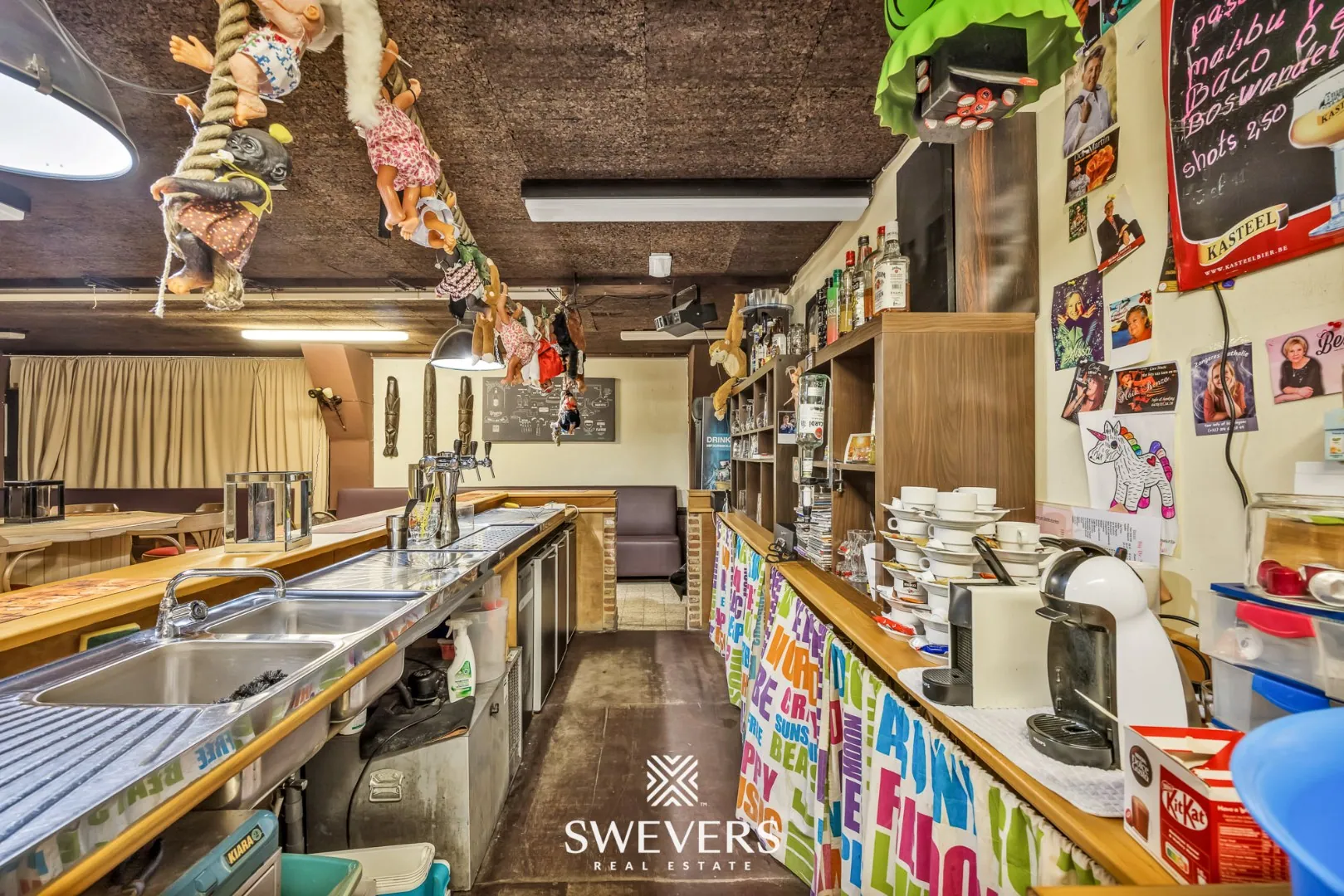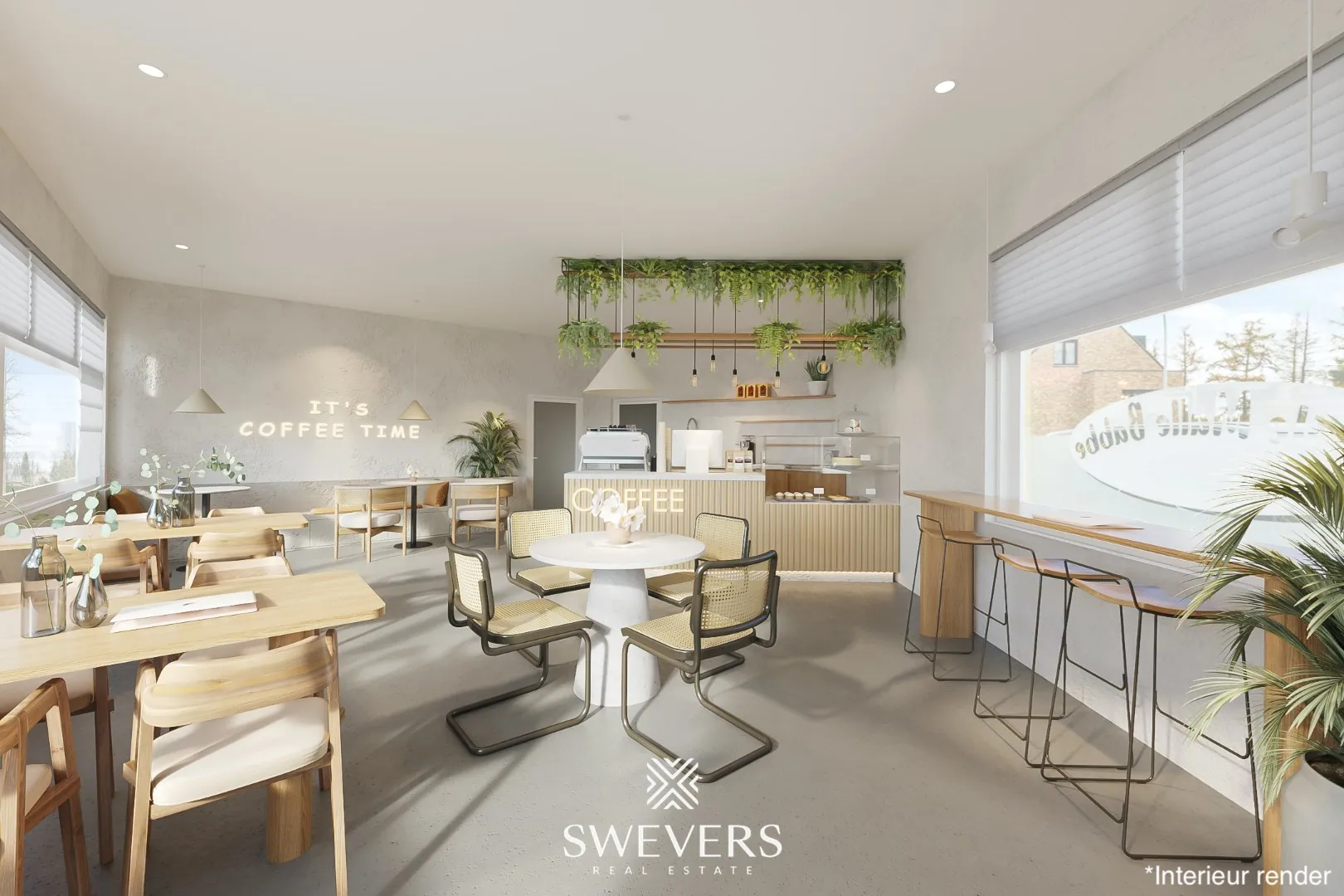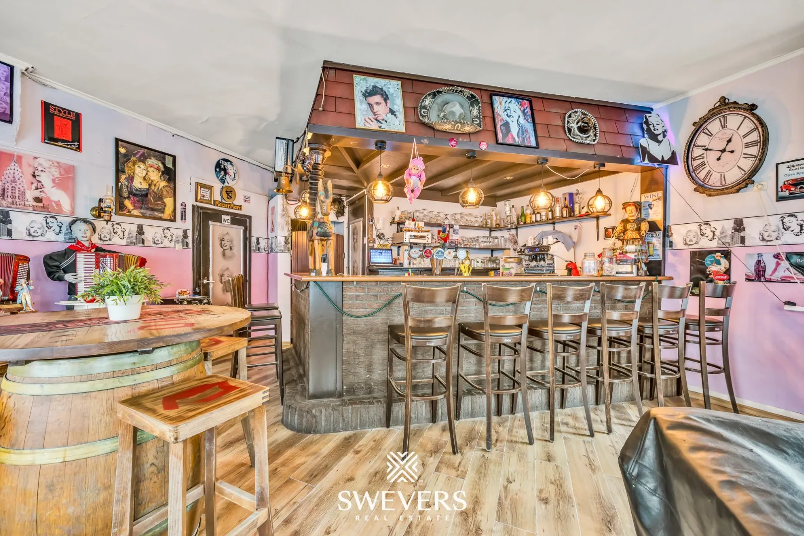 Het gebouw is te renoveren, maar het karakter van het pand is veelbelovend. Op de begane grond bevindt zich een gezellig café van ongeveer 50 m², dat direct uitnodigt met veel lichtinval en een volledig uitgeruste bar. De ruimte straalt sfeer en toegankelijkheid uit, ideaal voor een breed scala aan klanten. Via een praktische hal achter het café bereikt u een royaal terras van 80 m². Deze buitenruimte biedt volop mogelijkheden, bijvoorbeeld voor zomerse evenementen of een uitgebreide horecabeleving in de buitenlucht.