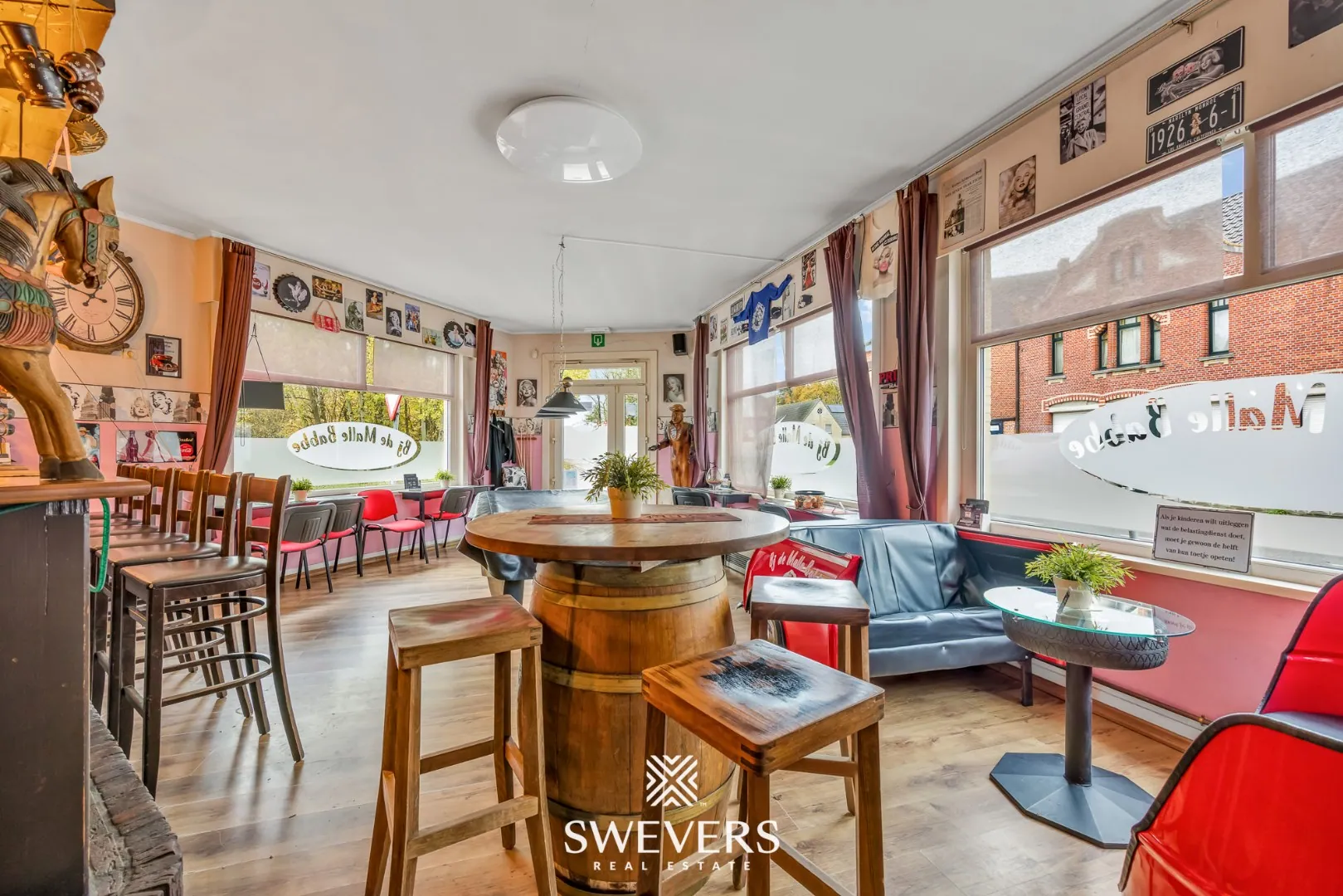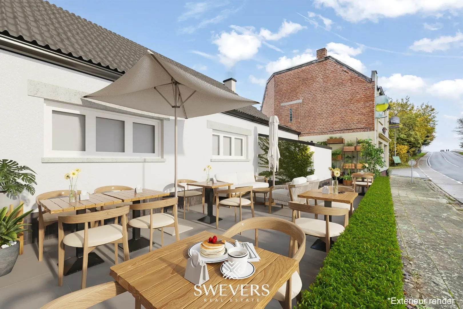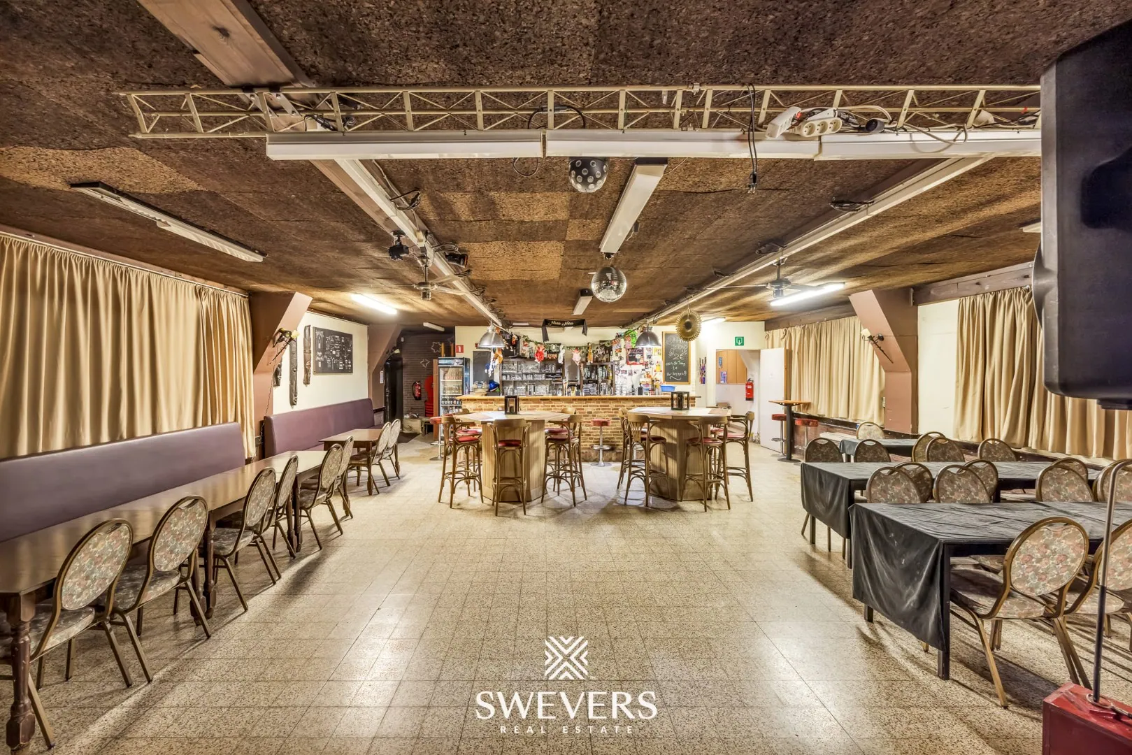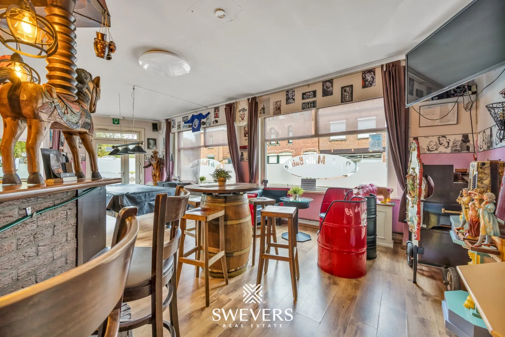 Het gebouw is te renoveren, maar het karakter van het pand is veelbelovend. Op de begane grond bevindt zich een gezellig café van ongeveer 50 m², dat direct uitnodigt met veel lichtinval en een volledig uitgeruste bar. De ruimte straalt sfeer en toegankelijkheid uit, ideaal voor een breed scala aan klanten. Via een praktische hal achter het café bereikt u een royaal terras van 80 m². Deze buitenruimte biedt volop mogelijkheden, bijvoorbeeld voor zomerse evenementen of een uitgebreide horecabeleving in de buitenlucht.