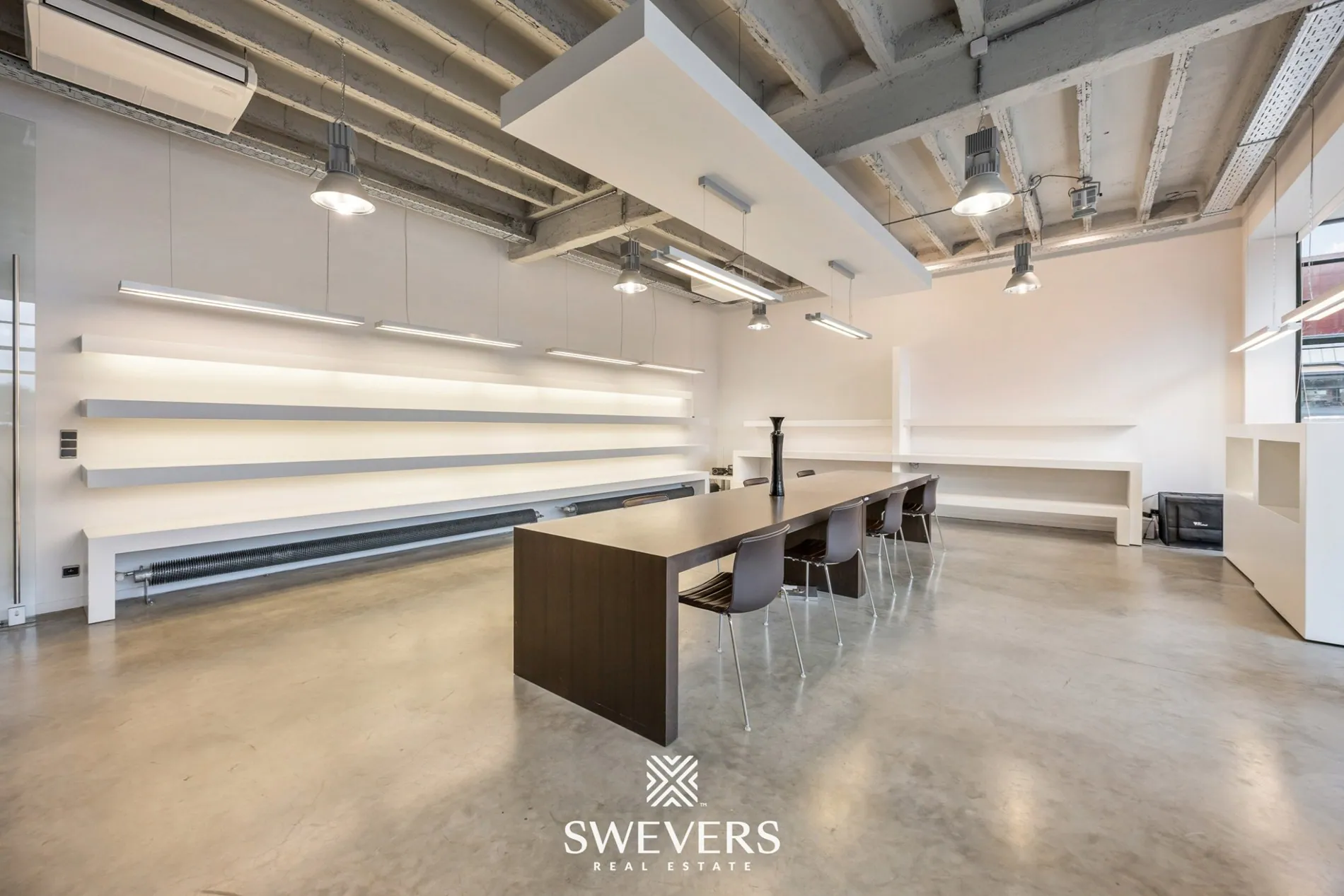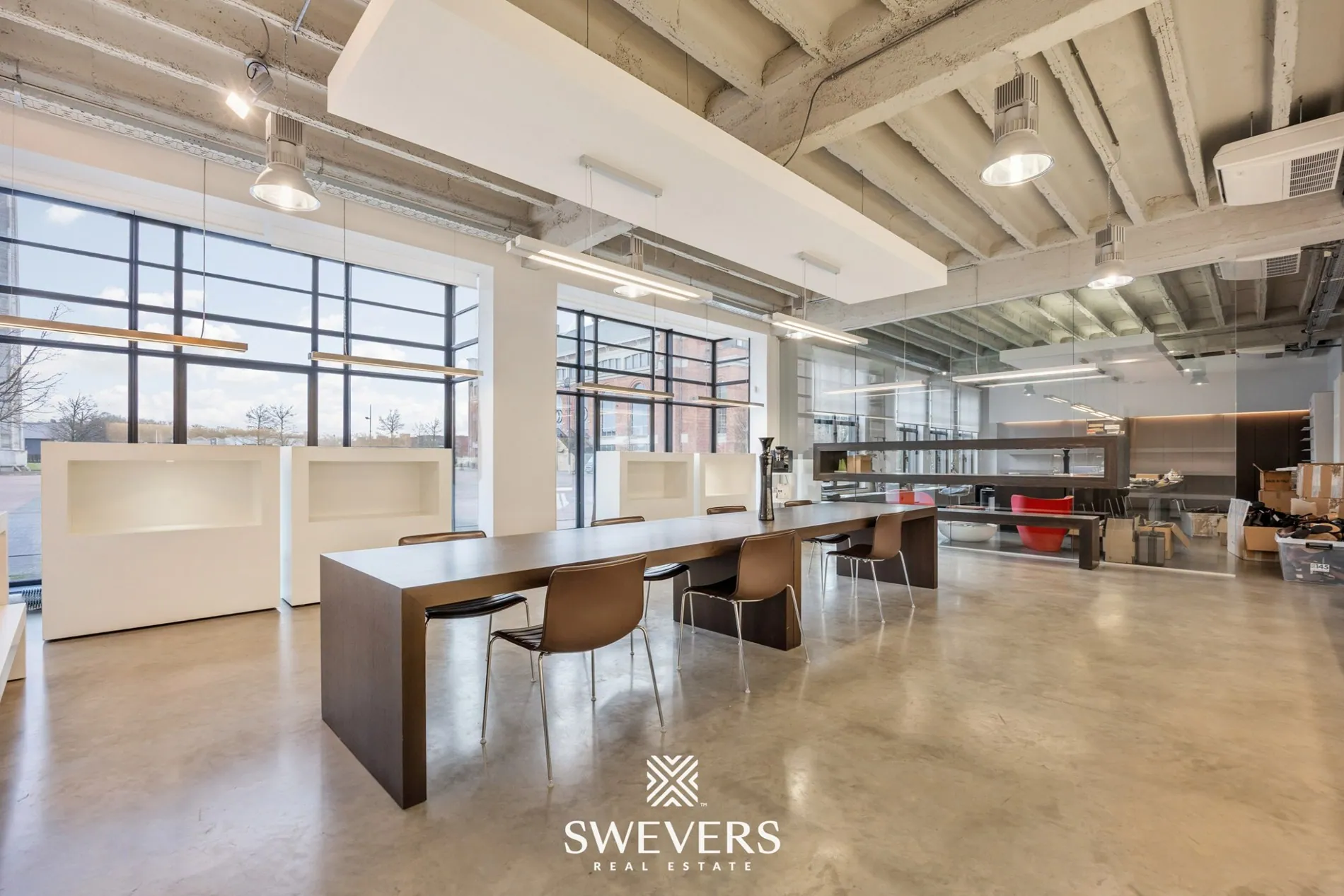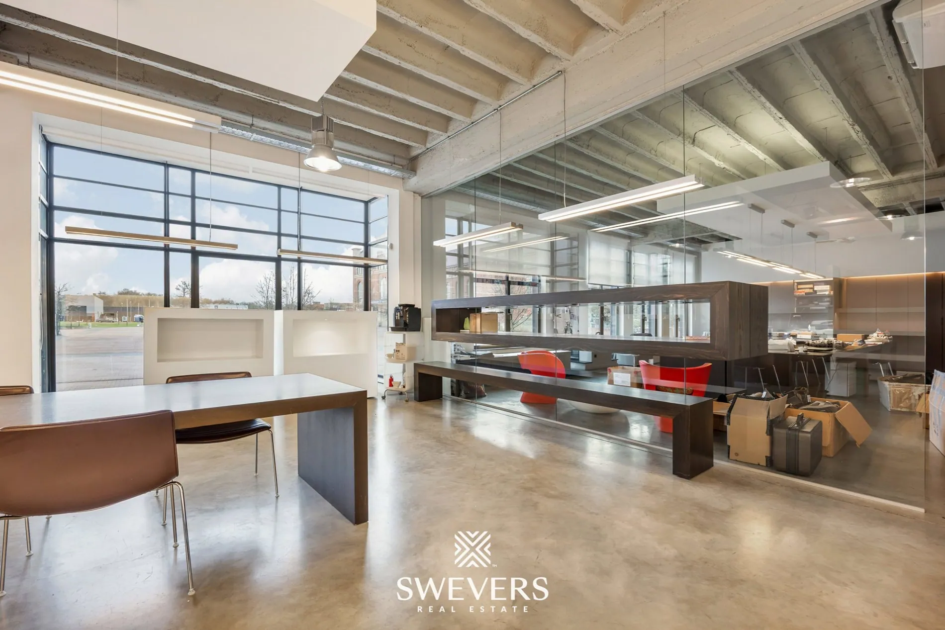 Bij het betreden van de ruimte valt meteen de moderne, industriële en tegelijk luxueuze afwerking op. Hoge plafonds, strakke lijnen en een overvloed aan natuurlijk licht zorgen voor een open en professionele sfeer. De grote raampartijen bieden niet alleen een prachtig zicht op het plein, maar versterken ook de connectie met de levendige omgeving. Hier voelt werken, ontvangen en ondernemen vanzelfsprekend aan.