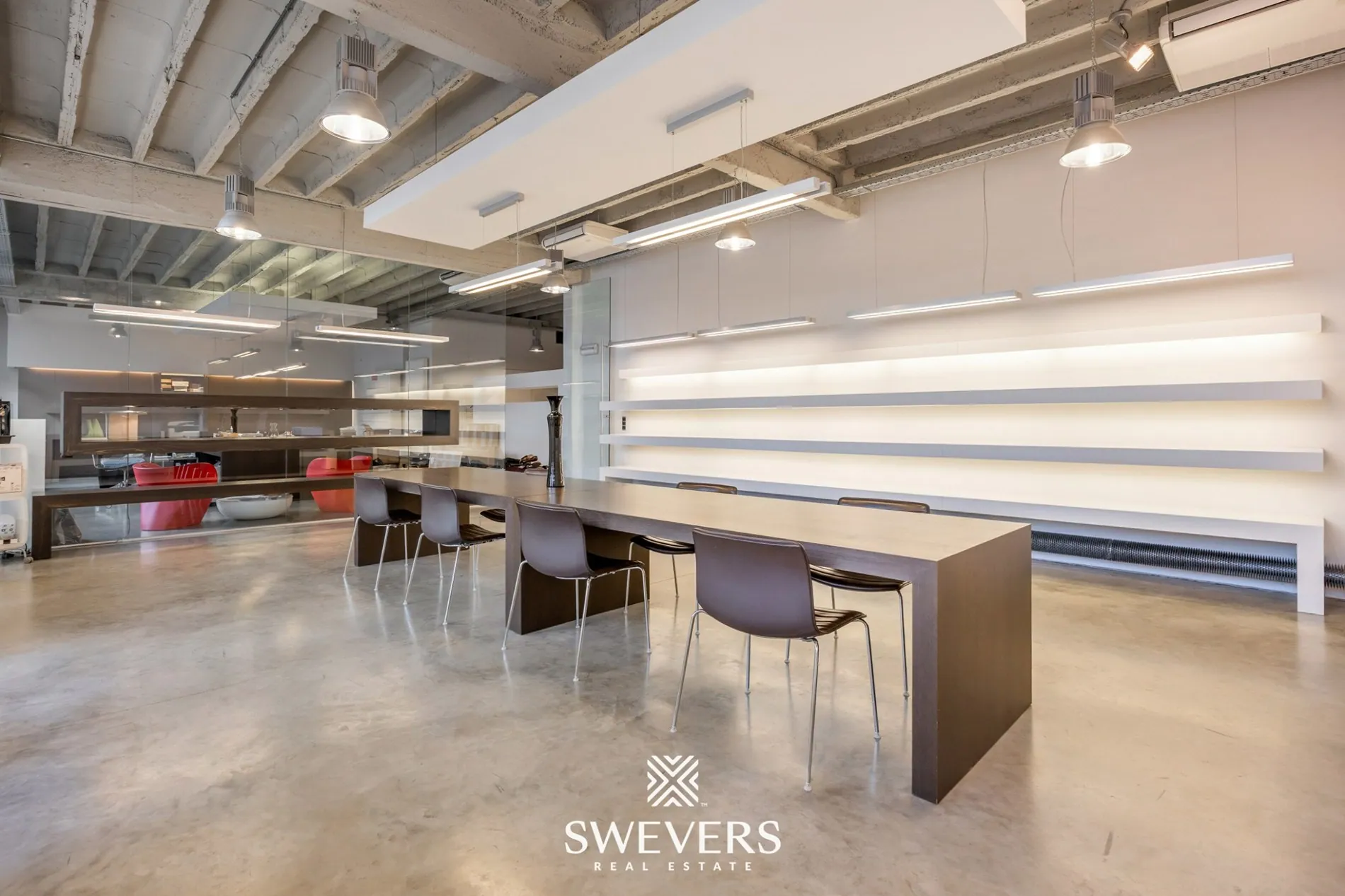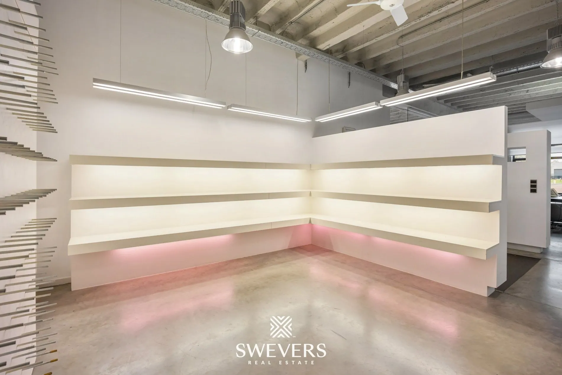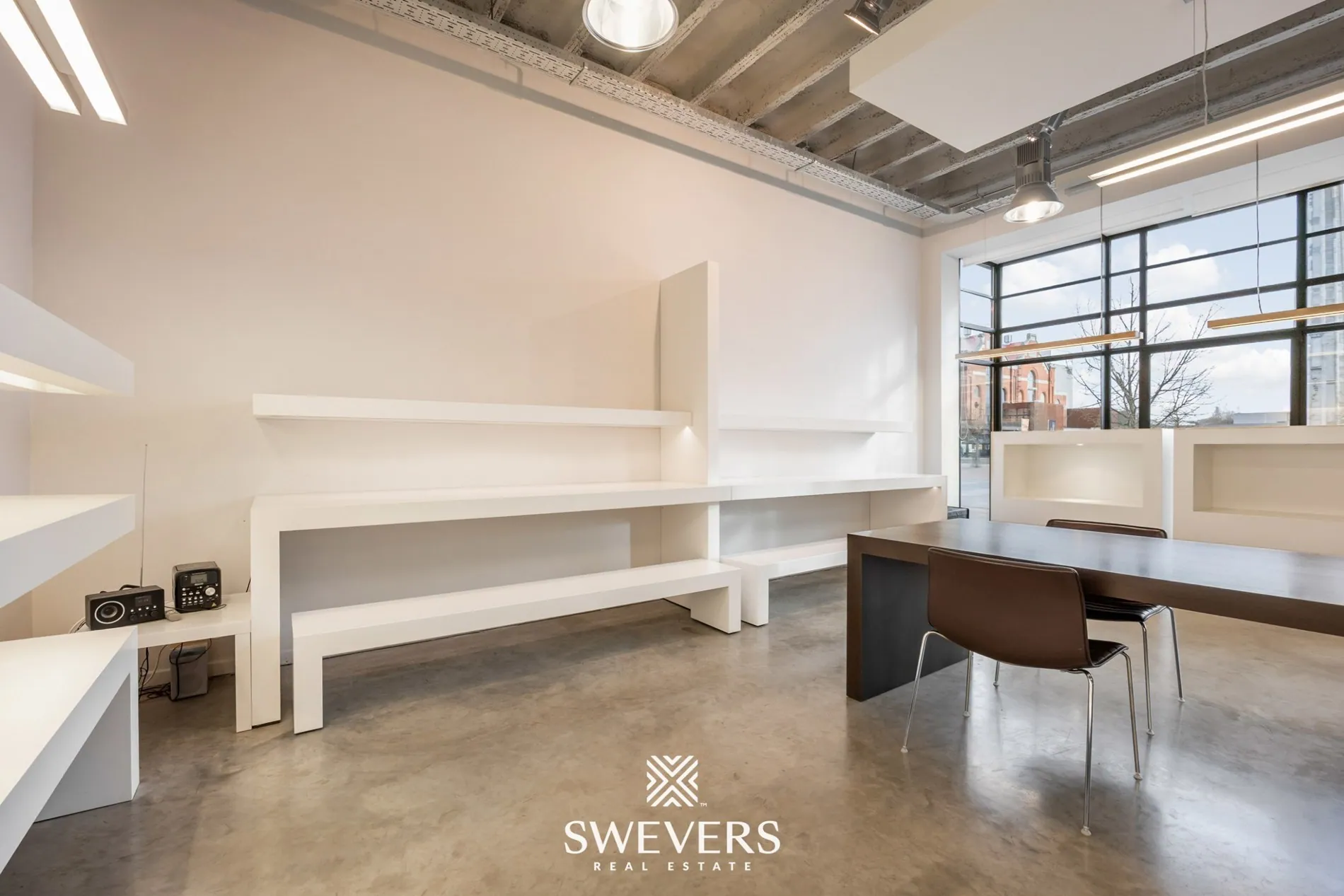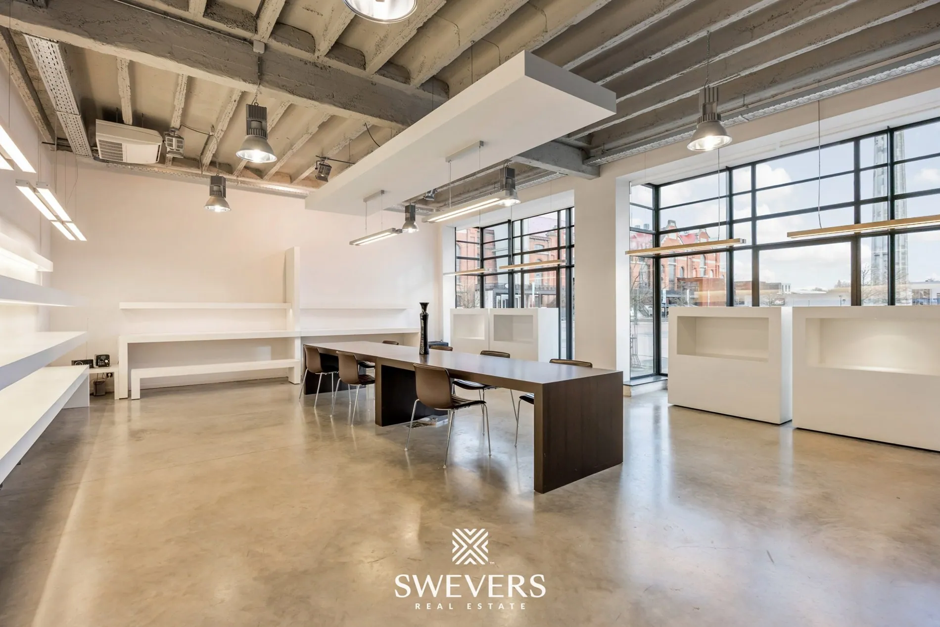 Bij het betreden van de ruimte valt meteen de moderne, industriële en tegelijk luxueuze afwerking op. Hoge plafonds, strakke lijnen en een overvloed aan natuurlijk licht zorgen voor een open en professionele sfeer. De grote raampartijen bieden niet alleen een prachtig zicht op het plein, maar versterken ook de connectie met de levendige omgeving. Hier voelt werken, ontvangen en ondernemen vanzelfsprekend aan.
