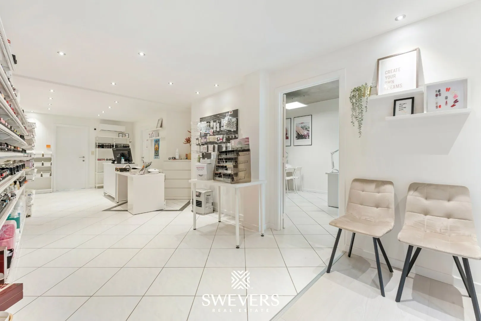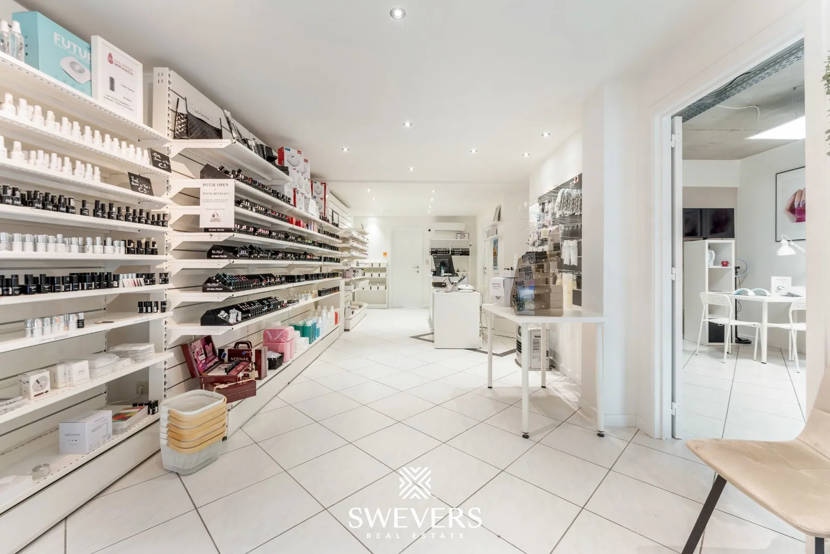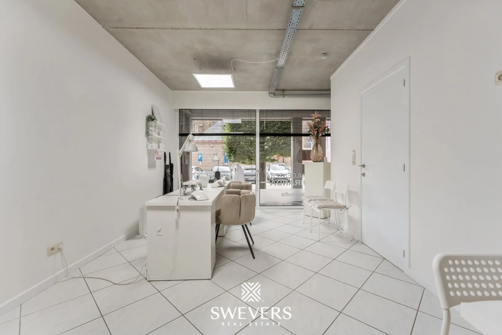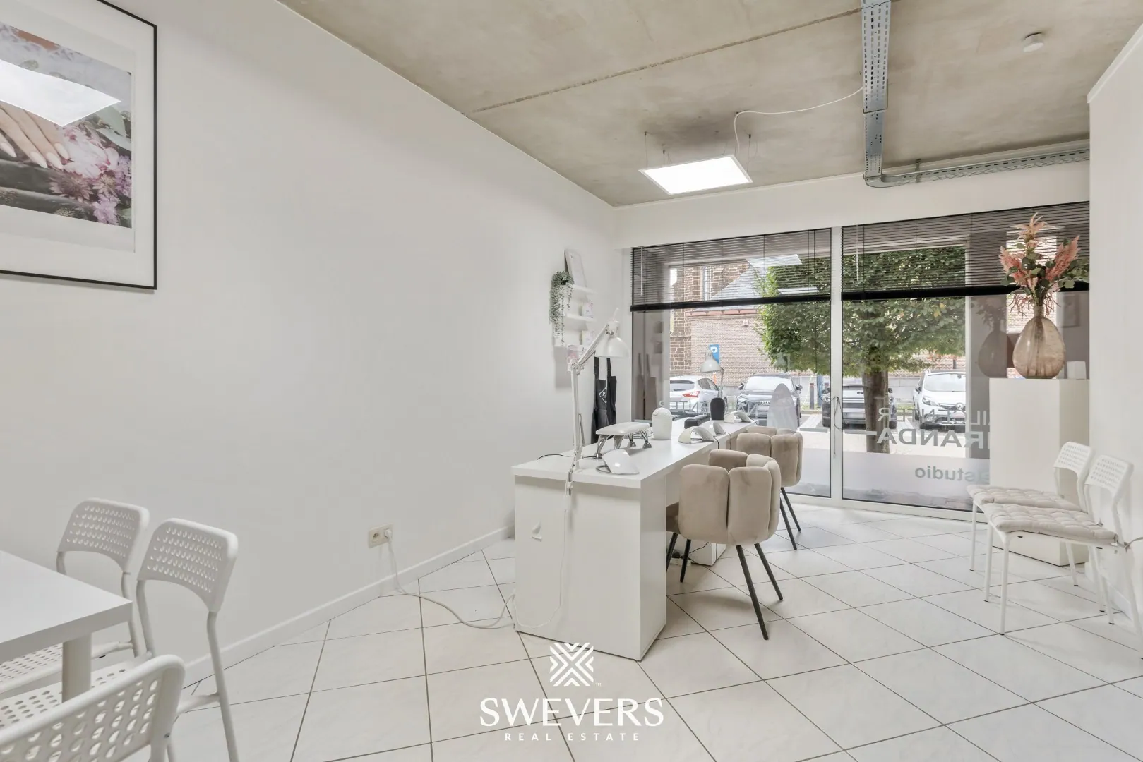 De indeling is helder en logisch opgebouwd. Je komt onmiddellijk in de ruime winkelruimte van 34 m². Dankzij de grote raampartijen baadt deze zone in natuurlijk licht, wat bijdraagt aan een uitnodigende sfeer. Deze ruimte vormt het hart van de zaak en kan perfect dienen als ontvangstruimte of showroom, afhankelijk van jouw noden.