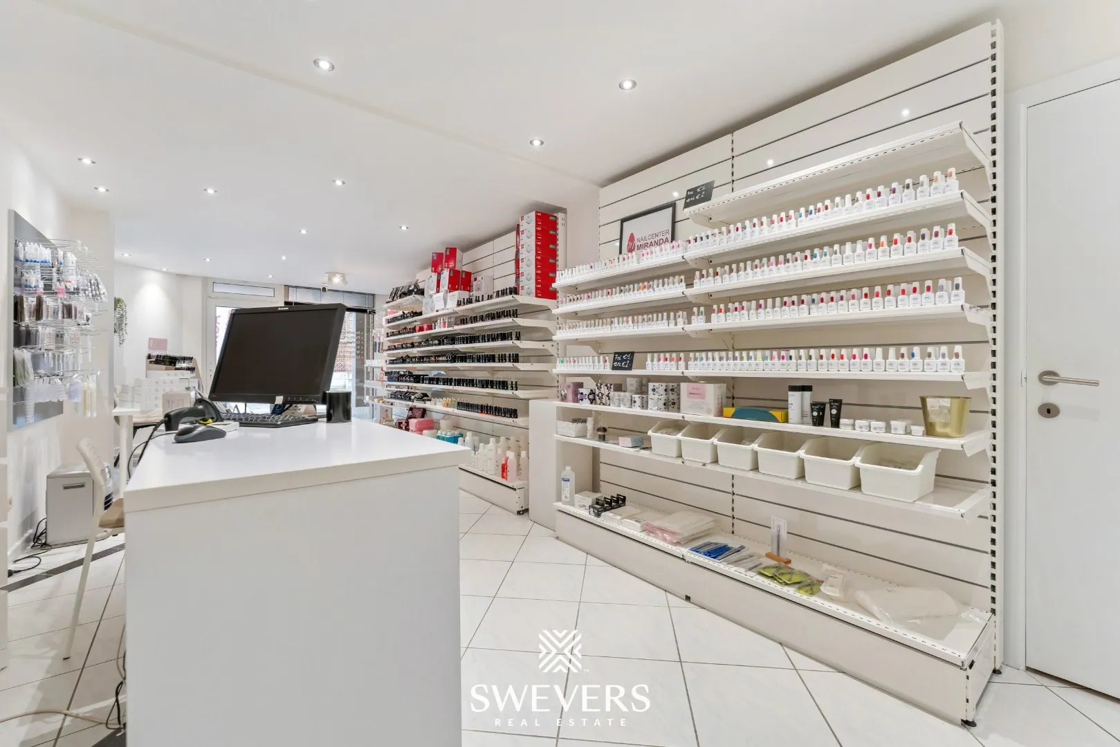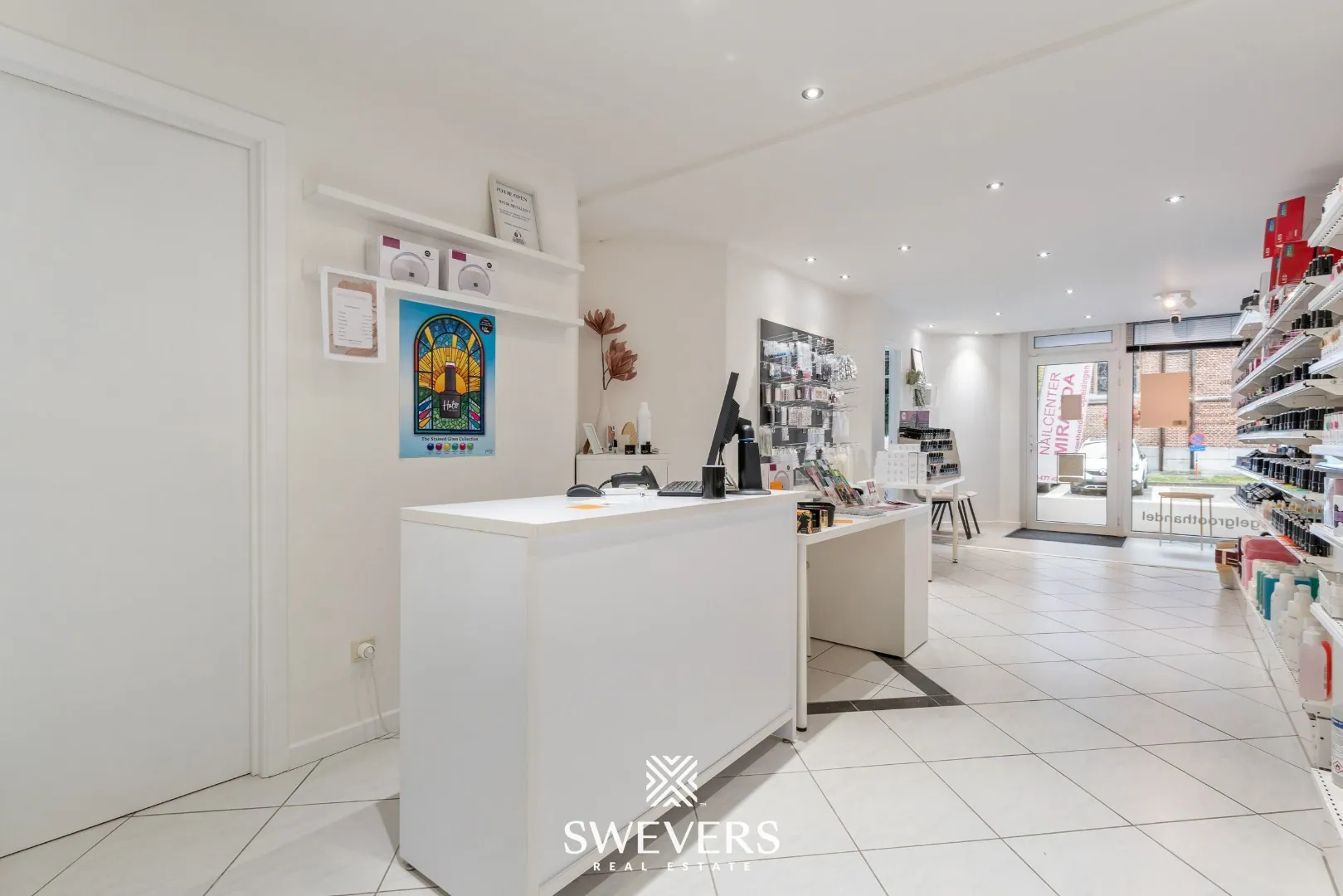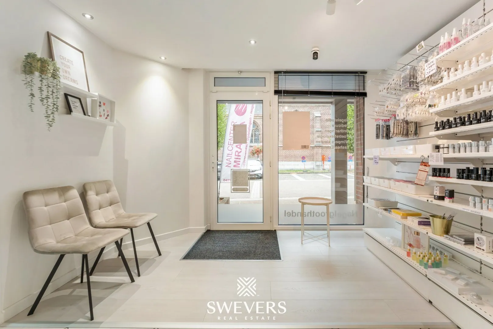 De indeling is helder en logisch opgebouwd. Je komt onmiddellijk in de ruime winkelruimte van 34 m². Dankzij de grote raampartijen baadt deze zone in natuurlijk licht, wat bijdraagt aan een uitnodigende sfeer. Deze ruimte vormt het hart van de zaak en kan perfect dienen als ontvangstruimte of showroom, afhankelijk van jouw noden.