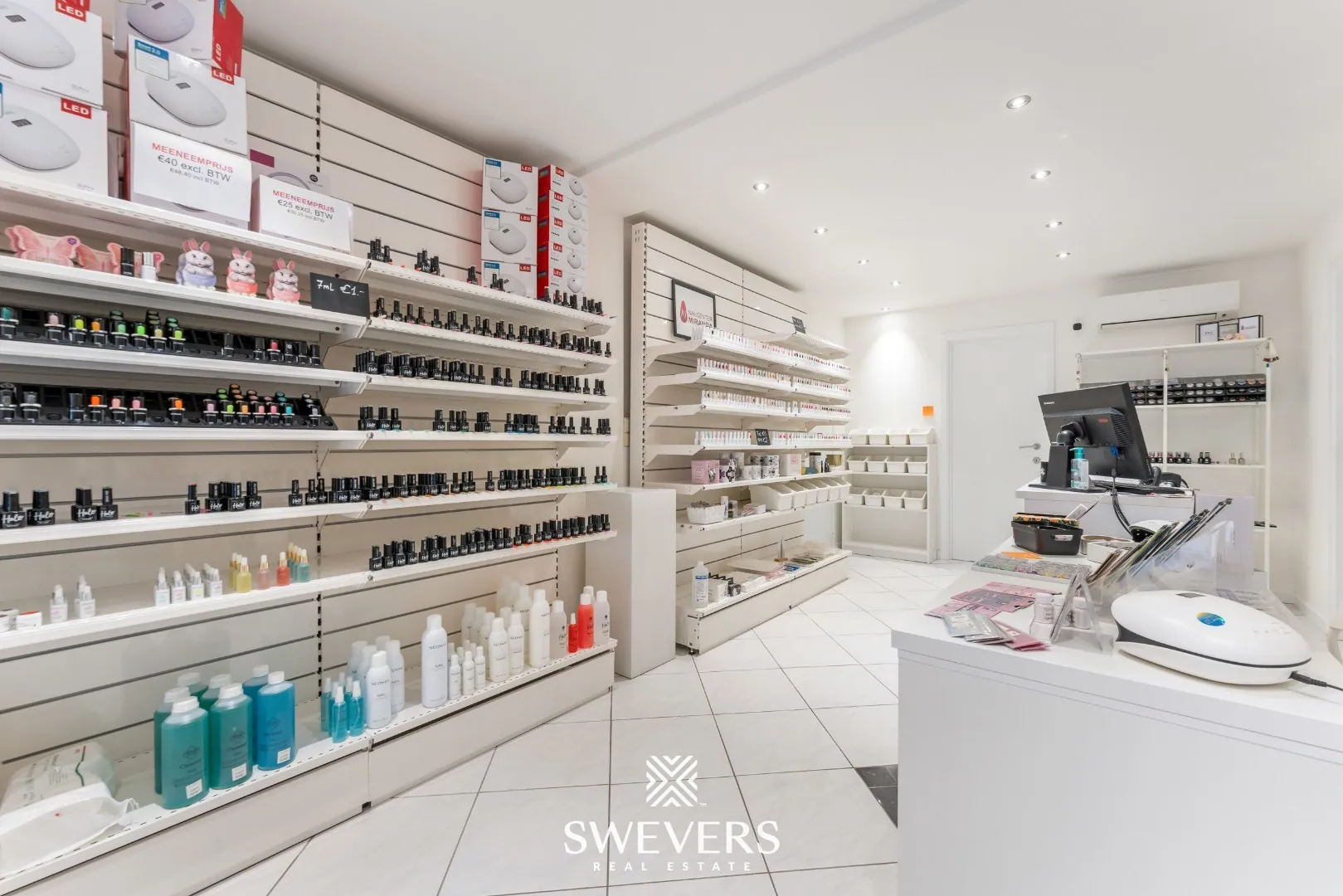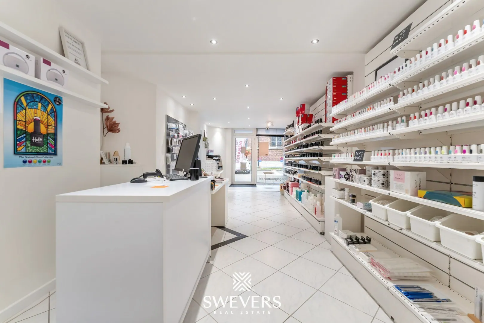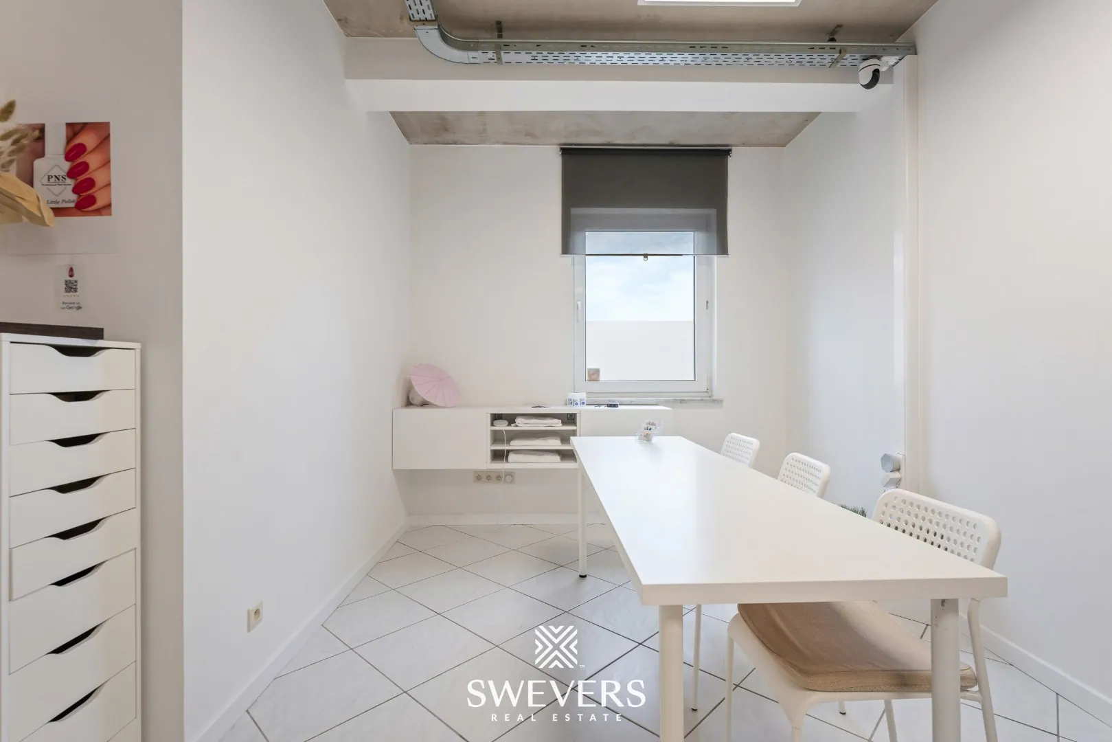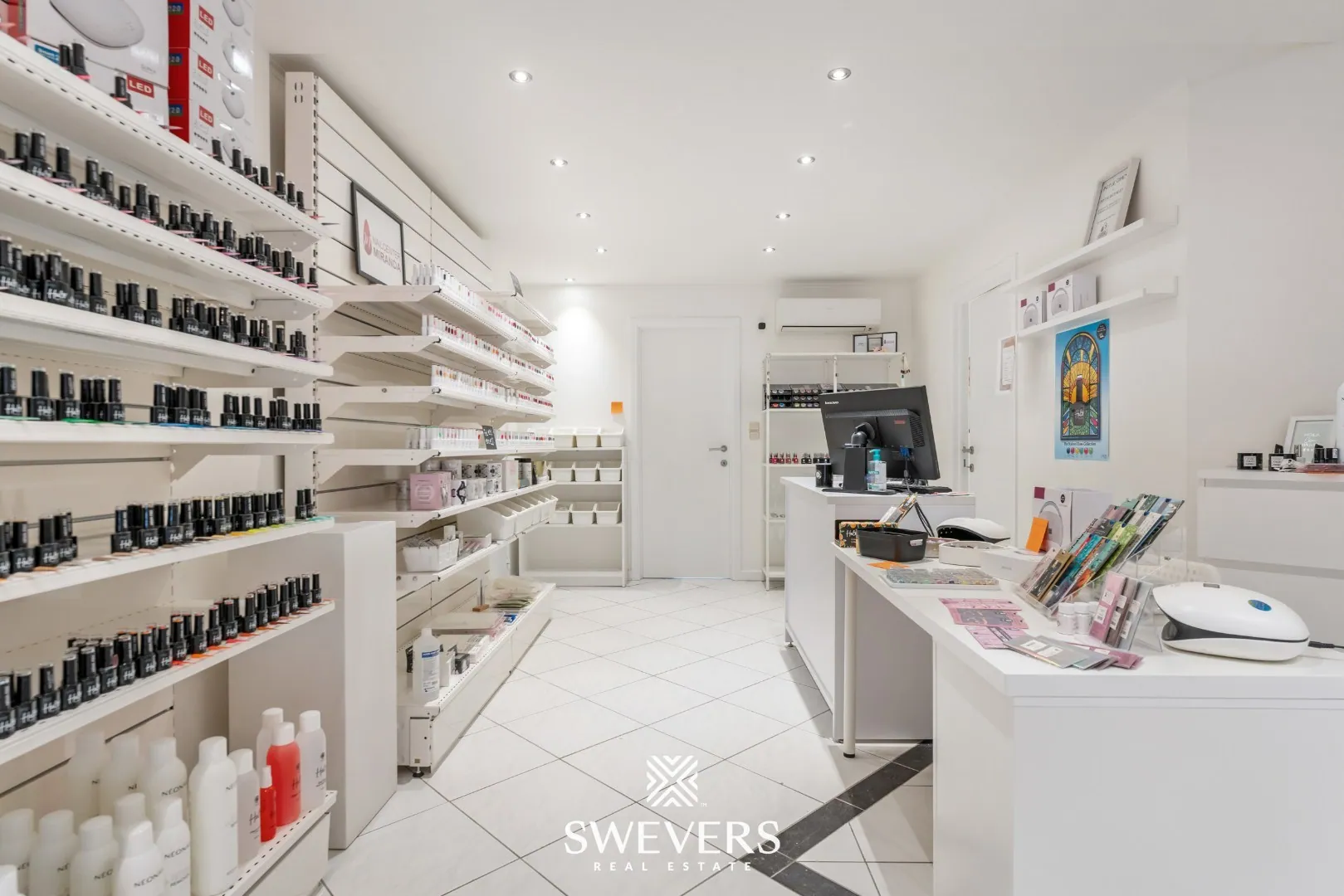 De indeling is helder en logisch opgebouwd. Je komt onmiddellijk in de ruime winkelruimte van 34 m². Dankzij de grote raampartijen baadt deze zone in natuurlijk licht, wat bijdraagt aan een uitnodigende sfeer. Deze ruimte vormt het hart van de zaak en kan perfect dienen als ontvangstruimte of showroom, afhankelijk van jouw noden.