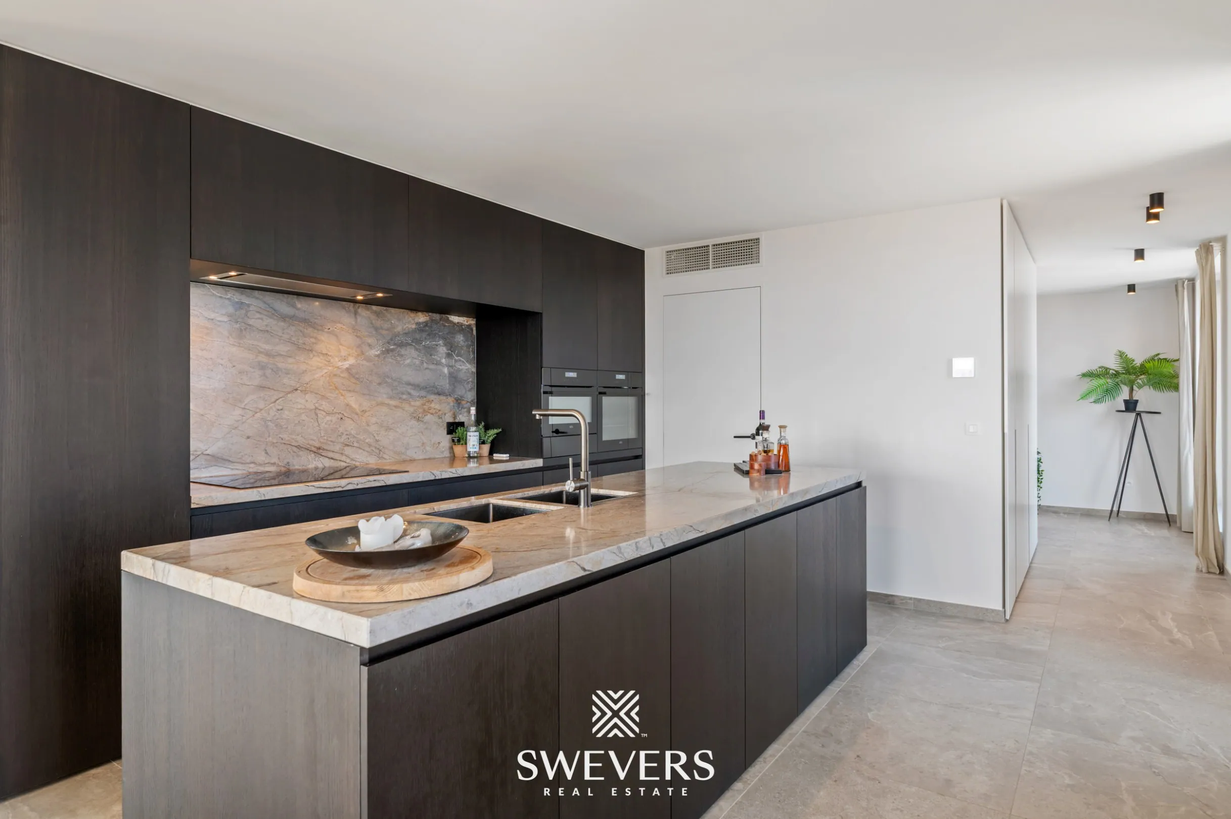 werd gekozen voor maatwerk, wat zorgt voor een coherent geheel en een efficiënte benutting van de beschikbare ruimte. De gebruikte materialen zoals houtfineer en natuursteen zijn hoogkwalitatief en sluiten aan bij een hedendaagse, luxueuze afwerking.