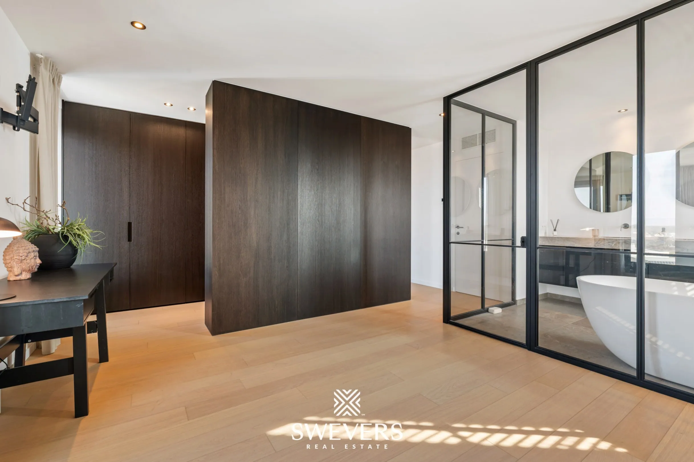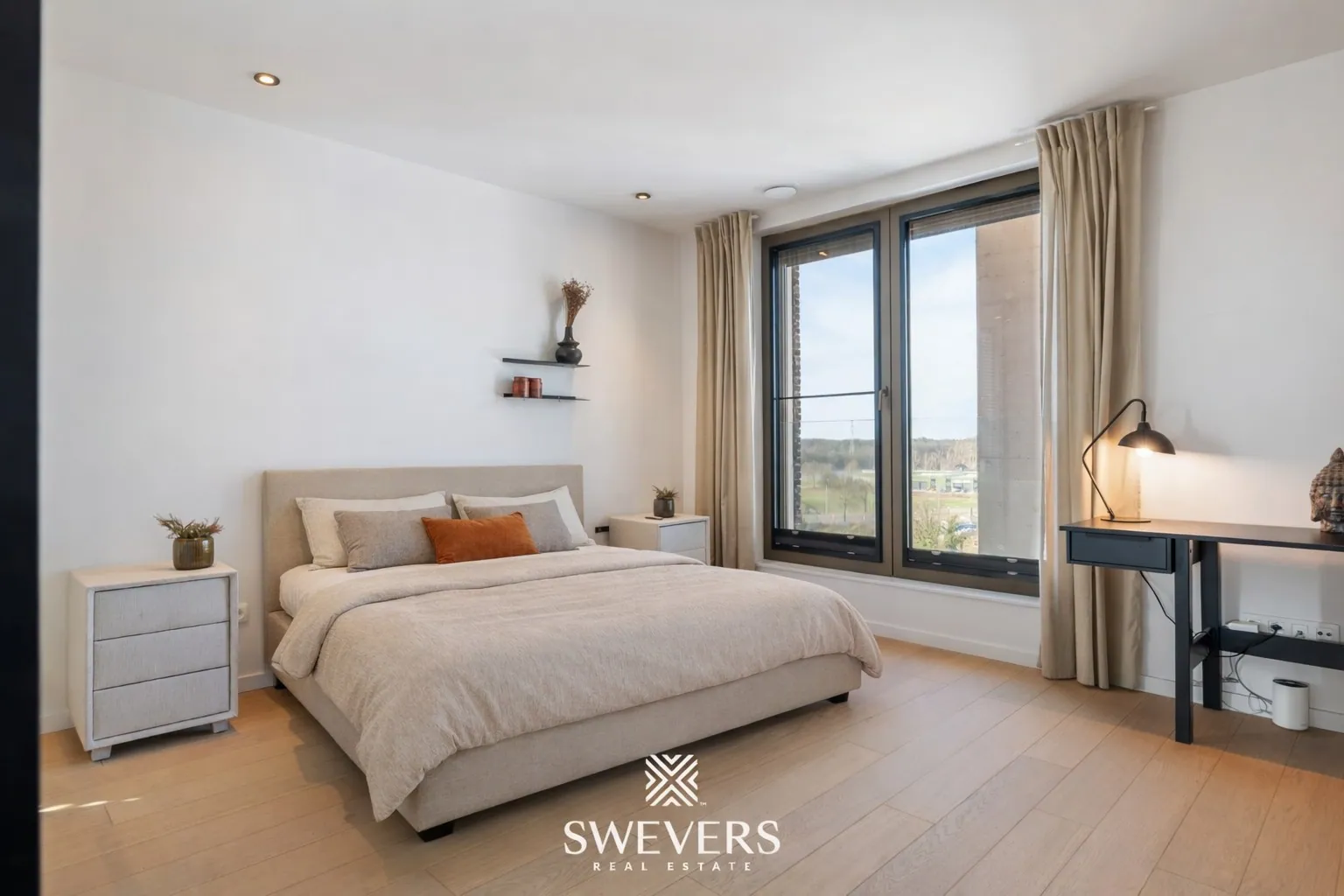 Het appartement beschikt over twee ruime slaapkamers van respectievelijk 26,67 m² en 20,10 m², elk met zijn eigen ensuite badkamer en ingebouwde dressing. Naast de reeds ingerichte bureauruimte is het mogelijk om binnen het appartement een tweede bureauruimte te creëren, wat het geheel bijzonder geschikt maakt voor wie regelmatig van thuis uit werkt.