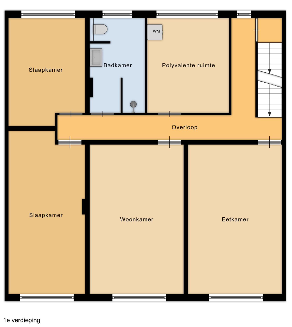 Op de eerste verdieping bevindt zich het woongedeelte, bereikbaar via een aparte trap vanuit de frituur. Dit appartement biedt veel leefruimte, met een ruime woonkamer en een aparte eetkamer, beide voorzien van grote raampartijen die voor veel natuurlijk licht zorgen. De verdieping beschikt over twee comfortabele slaapkamers en een polyvalente ruimte die kan dienen als extra slaapkamer, kantoor of hobbykamer. De badkamer is functioneel ingericht en biedt alle nodige comfort.