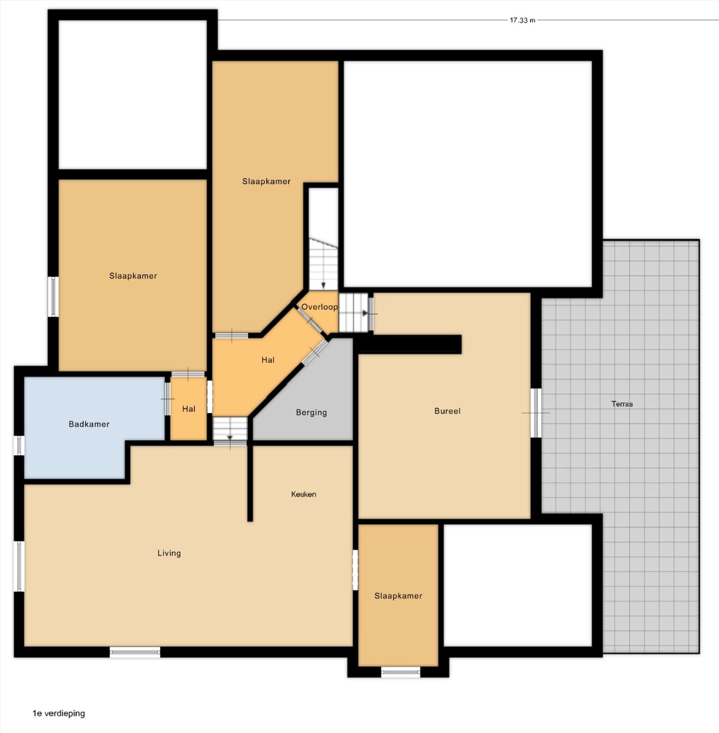 De eerste verdieping beschikt bovendien over een terras, toegankelijk vanuit het woongedeelte. Dit biedt een aangename buitenruimte met voldoende privacy. Een berging zorgt voor extra opslagmogelijkheden en een logische indeling van de verdieping.