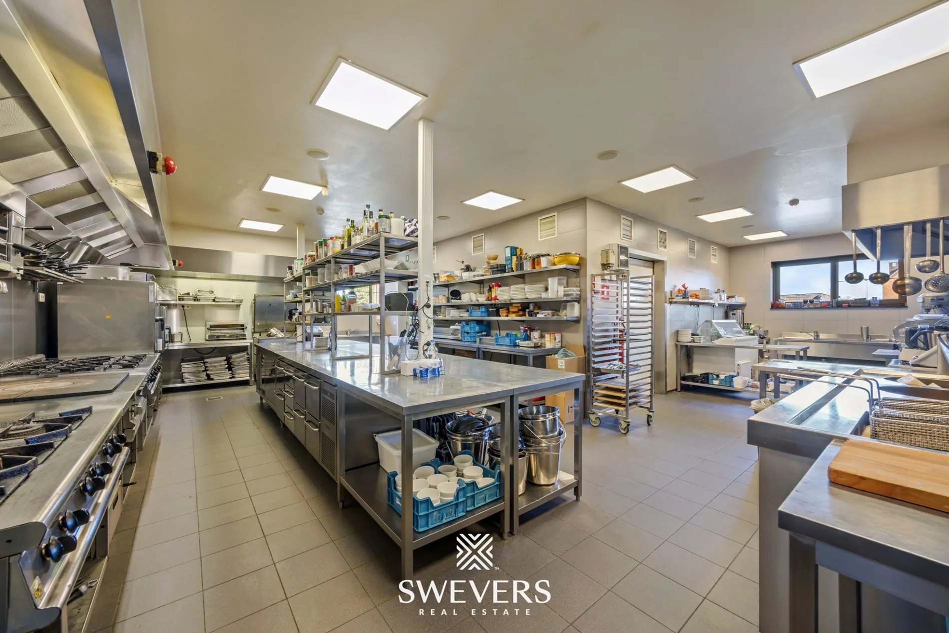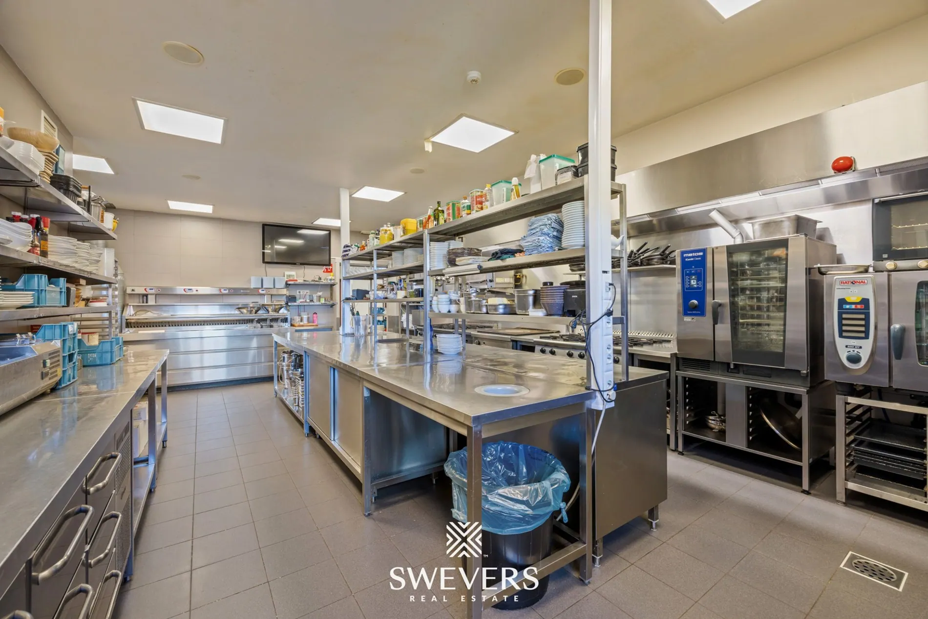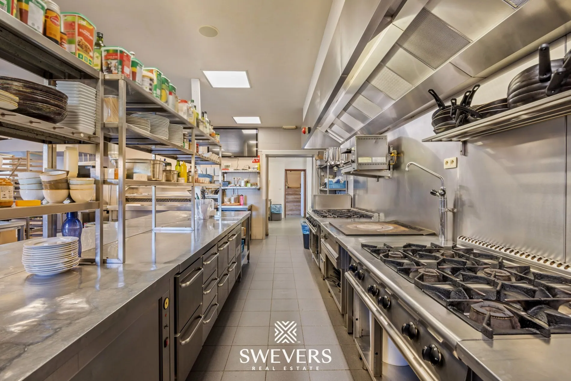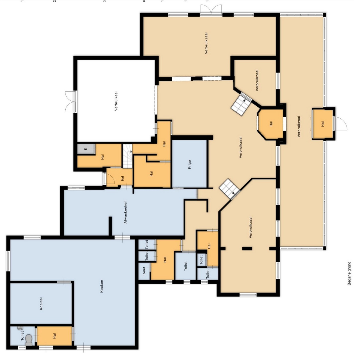 Op het gelijkvloers bevindt zich de handelszaak, momenteel ingericht voor horecadoeleinden. De inkom leidt naar verschillende verbruikszalen die flexibel inzetbaar zijn. De grootste handelsruimte bedraagt circa 170 m² en sluit logisch aan op andere zithoeken en circulatieruimtes. Achterliggend bevindt zich een ruime keuken van ongeveer 108 m², aangevuld met een afwaskeuken en meerdere koelruimtes. Verder zijn er talrijke sanitaire voorzieningen, verspreid over de verdieping, wat het pand geschikt maakt voor grotere bezoekersaantallen.