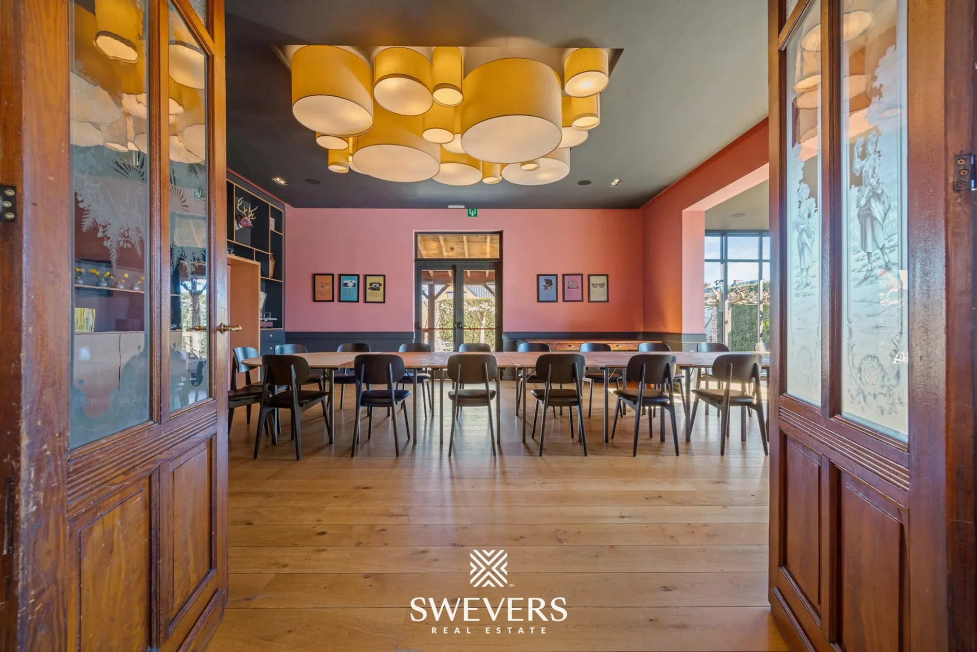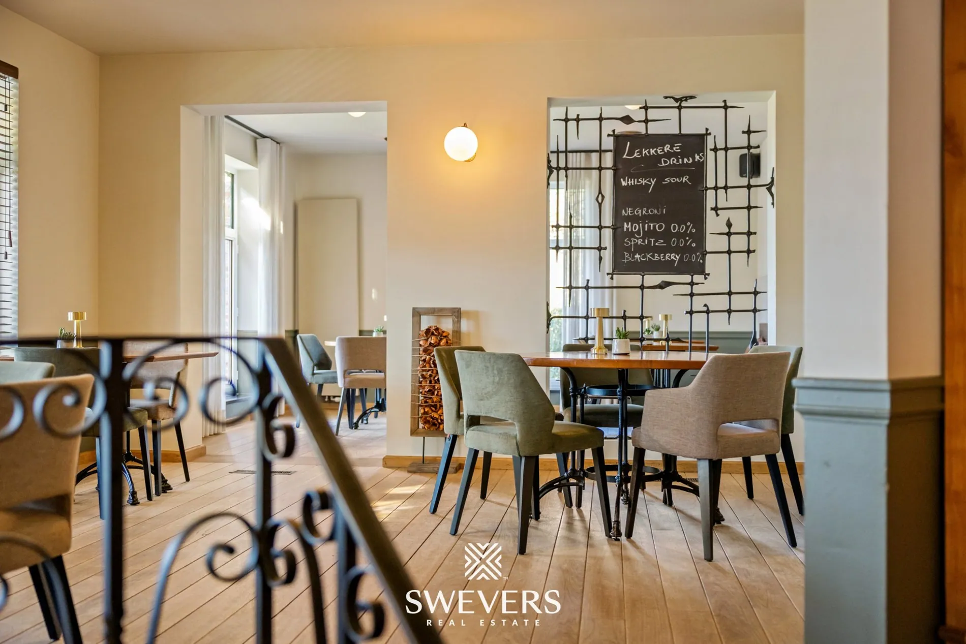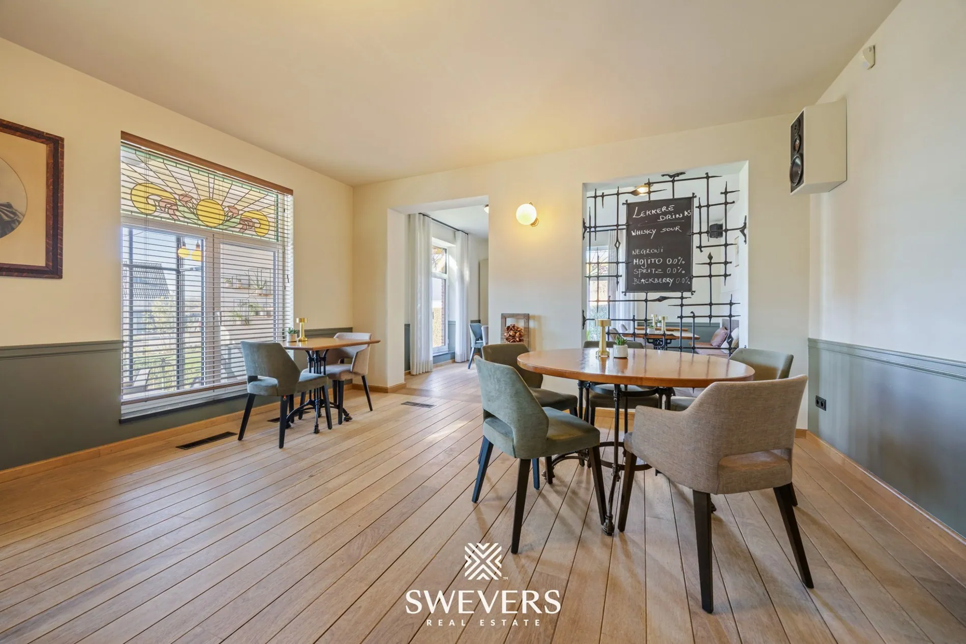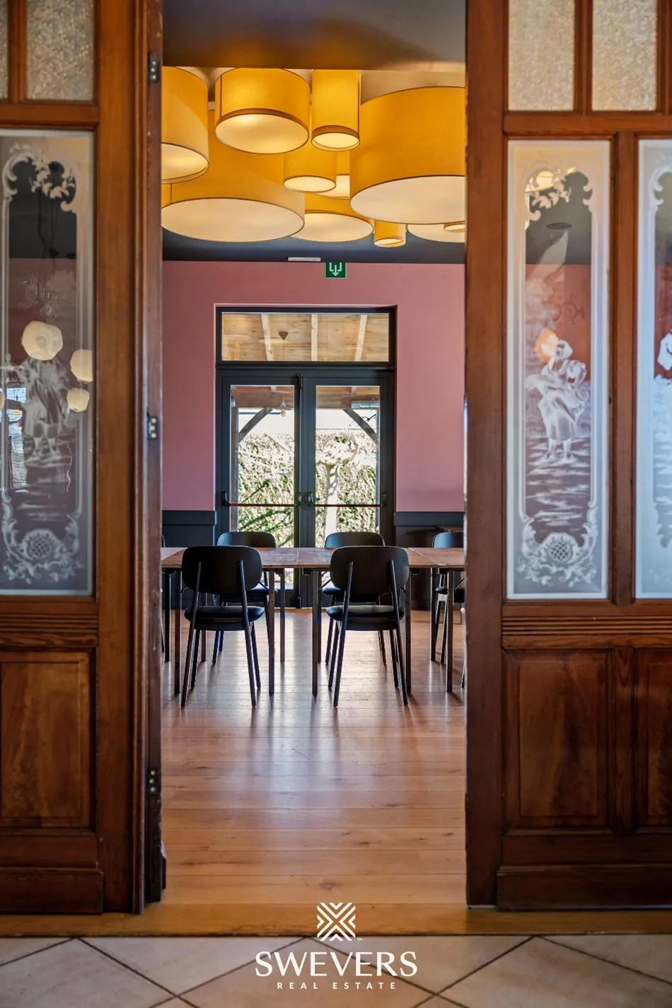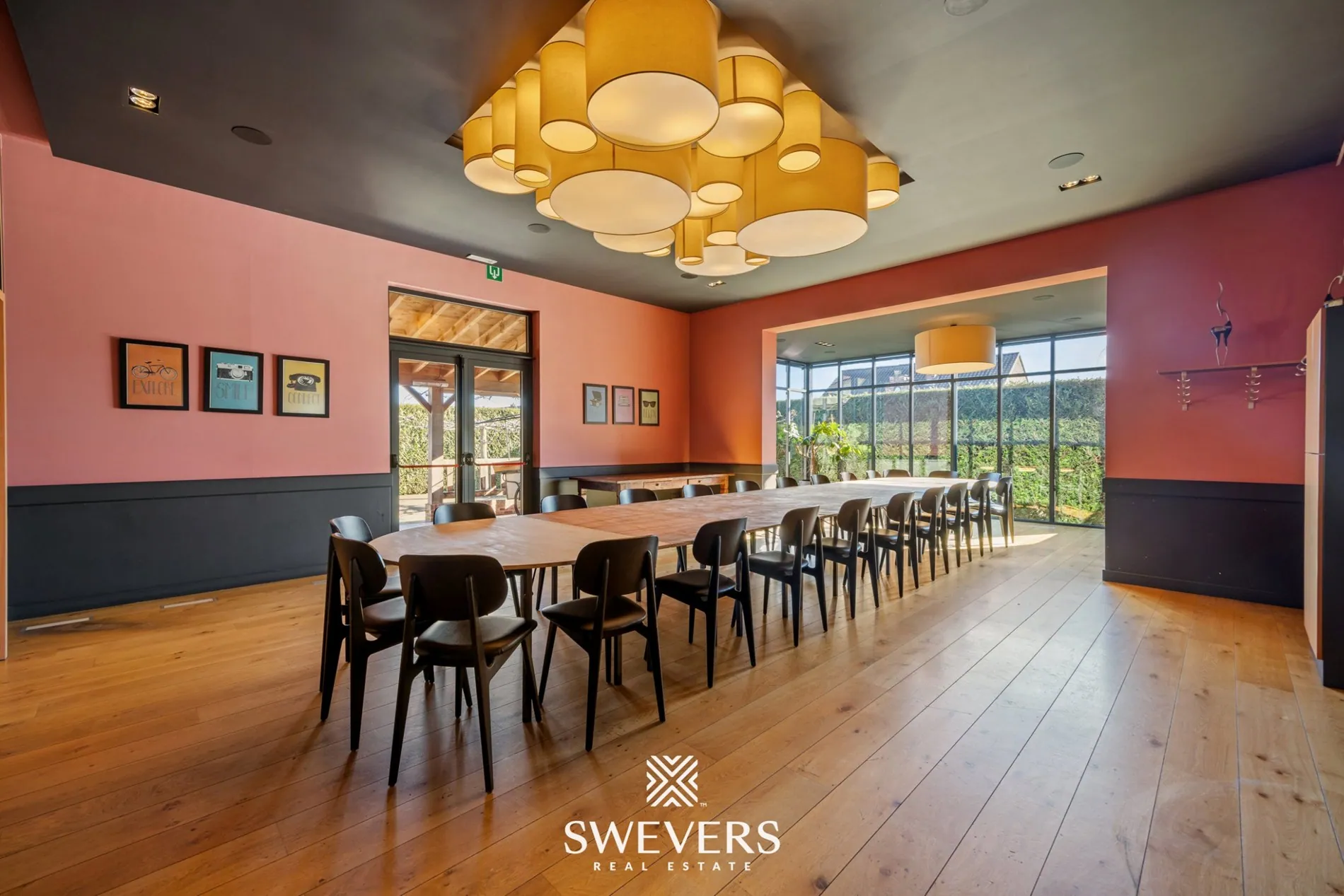 De indeling op het gelijkvloers laat een vlotte werking toe. De verschillende zalen kunnen afzonderlijk of samen gebruikt worden. Een aparte vergaderzaal van 46,97 m² biedt bijkomende mogelijkheden voor events of professionele bijeenkomsten. De orangerie van 66,86 m², vernieuwd in 2014, zorgt voor een aangename lichtinval en vormt een aantrekkelijke uitbreiding van de commerciële ruimte.