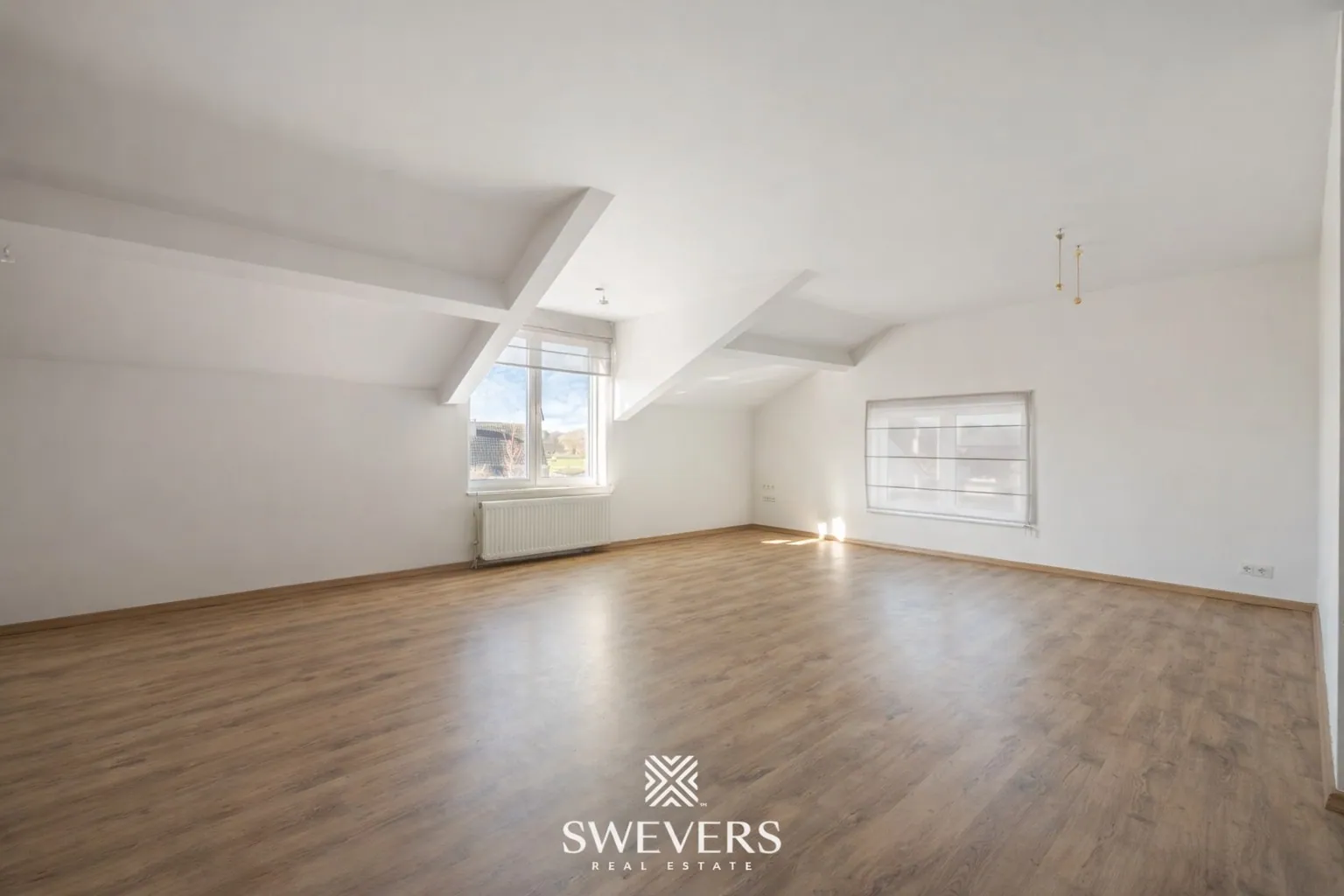 Op de eerste verdieping bevindt zich het woongedeelte. De leefruimte van 34,29 m² sluit aan op een aparte keuken van 16,96 m². Verder zijn er drie slaapkamers met oppervlaktes van 35,56 m², 26,20 m² en 9,51 m². Aansluitend is er een ruime dressing van 15,15 m². De badkamer is centraal gelegen en praktisch ingericht. Daarnaast is er een bureau aanwezig, ideaal voor thuiswerk of administratie.