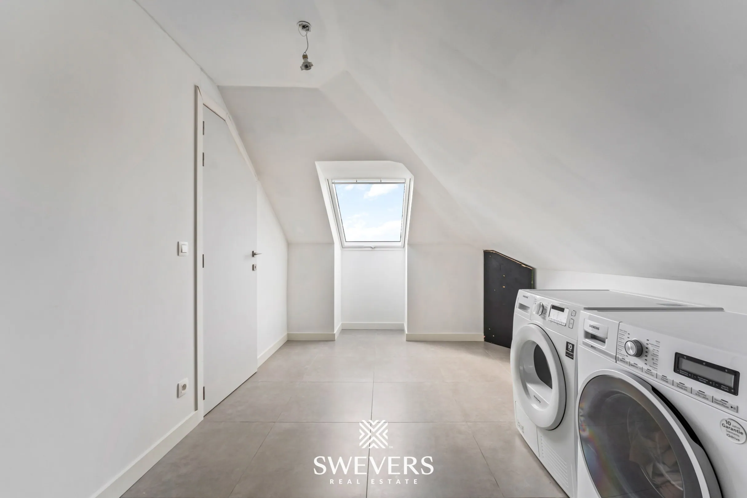 De tweede verdieping voegt nog extra functionaliteit toe aan de woning. Hier bevindt zich een vijfde slaapkamer van ongeveer 22,5 m². Deze ruimte kan perfect dienen als logeerkamer, hobbyruimte of extra werkplek. Verder is er een ruime wasruimte voorzien. De overloop verbindt de verschillende ruimtes en zorgt voor een logische indeling van deze verdieping.
