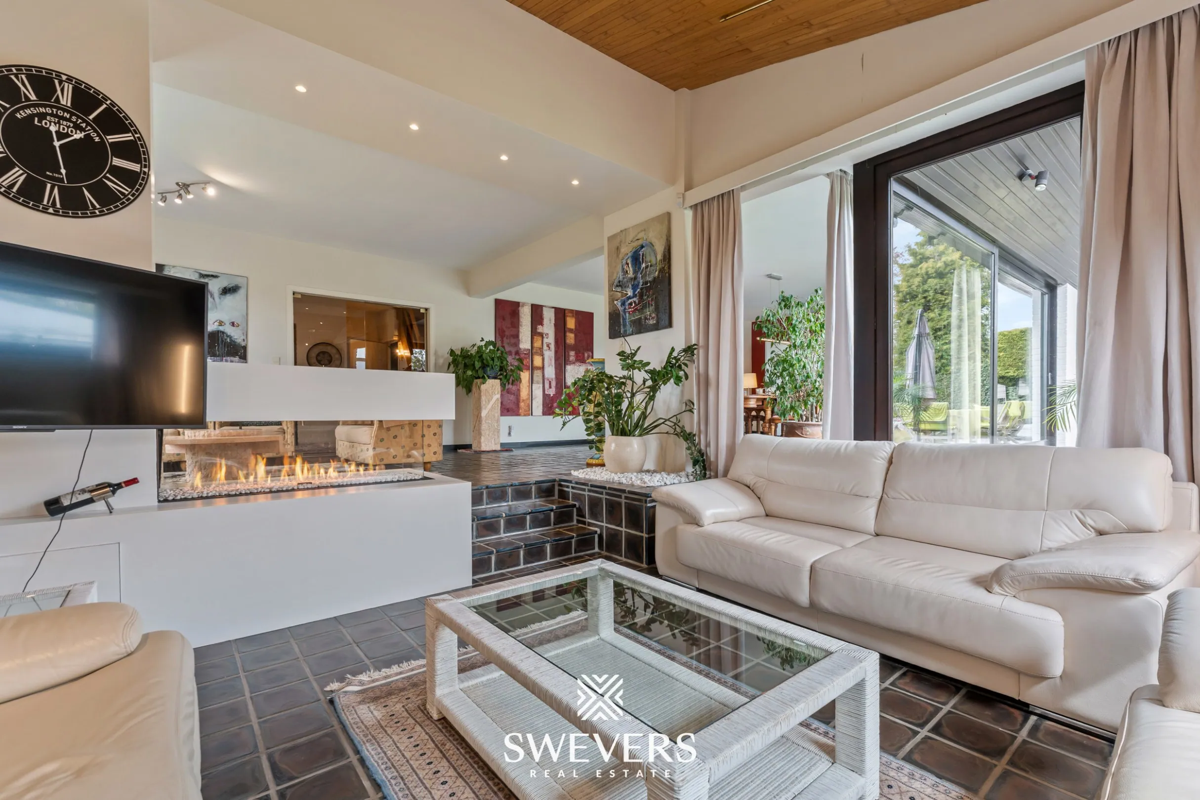 Bij het betreden van de gelijkvloerse verdieping komt men in een inkomhal die toegang geeft tot de verschillende leefruimtes. De woonkamer van 33 m² sluit aan op een gezellige haardhoek en een barhoek, wat zorgt voor een aangename en uitnodigende leefomgeving. De keuken van 26 m² biedt voldoende plaats voor dagelijks gebruik en kan eenvoudig aangepast worden naar eigen smaak. Aansluitend bevindt zich een ruime eetkamer van 37 m², ideaal voor grotere gezelschappen.