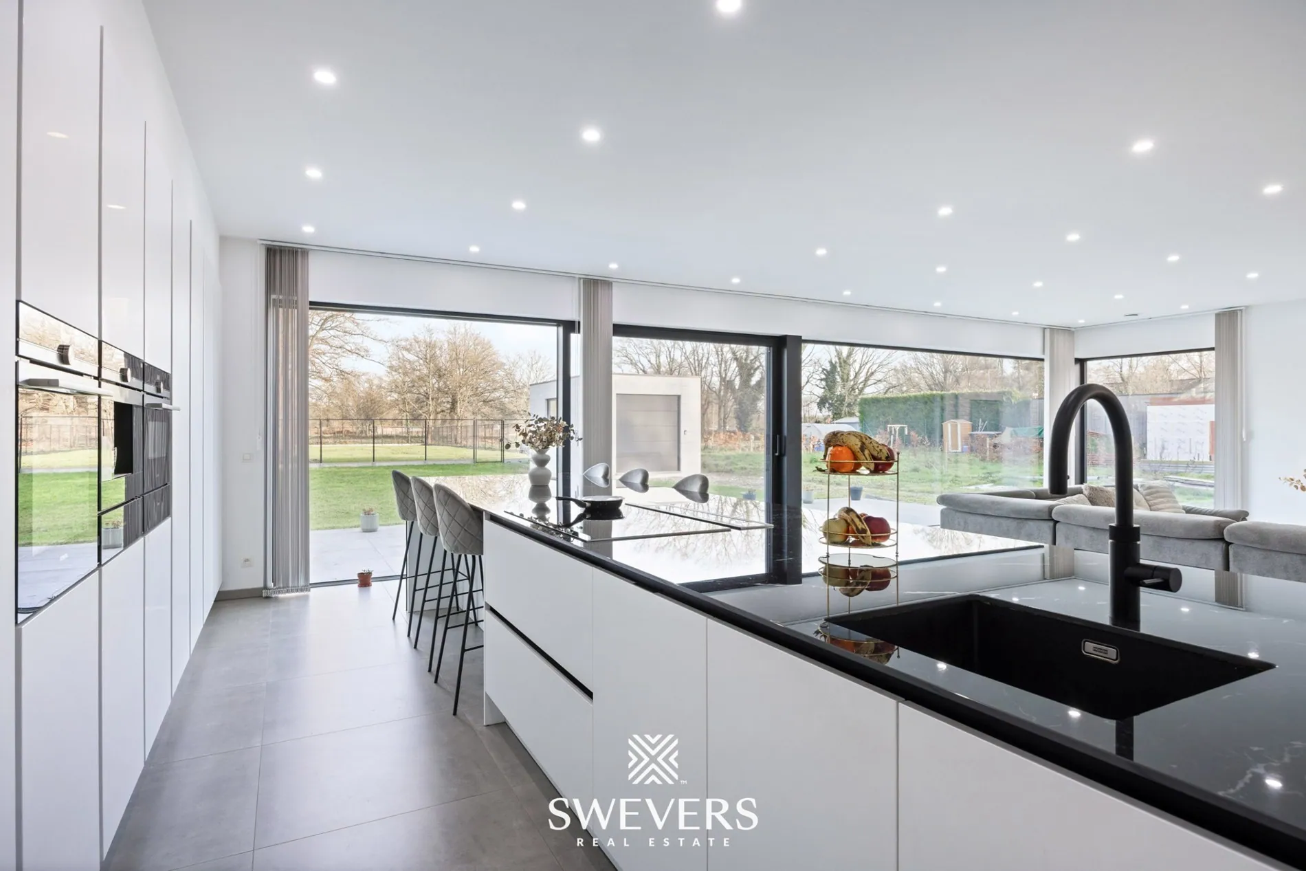Aansluitend vindt u de luxueus ingerichte open keuken (27,44 m²), volledig uitgerust met hoogwaardige toestellen, een ingebouwde dampkap en een praktische cookerkraan. Dit is dé plek waar koken en gezelligheid samenkomen. Of u nu gasten ontvangt of geniet van een rustig ontbijt met zicht op de tuin, deze keuken nodigt uit tot leven en beleving.