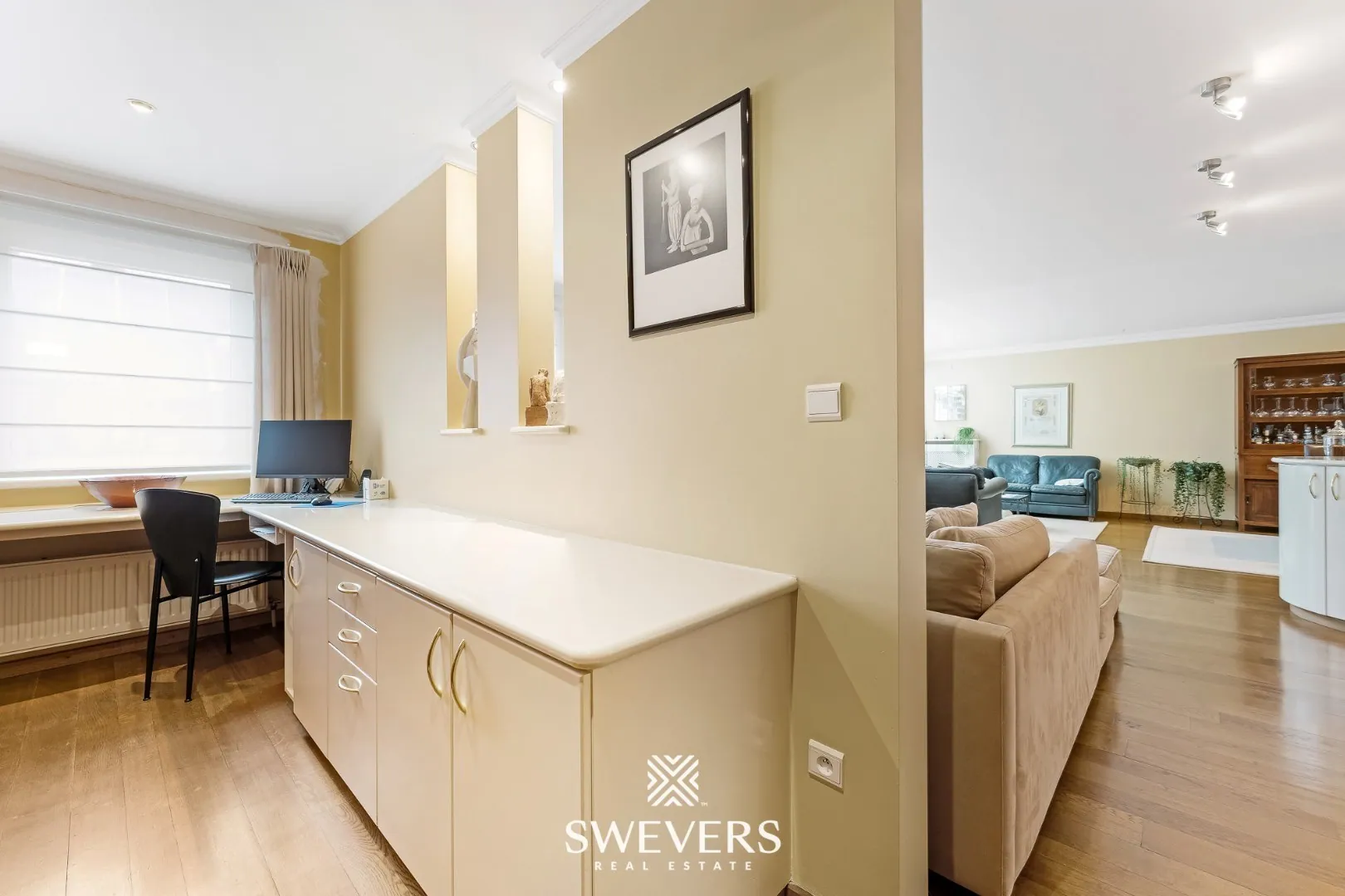 Op de eerste verdieping bevindt zich de riante woonkamer van 54,19 m², waar een overvloed aan natuurlijk licht naar binnen stroomt dankzij de grote ramen. Deze ruimte leent zich perfect voor ontspanning en gezellige avonden. De vide die door de drie verdiepingen heen loopt, zorgt voor een open en ruimtelijk gevoel. Verder vind je op deze verdieping nog een apart toilet, een bureau dat ideaal is voor thuiswerk, en een extra berging. De bijkeuken biedt extra opbergruimte en is praktisch ingericht. Het grote dakterras is een absoluut pluspunt en biedt een prachtig uitzicht over de omgeving.